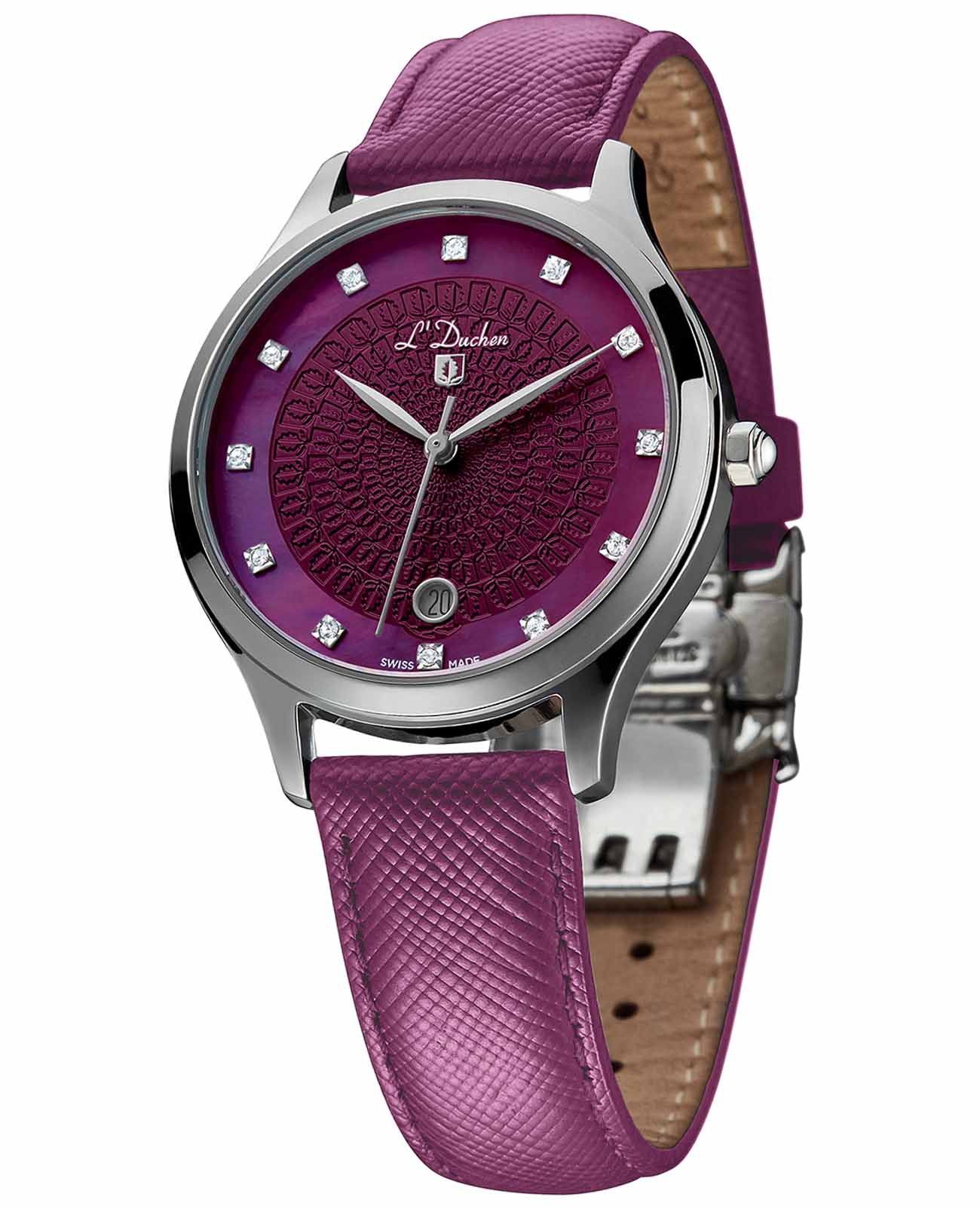 Женские швейцарские часы L'Duchen Grace D 791.19.30, кварцевый механизм с высокой точностью. Сапфировое стеклоСапфировое стеклоПрочный и надёжный материал из кристалла сапфира синтетического происхождения, характеризующийся особой твёрдостью и устойчивостью к царапинам и повреждениям. устойчивое к появлению царапин, обладающее высокой прозрачностью. Корпус часов выполнен из нержавеющей стали. Окошко даты находится в положении 6 часов. Класс водозащиты: 50 метров, позволит защитить корпус от случайных брызг или капель дождя. Кожаный ремешок на застёжке «бабочка» с кнопкамиЗастёжка "бабочка"Такой вид застёжки дополняется предохранителями, помогающими избежать случайного раскрытия браслета. Обладают изящным исполнением. .