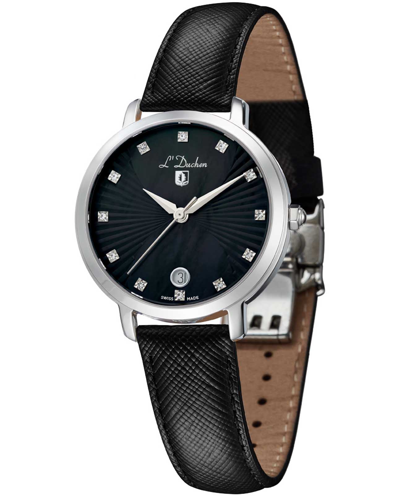 Женские швейцарские часы L'Duchen Eternity D 801.11.31, кварцевый механизм с высокой точностью. Сапфировое стеклоСапфировое стеклоПрочный и надёжный материал из кристалла сапфира синтетического происхождения, характеризующийся особой твёрдостью и устойчивостью к царапинам и повреждениям. устойчивое к появлению царапин, обладающее высокой прозрачностью. Корпус часов выполнен из нержавеющей стали. Окошко даты находится в положении 6 часов. Класс водозащиты: 50 метров, позволит защитить корпус от случайных брызг или капель дождя. Кожаный ремешок на застёжке «бабочка» с кнопкамиЗастёжка "бабочка"Такой вид застёжки дополняется предохранителями, помогающими избежать случайного раскрытия браслета. Обладают изящным исполнением. .