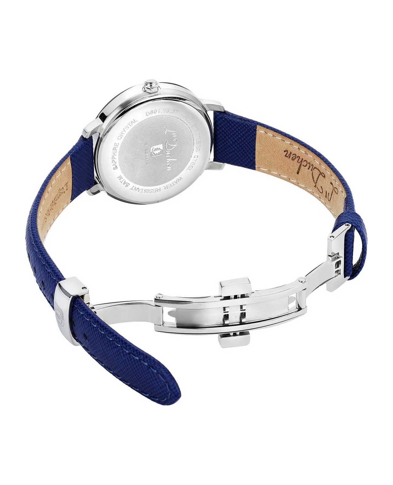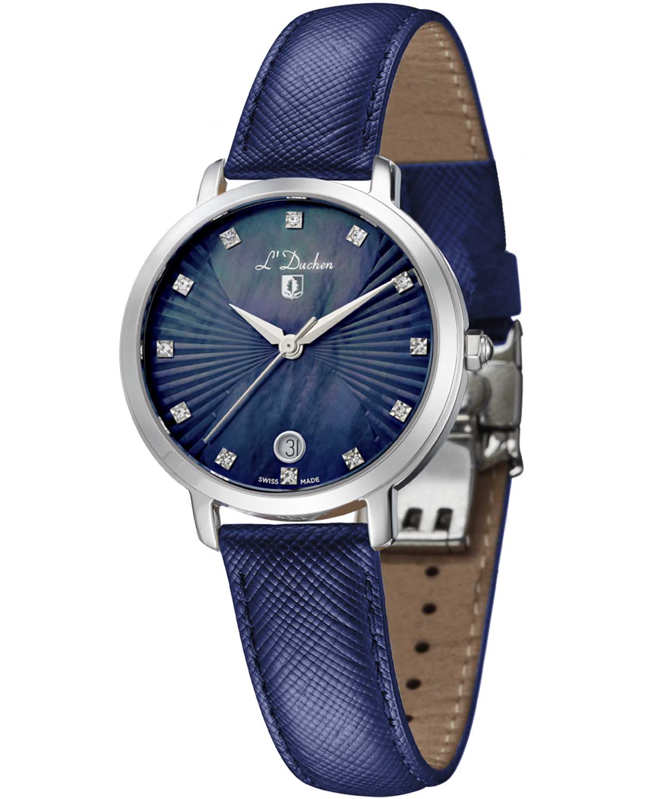 Женские швейцарские часы L'Duchen Eternity D 801.13.37, кварцевый механизм с высокой точностью. Сапфировое стеклоСапфировое стеклоПрочный и надёжный материал из кристалла сапфира синтетического происхождения, характеризующийся особой твёрдостью и устойчивостью к царапинам и повреждениям. устойчивое к появлению царапин, обладающее высокой прозрачностью. Корпус часов выполнен из нержавеющей стали. Окошко даты находится в положении 6 часов. Класс водозащиты: 50 метров, позволит защитить корпус от случайных брызг или капель дождя. Кожаный ремешок на застёжке «бабочка» с кнопкамиЗастёжка "бабочка"Такой вид застёжки дополняется предохранителями, помогающими избежать случайного раскрытия браслета. Обладают изящным исполнением. .