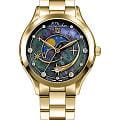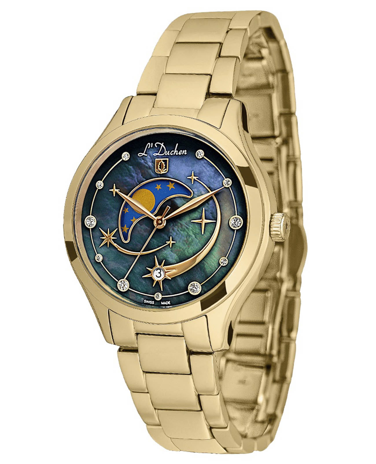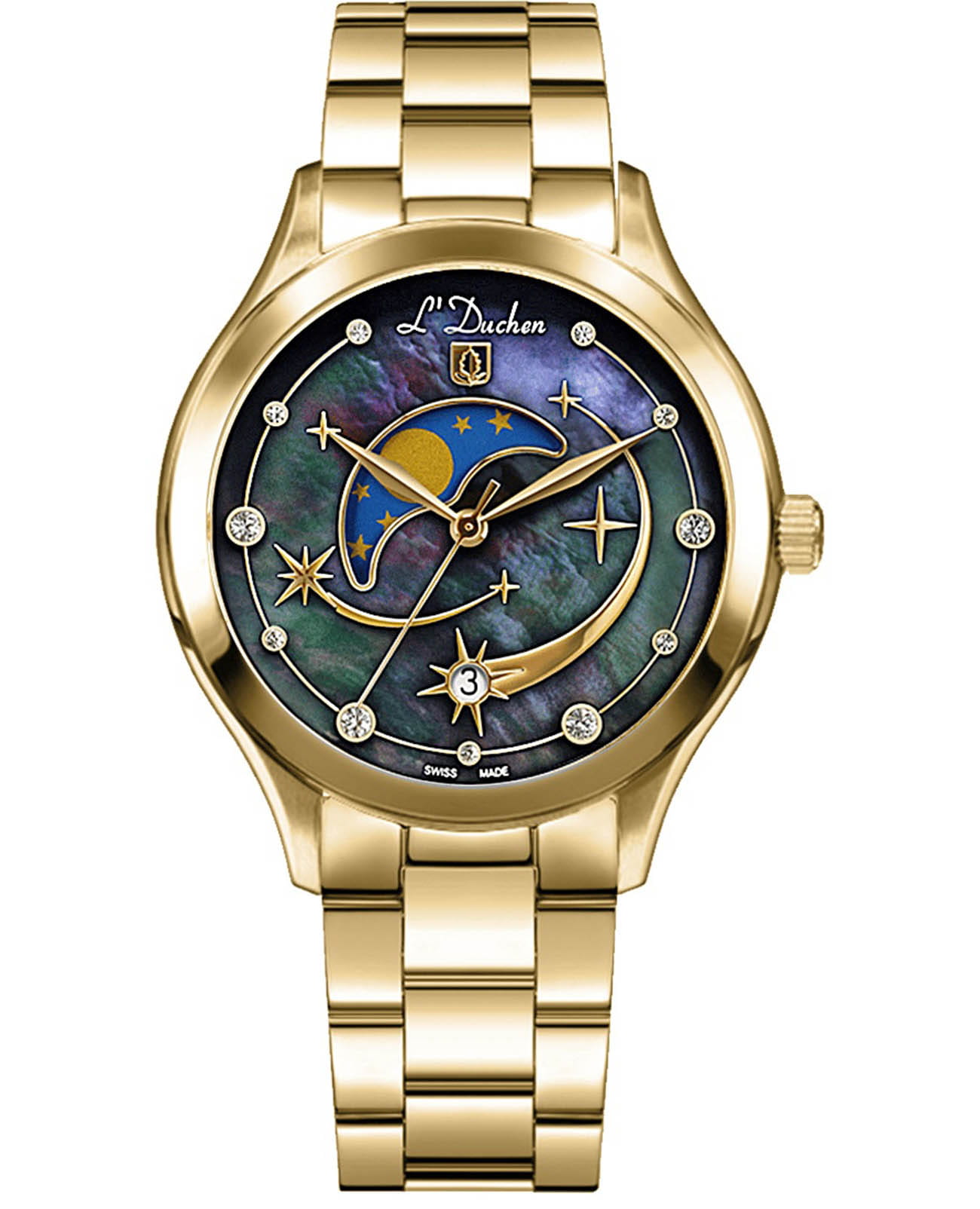 Женские кварцевые часы L'Duchen из коллекции Perseides — это воплощение роскоши и изысканности. Корпус диаметром 34 мм выполнен из нержавеющей стали 316L с PVD-покрытиемPVDУльтратонкое покрытие наносится в технике вакуумного напыления, сочетает в себе нитрид титана особой прочности со слоем золота или оксида хрома. Несёт в себе декоративную или защитную функцию. жёлтого золота и эффектным чередованием полированных и матовых поверхностей. Циферблат синего цвета изготовлен из натурального перламутра, природная текстура которого создаёт уникальный фон. Центральная композиция украшена накладными элементами и фианитами разного размера, символизирующими падающие звёзды метеорного потока Персеиды. Окошко даты в верхней части циферблата оформлено в виде звезды, а указатель фазы луны элегантно выделен металлической рамкой. Циферблат защищён сапфировым стекломСапфировое стеклоПрочный и надёжный материал из кристалла сапфира синтетического происхождения, характеризующийся особой твёрдостью и устойчивостью к царапинам и повреждениям.. Часы оснащены стальным браслетом с PVD-покрытиемPVDУльтратонкое покрытие наносится в технике вакуумного напыления, сочетает в себе нитрид титана особой прочности со слоем золота или оксида хрома. Несёт в себе декоративную или защитную функцию. жёлтого золота и застёжкой «бабочка» с кнопкамиЗастёжка "бабочка"Такой вид застёжки дополняется предохранителями, помогающими избежать случайного раскрытия браслета. Обладают изящным исполнением. , украшенной логотипом бренда — дубовым листом, символом мудрости и долговечности. Заводная головка и задняя крышка также декорированы фирменным тиснением. Водонепроницаемость 50 м позволяет использовать часы в повседневных условиях.