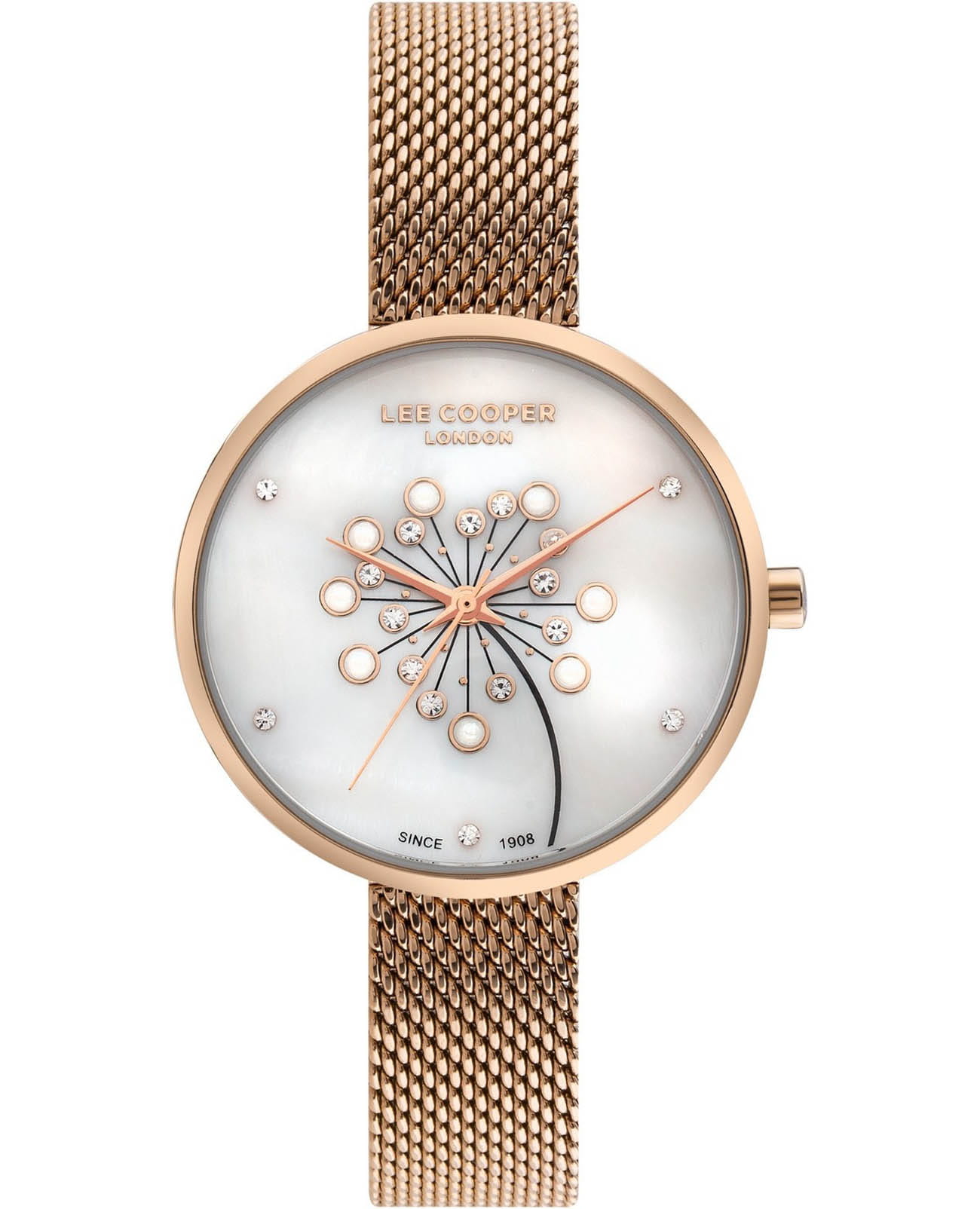 Женские кварцевые часы Lee Cooper LC07601.420 — это классический аксессуар с элегантным дизайном. Корпус диаметром 32 мм выполнен из суперметалла с IP-покрытиемIP-покрытиеМетод ионного напыления. Демонстрирует повышенную устойчивость к истиранию, окислению и химическим веществам. Под воздействием высокого давления и температуры около 1500°C молекулы металла надёжно соединяются с частицами корпуса часов. розового золота. Циферблат перламутрового цвета украшен вставками из циркония, придающими сияние и изысканность. Метки на циферблате — в виде точек. Циферблат защищён минеральным стекломМинеральное стеклоМинеральное стекло представляет собой искусственно выращенный минерал кварца. Такое стекло отличается особой устойчивостью к повреждениям и царапинам. Уступает по некоторым качествам сапфировому стеклу.. Часы оснащены браслетом миланского плетения с IP-покрытиемIP-покрытиеМетод ионного напыления. Демонстрирует повышенную устойчивость к истиранию, окислению и химическим веществам. Под воздействием высокого давления и температуры около 1500°C молекулы металла надёжно соединяются с частицами корпуса часов. на раскладной застёжкеРаскладная застёжкаТакой тип застёжки используется только на браслетах из металла. Она никогда не раскрывается полностью, происходит разделение на 2 и более частей. Раскладывающая застёжка снизит вероятность потери часов к минимуму.. Водонепроницаемость 30 м позволяет использовать часы в повседневных условиях, защищая от случайных брызг и капель дождя. Сочетание лаконичного стиля и надёжного исполнения делает эти часы универсальным выбором на каждый день.