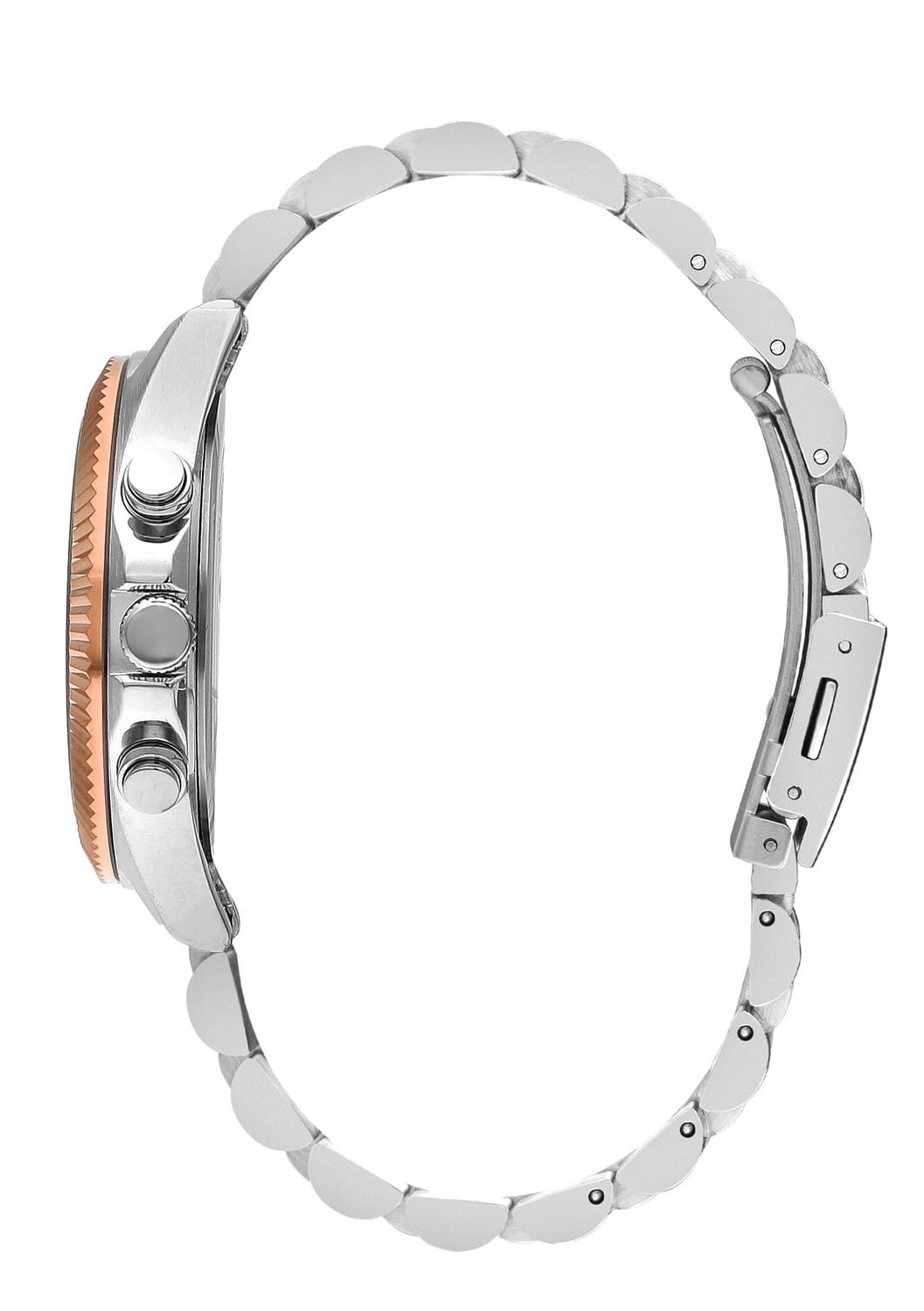 Мужские часы Lee Cooper LC07838.560 — это стильное сочетание элегантности и современного дизайна. Корпус диаметром 45 мм выполнен из суперметалла серебристого цвета, придающий модели особый блеск. Изысканный циферблат защищен минеральным стекломМинеральное стеклоМинеральное стекло представляет собой искусственно выращенный минерал кварца. Такое стекло отличается особой устойчивостью к повреждениям и царапинам. Уступает по некоторым качествам сапфировому стеклу., обеспечивающим устойчивость к царапинам. Метки в виде штрихов. Вынесенный циферблат с 24-х часовым указателем времени и с хронографомХронографФункция позволяет измерять отрезки времени с особой точностью: часы, минуты, секунды. Верным признаком хронографа является наличие на циферблате 3 дополнительных окошек-счётчиков.. Стрелки и метки с люминесцентным покрытиемЛюминесцентное покрытиеПозволяет считывать показания времени в темноте. Производители наносят на стрелки, часовые индексы, безель или поверхность циферблата светонакопительный состав, дающий холодное свечение. позволяют легко считывать время даже в условиях недостаточного освещения.Часы оснащены надежным кварцевым механизмом, а стальной браслет с частичным IP-покрытиемIP-покрытиеМетод ионного напыления. Демонстрирует повышенную устойчивость к истиранию, окислению и химическим веществам. Под воздействием высокого давления и температуры около 1500°C молекулы металла надёжно соединяются с частицами корпуса часов. на раскладной застёжкеРаскладная застёжкаТакой тип застёжки используется только на браслетах из металла. Она никогда не раскрывается полностью, происходит разделение на 2 и более частей. Раскладывающая застёжка снизит вероятность потери часов к минимуму. гарантирует комфортную посадку на запястье. Водозащита 50 метров защищает модель от случайных брызг и дождя. Lee Cooper  — отличный выбор для тех, кто ценит утонченность и качество.
