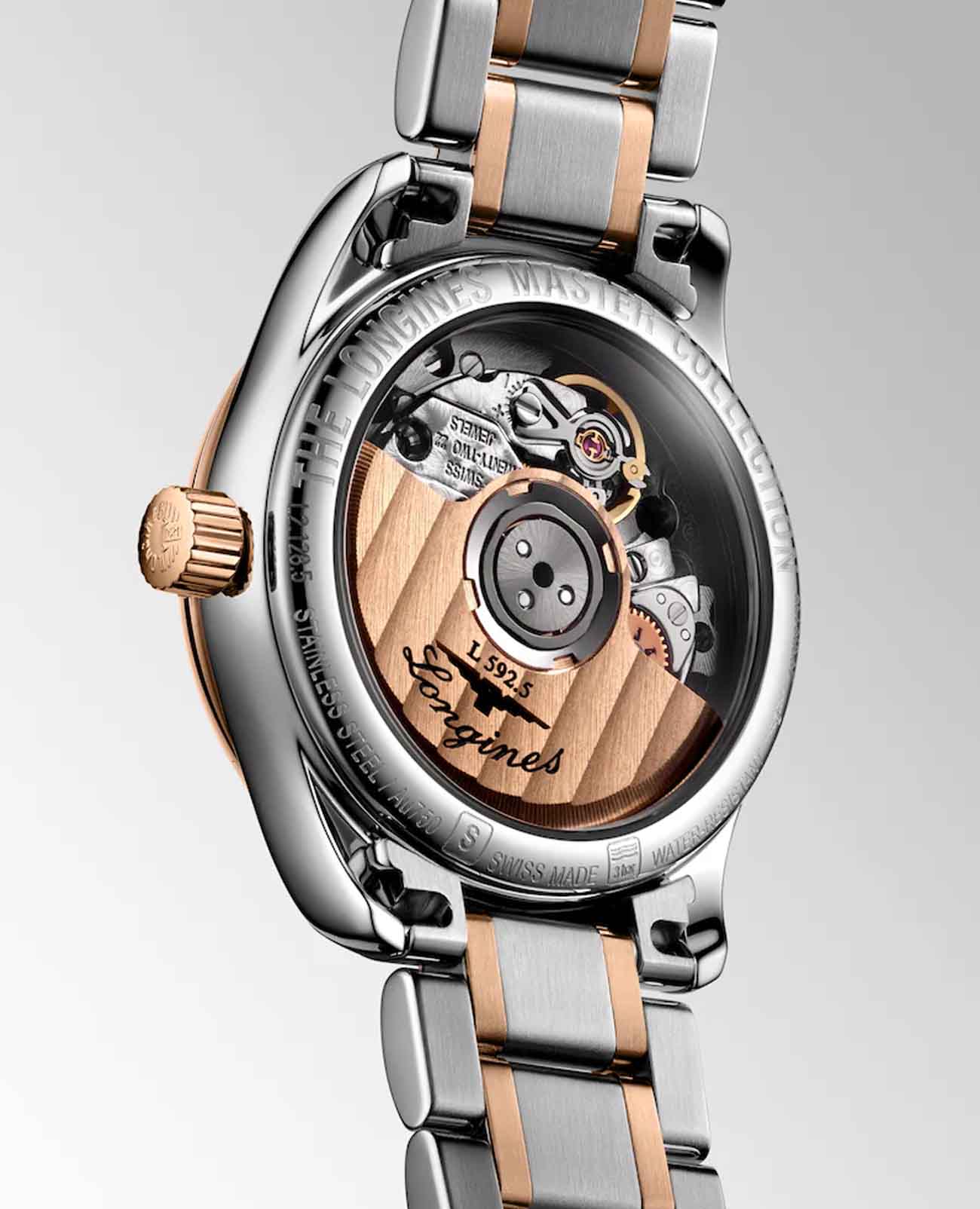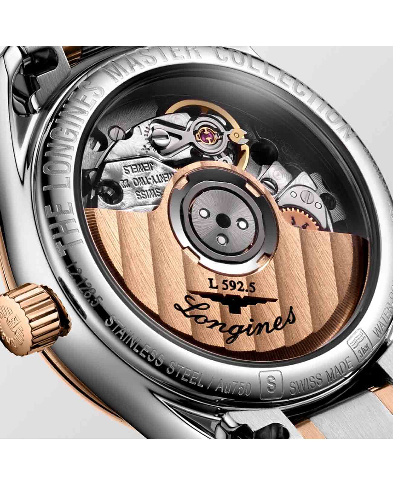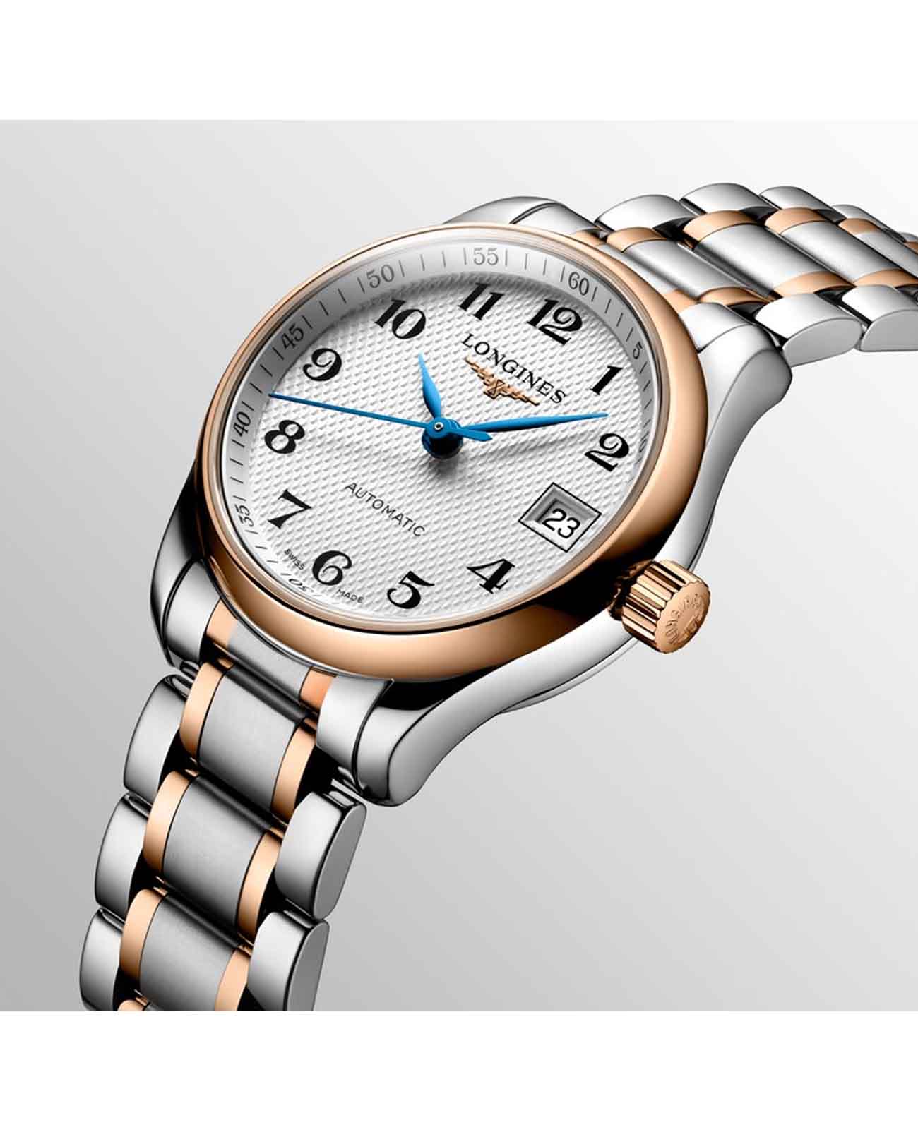 Автоматические женские двухцветные часы Longines Master Collection L2.128.5.79.7. Сапфировое стеклоСапфировое стеклоПрочный и надёжный материал из кристалла сапфира синтетического происхождения, характеризующийся особой твёрдостью и устойчивостью к царапинам и повреждениям. устойчивое к мелким механическим повреждениям. Коллекция Longines Master Collection сочетает в себе классическую элегантность и превосходное качество, которые не перестают радовать тех, кто ценит исключительные часы. Корпус из нержавеющей стали. БезельБезельВнешний ободок, закрепляющий стекло. В спортивных часах так называется поворотное кольцо с делениями на циферблате, выполняет роль таймера – замеряет отрезки времени на шкале. Неподвижный безель – элемент декора. Однонаправленно вращающийся безель на дайверских часах позволяет фиксировать моменты погружения и выныривания на поверхность. из 18-каратного золота18-каратное золотоОбозначение по каратной системе пробирования, оно показывает, сколько драгоценного металла содержится в изделии. 18 карат - в составе 75% чистого золота, соответствует 750 пробе.