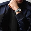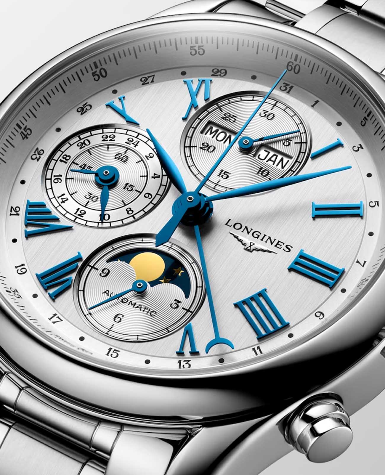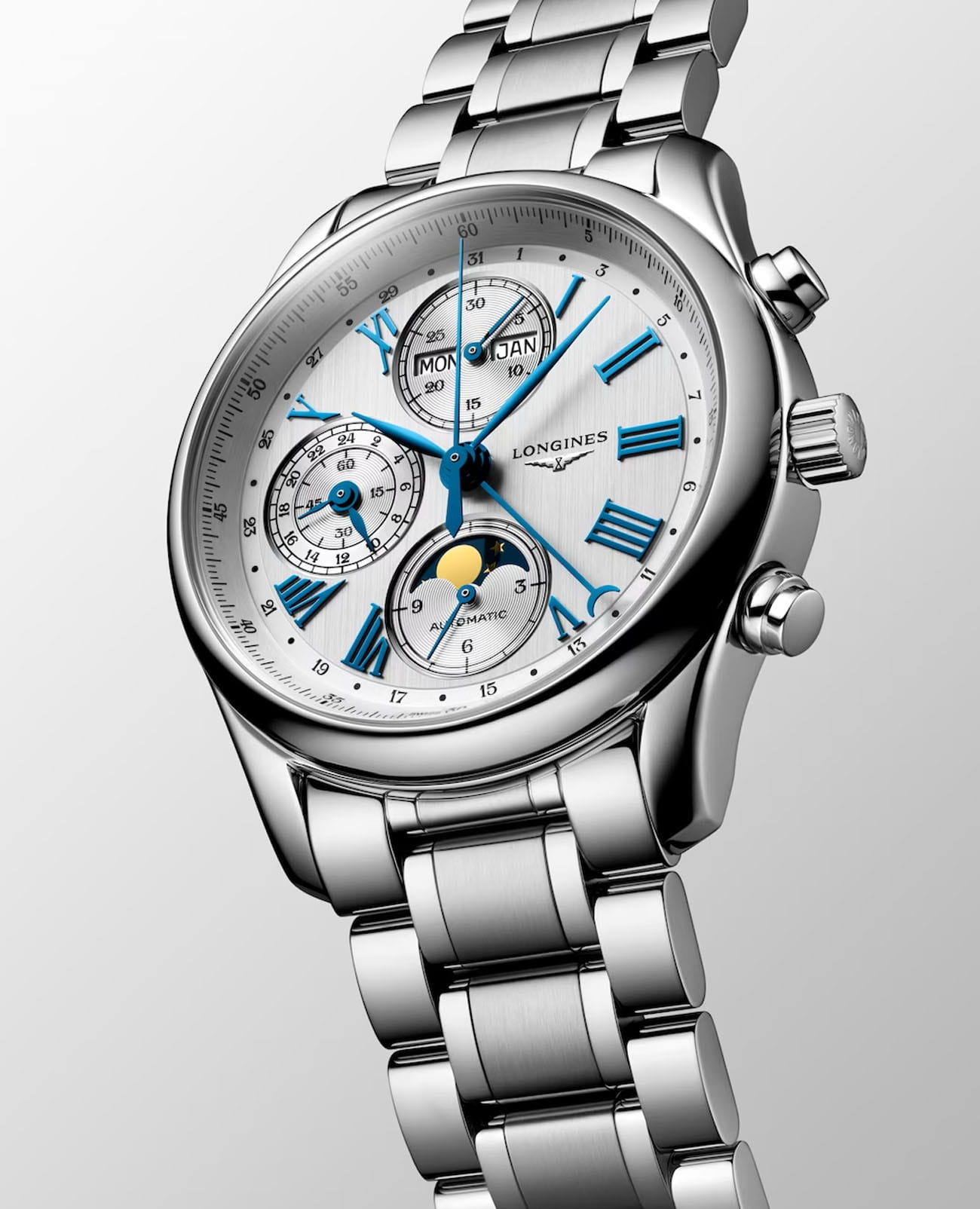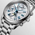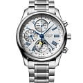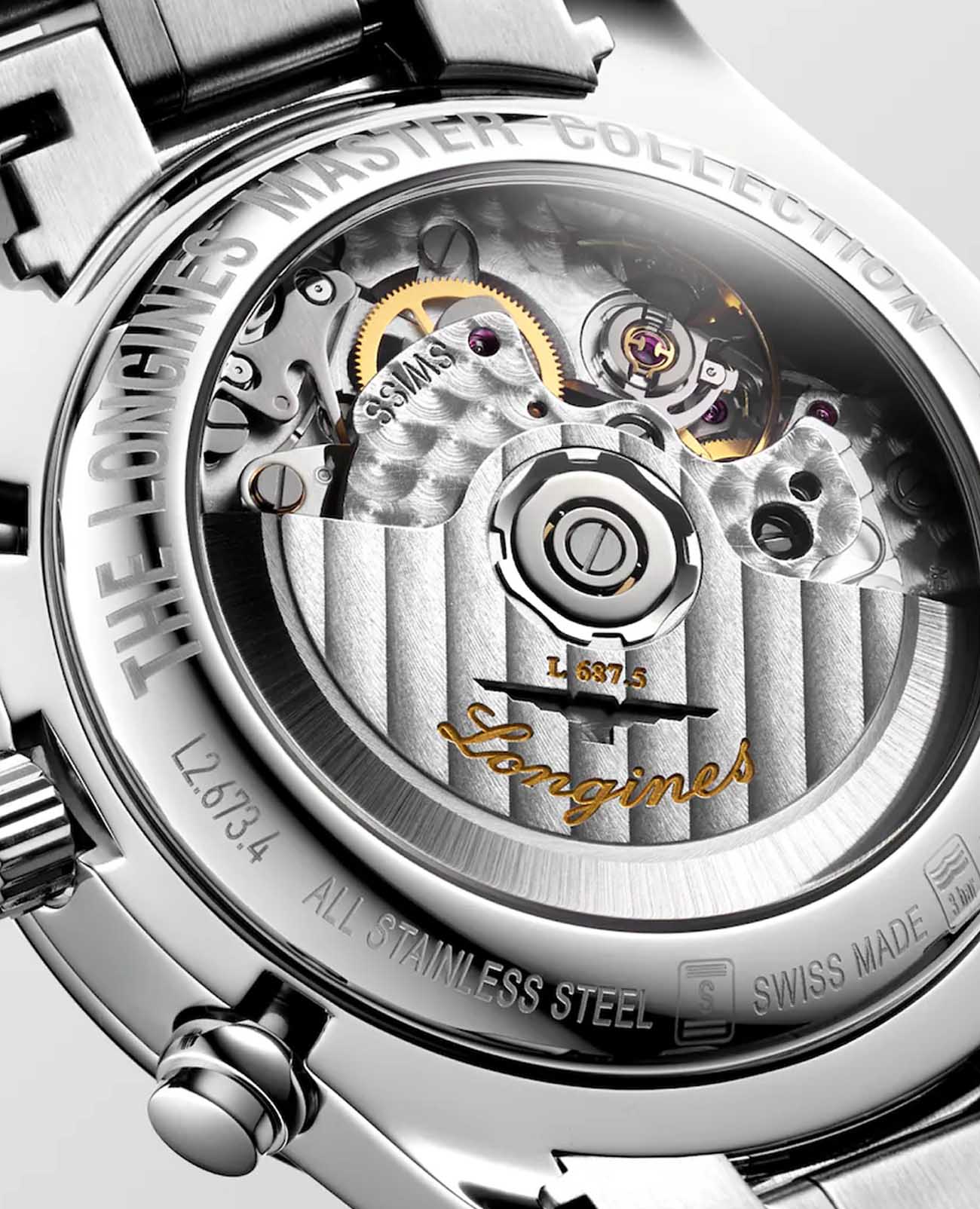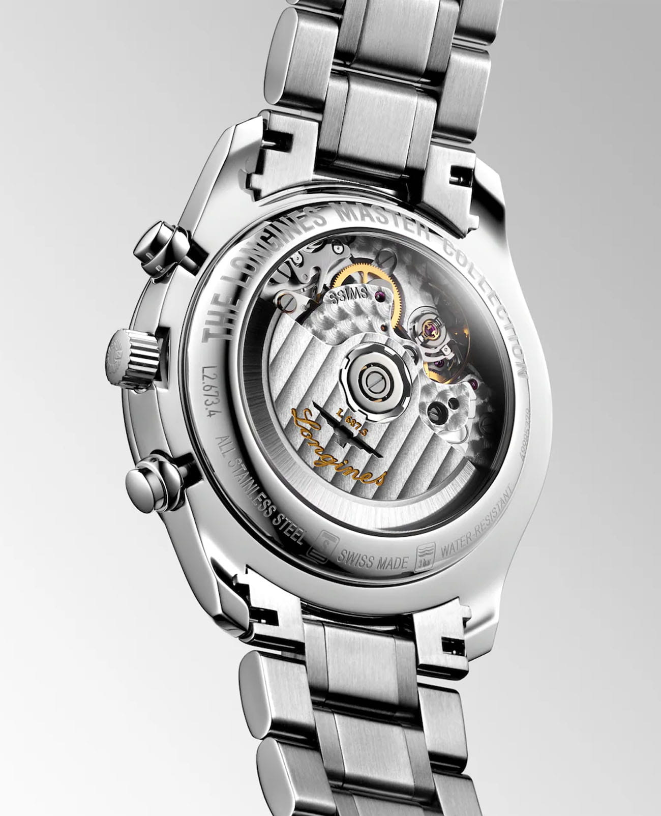 Мужсике швейцарские механические часы-хронографХронографФункция позволяет измерять отрезки времени с особой точностью: часы, минуты, секунды. Верным признаком хронографа является наличие на циферблате 3 дополнительных окошек-счётчиков. с автоподзаводом Longines Master Collection L2.673.4.71.6. Сапфировое стеклоСапфировое стеклоПрочный и надёжный материал из кристалла сапфира синтетического происхождения, характеризующийся особой твёрдостью и устойчивостью к царапинам и повреждениям. устойчивое к появлению царапин, обладающее высокой прозрачностью. Корпус часов изготовлен из нержавеющей стали. Функции: часы, минуты, малая секундная стрелка с 24-часовым индикатором в положении 9 часов. Дату показывает центральная стрелка с серповидным наконечником. Указатель фаз Луны в положении 6 часов. Прозрачная задняя крышка. Класс водозащиты: 30 метров, позволит защитить корпус от случайных брызг или капель дождя. Стальной браслет на застёжке «бабочка» с кнопкамиЗастёжка "бабочка"Такой вид застёжки дополняется предохранителями, помогающими избежать случайного раскрытия браслета. Обладают изящным исполнением. .