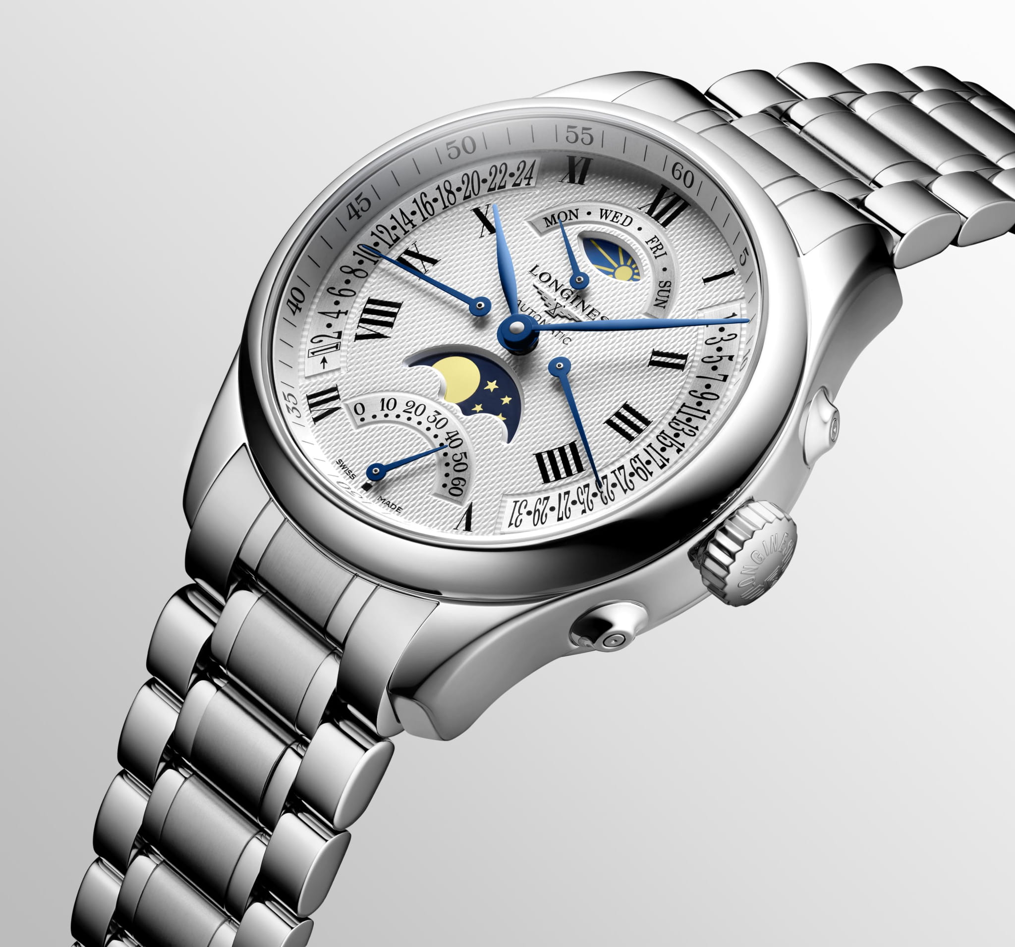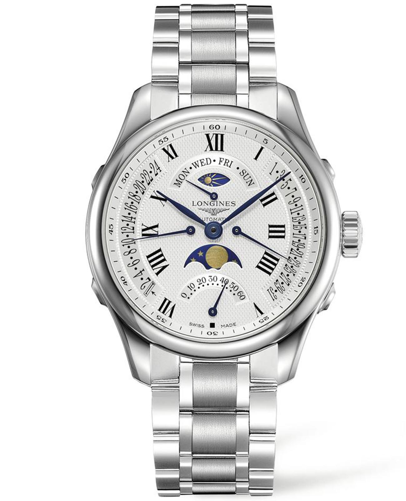 Как традиционная часовая компания, Longines с самого начала выпускала исключительные часы. Сегодня коллекция Longines Master является прекрасной иллюстрацией этого корпоративного духа, что подтверждается успехом, достигнутым этой коллекцией с момента ее запуска в 2005 году. Коллекция Longines Master Collection сочетает в себе классическую элегантность и превосходное качество, которые не перестают радовать тех, кто ценит исключительные часы. Циферблат защинен сапфировым стекломСапфировое стеклоПрочный и надёжный материал из кристалла сапфира синтетического происхождения, характеризующийся особой твёрдостью и устойчивостью к царапинам и повреждениям.. Механический механизм с автоподзаводом калибра L707, работающий с частотой 28 800 полуколебаний в час и обеспечивающий 48-часовой запас хода. Ретроградные стрелочные индикаторы: день недели в положении «12 часов», дата в правой части циферблата, малая секундная стрелка в положении «6 часов» и 24-часовая шкала второго часового пояса в левой части циферблата. Индикатор фаз Луны в положении «6 часов» и индикатор дня и ночи в положении «12 часов».