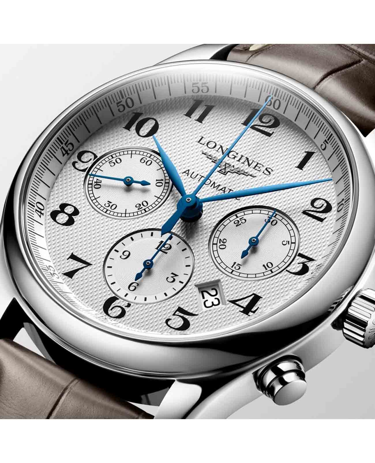 Мужсике швейцарские механические часы-хронографХронографФункция позволяет измерять отрезки времени с особой точностью: часы, минуты, секунды. Верным признаком хронографа является наличие на циферблате 3 дополнительных окошек-счётчиков. с автоподзаводом Longines Master Collection L2.759.4.78.3. Сапфировое стеклоСапфировое стеклоПрочный и надёжный материал из кристалла сапфира синтетического происхождения, характеризующийся особой твёрдостью и устойчивостью к царапинам и повреждениям. устойчивое к появлению царапин, обладающее высокой прозрачностью. Корпус часов изготовлен из нержавеющей стали. Механизм хронографа: центральная секундная стрелка, 30-минутный счетчик в положении «3 часа», 12-часовой счетчик в положении «6 часов». Прозрачная задняя крышка. Автоматический механизм с частотой баланса 28 800 полуколебаний в час и запасом хода, которого хватает примерно на 60 часов работы. Класс водозащиты: 30 метров, позволит защитить корпус от случайных брызг или капель дождя. Автоматический механизм с частотой баланса 28 800 полуколебаний в час и запасом хода, которого хватает примерно на 60 часов работы. Ремешок из кожи аллигатора на застёжке «бабочка» с кнопкамиЗастёжка "бабочка"Такой вид застёжки дополняется предохранителями, помогающими избежать случайного раскрытия браслета. Обладают изящным исполнением. .