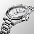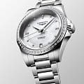 Женские швейцарские механические часы с автоподзаводом Longines Conquest L3.430.0.87.6. Сапфировое стеклоСапфировое стеклоПрочный и надёжный материал из кристалла сапфира синтетического происхождения, характеризующийся особой твёрдостью и устойчивостью к царапинам и повреждениям. устойчивое к появлению царапин, обладающее высокой прозрачностью. Корпус часов изготовлен из нержавеющей стали. Циферблат выполнен по технологии Sunray (солнечные лучи). Циферблат и безельБезельВнешний ободок, закрепляющий стекло. В спортивных часах так называется поворотное кольцо с делениями на циферблате, выполняет роль таймера – замеряет отрезки времени на шкале. Неподвижный безель – элемент декора. Однонаправленно вращающийся безель на дайверских часах позволяет фиксировать моменты погружения и выныривания на поверхность. украшены бриллиантами группы Top Wesselton VS-SI. Стрелки с люминесцентным покрытиемЛюминесцентное покрытиеПозволяет считывать показания времени в темноте. Производители наносят на стрелки, часовые индексы, безель или поверхность циферблата светонакопительный состав, дающий холодное свечение. Super-LumiNova. Окошко даты в положении 6 часов. Прозрачная задняя крышка. Класс водозащиты: 100 метров, позволит плавать, нырять и заниматься другими водными видами спорта. Стальной браслет на раскладной застёжкеРаскладная застёжкаТакой тип застёжки используется только на браслетах из металла. Она никогда не раскрывается полностью, происходит разделение на 2 и более частей. Раскладывающая застёжка снизит вероятность потери часов к минимуму..