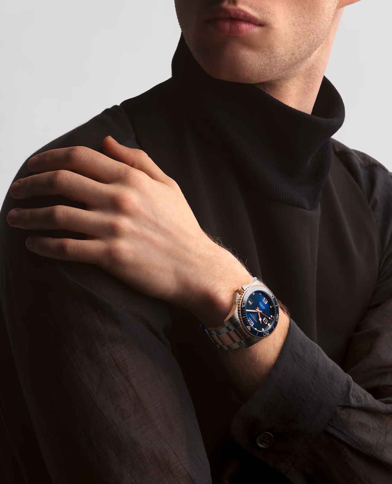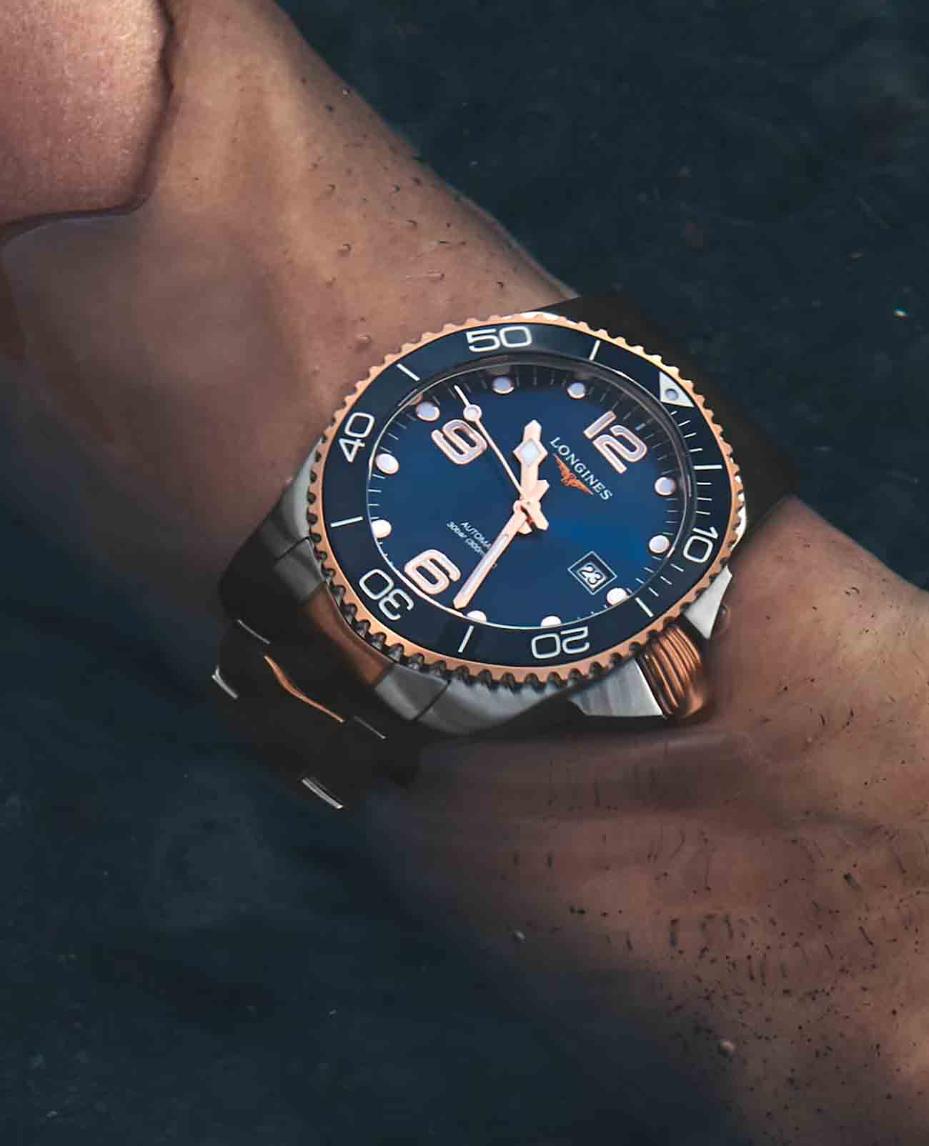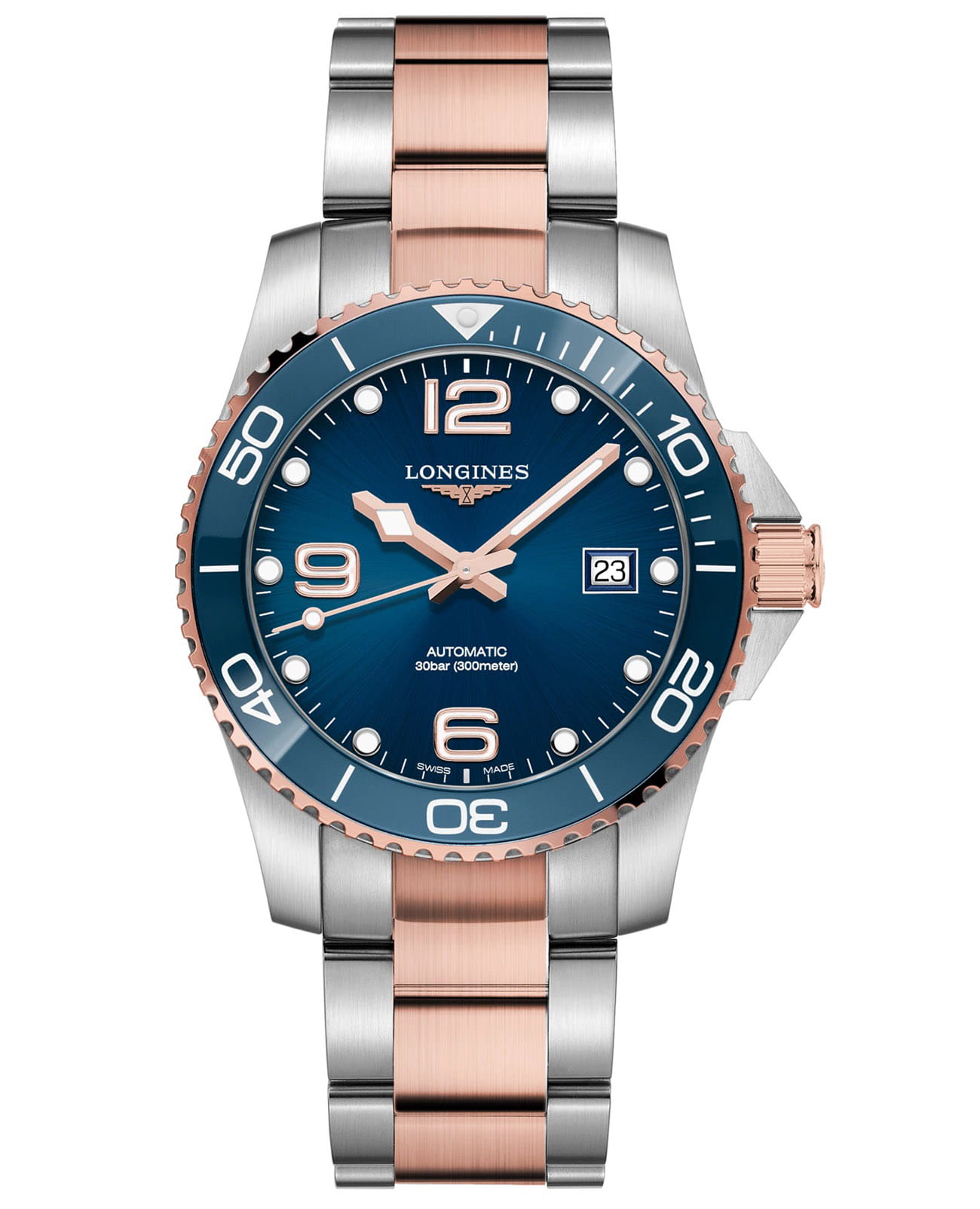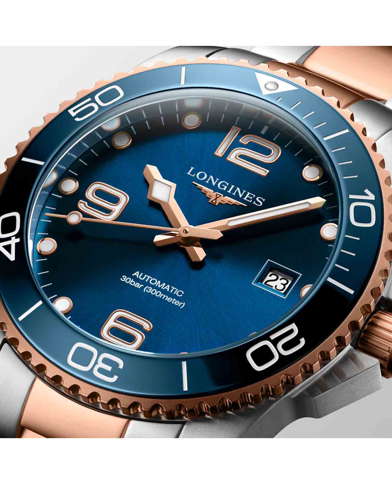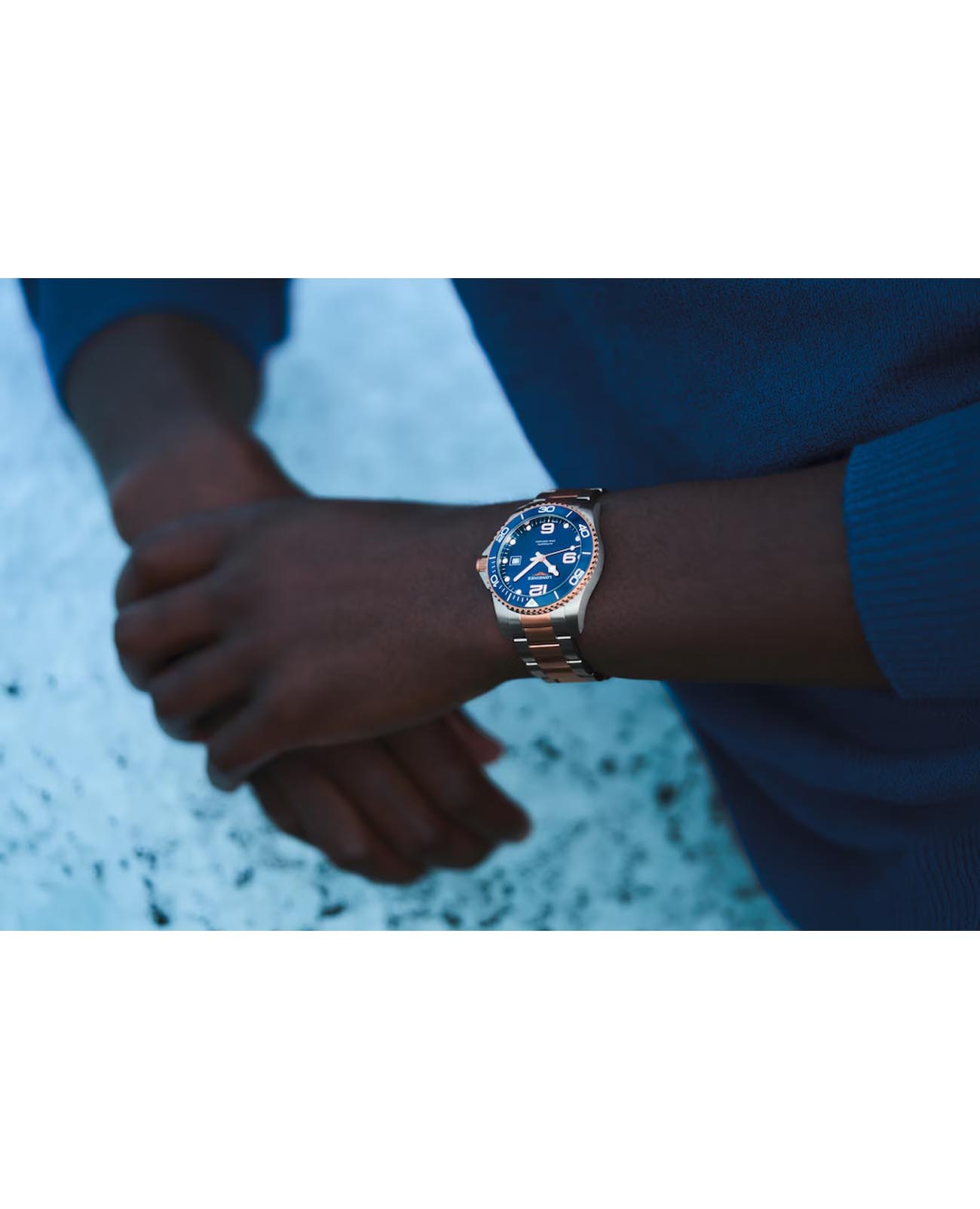 Мужские механические швейцарские часы с автоподзаводом Longines HydroConquest L3.781.3.98.7. Сапфировое стеклоСапфировое стеклоПрочный и надёжный материал из кристалла сапфира синтетического происхождения, характеризующийся особой твёрдостью и устойчивостью к царапинам и повреждениям. с антибликовым покрытием, устойчивое к мелким механическим повреждениям. Корпус часов изготовлен из нержавеющей стали. Вращающийся стальной безельБезельВнешний ободок, закрепляющий стекло. В спортивных часах так называется поворотное кольцо с делениями на циферблате, выполняет роль таймера – замеряет отрезки времени на шкале. Неподвижный безель – элемент декора. Однонаправленно вращающийся безель на дайверских часах позволяет фиксировать моменты погружения и выныривания на поверхность. с люминесцентным покрытиемЛюминесцентное покрытиеПозволяет считывать показания времени в темноте. Производители наносят на стрелки, часовые индексы, безель или поверхность циферблата светонакопительный состав, дающий холодное свечение. Superluminova из нержавеющей стали с PVD-покрытиемPVDУльтратонкое покрытие наносится в технике вакуумного напыления, сочетает в себе нитрид титана особой прочности со слоем золота или оксида хрома. Несёт в себе декоративную или защитную функцию. и керамики, защищенный от царапин, никогда не изнашивается и не выцветает. Стрелки и метки с люминесцентным покрытиемЛюминесцентное покрытиеПозволяет считывать показания времени в темноте. Производители наносят на стрелки, часовые индексы, безель или поверхность циферблата светонакопительный состав, дающий холодное свечение.. Окошко даты находится в положении 3 часа. Класс водозащиты: 300 метров, позволит плавать, нырять и заниматься другими водными видами спорта. Стальной браслет с частичным PVD-покрытиемPVDУльтратонкое покрытие наносится в технике вакуумного напыления, сочетает в себе нитрид титана особой прочности со слоем золота или оксида хрома. Несёт в себе декоративную или защитную функцию. на раскладной застёжкеРаскладная застёжкаТакой тип застёжки используется только на браслетах из металла. Она никогда не раскрывается полностью, происходит разделение на 2 и более частей. Раскладывающая застёжка снизит вероятность потери часов к минимуму. с удлинением для дайверов.