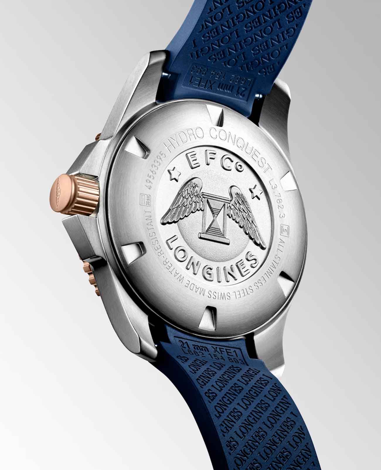 Мужские швейцарские механические часы для дайвинга Longines Hydroconquest L3.782.3.98.9. Сапфировое стеклоСапфировое стеклоПрочный и надёжный материал из кристалла сапфира синтетического происхождения, характеризующийся особой твёрдостью и устойчивостью к царапинам и повреждениям. с многослойным антибликовым покрытием с обеих сторон, устойчивое к появлению царапин, обладающее высокой прозрачностью. Корпус часов изготовлен из стали. Вращающийся безельБезельВнешний ободок, закрепляющий стекло. В спортивных часах так называется поворотное кольцо с делениями на циферблате, выполняет роль таймера – замеряет отрезки времени на шкале. Неподвижный безель – элемент декора. Однонаправленно вращающийся безель на дайверских часах позволяет фиксировать моменты погружения и выныривания на поверхность. из стали с PVD-покрытиемPVDУльтратонкое покрытие наносится в технике вакуумного напыления, сочетает в себе нитрид титана особой прочности со слоем золота или оксида хрома. Несёт в себе декоративную или защитную функцию. и керамики, защищенный от царапин, никогда не изнашивается и не выцветает. Стрелки и метки с люминесцентным покрытиемЛюминесцентное покрытиеПозволяет считывать показания времени в темноте. Производители наносят на стрелки, часовые индексы, безель или поверхность циферблата светонакопительный состав, дающий холодное свечение.. Окошко даты находится в положении 3 часов. Класс водозащиты: 300 метров, позволит плавать, нырять и заниматься другими водными видами спорта. Каучковый ремешок на раскладной застёжкеРаскладная застёжкаТакой тип застёжки используется только на браслетах из металла. Она никогда не раскрывается полностью, происходит разделение на 2 и более частей. Раскладывающая застёжка снизит вероятность потери часов к минимуму..