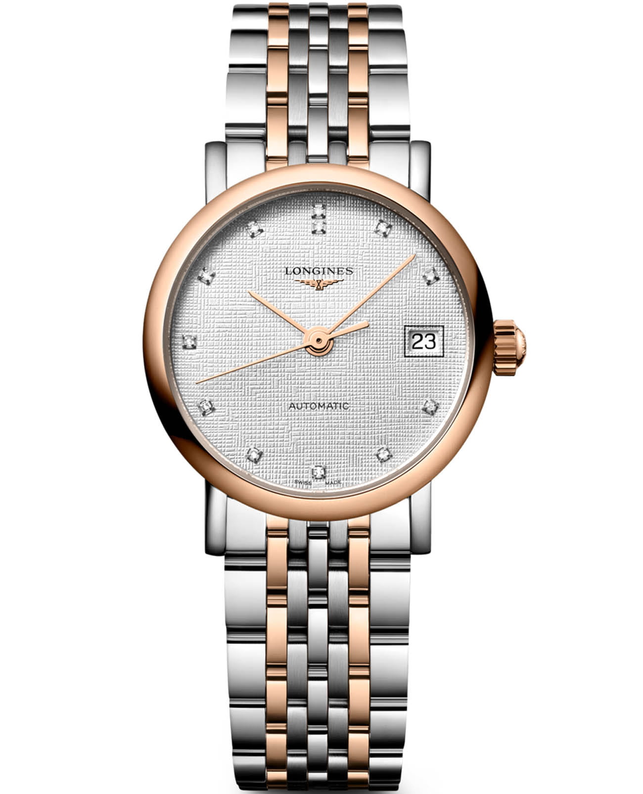 Изысканные женские часы Longines Elegance Elegant Collection 25.50 mm L4.309.5.79.7 — это воплощение спокойной роскоши и вечного стиля. Все элементы циферблата подчеркивают элегантность и классический вкус модели. Корпус часов изготовлен из нержавеющей стали, диаметром 25.50 мм. Защиту циферблата обеспечивает прочное сапфировое стеклоСапфировое стеклоПрочный и надёжный материал из кристалла сапфира синтетического происхождения, характеризующийся особой твёрдостью и устойчивостью к царапинам и повреждениям., гарантирующее четкость показаний. Циферблат украшен 12 бриллиантами Top Wesselton VS-SI общим весом 0,026 карата. Неподвижный безельБезельВнешний ободок, закрепляющий стекло. В спортивных часах так называется поворотное кольцо с делениями на циферблате, выполняет роль таймера – замеряет отрезки времени на шкале. Неподвижный безель – элемент декора. Однонаправленно вращающийся безель на дайверских часах позволяет фиксировать моменты погружения и выныривания на поверхность. из 18-каратного золота18-каратное золотоОбозначение по каратной системе пробирования, оно показывает, сколько драгоценного металла содержится в изделии. 18 карат - в составе 75% чистого золота, соответствует 750 пробе.