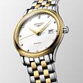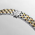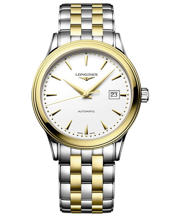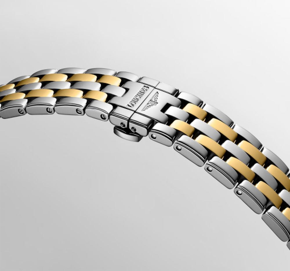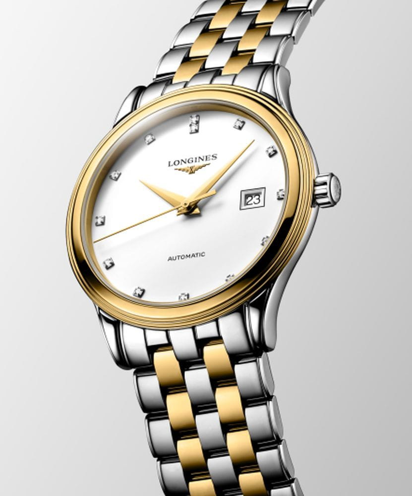 Longines L4.984.3.17.7 — классическая модель из серии Flagship Classic с утончённой эстетикой: корпус и браслет из нержавеющей стали с жёлтым PVDPVDУльтратонкое покрытие наносится в технике вакуумного напыления, сочетает в себе нитрид титана особой прочности со слоем золота или оксида хрома. Несёт в себе декоративную или защитную функцию.-покрытием, прозрачная задняя крышка из сапфира открывает вид на автоматический калибр L888 (25 200 пк/ч, монокристаллическая кремниевая пружина баланса), обеспечивающий запас хода до 72 ч ; выпуклое сапфировое стеклоСапфировое стеклоПрочный и надёжный материал из кристалла сапфира синтетического происхождения, характеризующийся особой твёрдостью и устойчивостью к царапинам и повреждениям. с несколькими слоями антибликового покрытияАнтибликовое покрытиеСлой оксида металла в 0,13-0,3 микрон, благодаря которому стекло часов не бликует и не отражает свет. Антибликовое покрытие уменьшает отражение света в 10 раз, обеспечивая отличную читаемость показателей циферблата. на внутренней стороне гарантирует отличную читаемость циферблата  ; матовый белый циферблат украшен 13 бриллиантами Top Wesselton VS‑SI общим весом приблизительно 0,059 ct, стрелки — позолоченные  . Диаметр корпуса 40 мм, толщина 8,7 мм, расстояние между ушками 21 мм, расстояние от ушка до ушка 47 мм, водозащита 3 бар (30 м), функции: часы, минуты, секунды и дата .