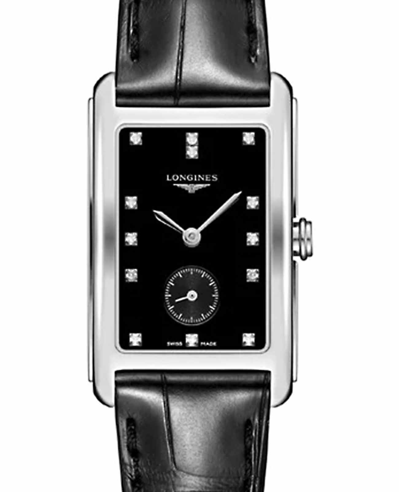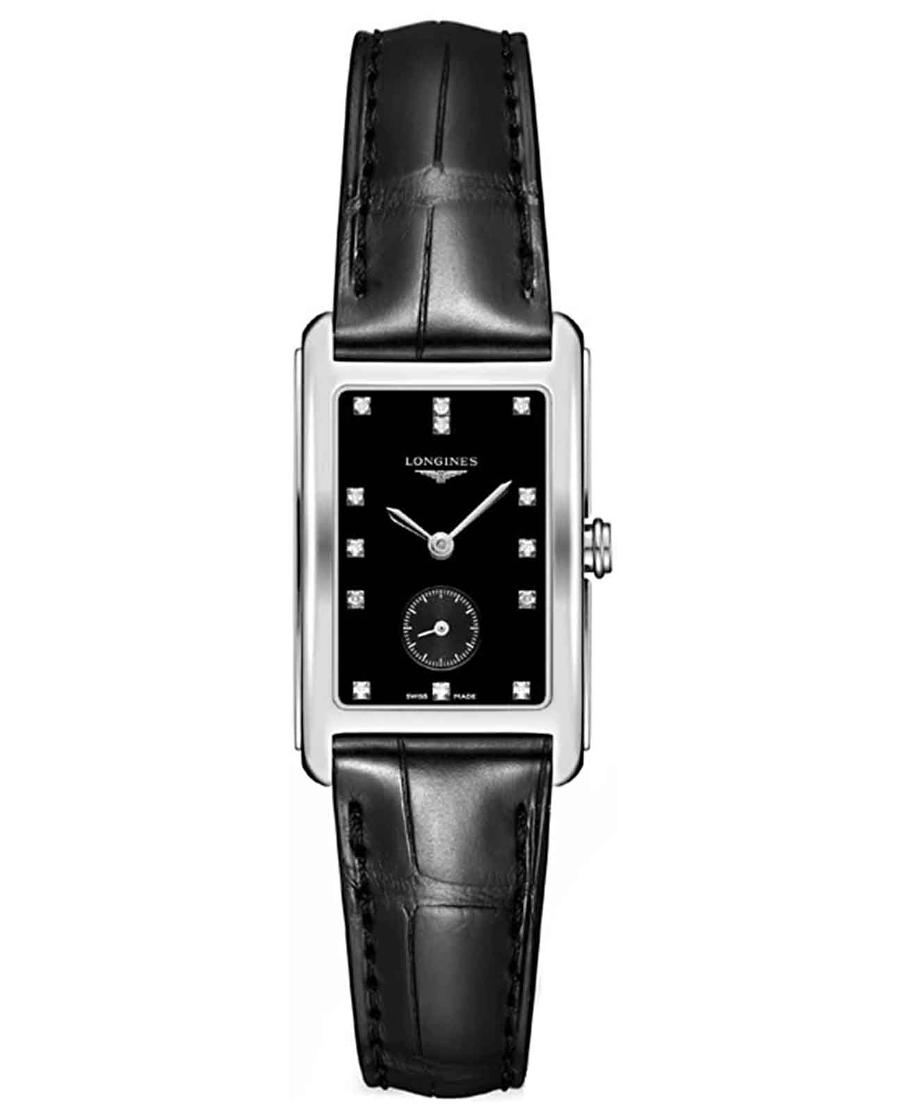 Женские швейцарские часы Longines DolceVita L5.512.4.57.0, кварцевый механизм с высокой точностью. Сапфировое стеклоСапфировое стеклоПрочный и надёжный материал из кристалла сапфира синтетического происхождения, характеризующийся особой твёрдостью и устойчивостью к царапинам и повреждениям. устойчивое к появлению царапин, обладающее высокой прозрачностью. Корпус часов изготовлен из стали. Циферблат украшают 13 бриллиантов 0,06 карат. Малая секундная стрелка в положении 6 часов. Класс водозащиты: 30 метров, позволит защитить корпус от случайных брызг или капель дождя. Кожаный ремешок на стандартной застежке.