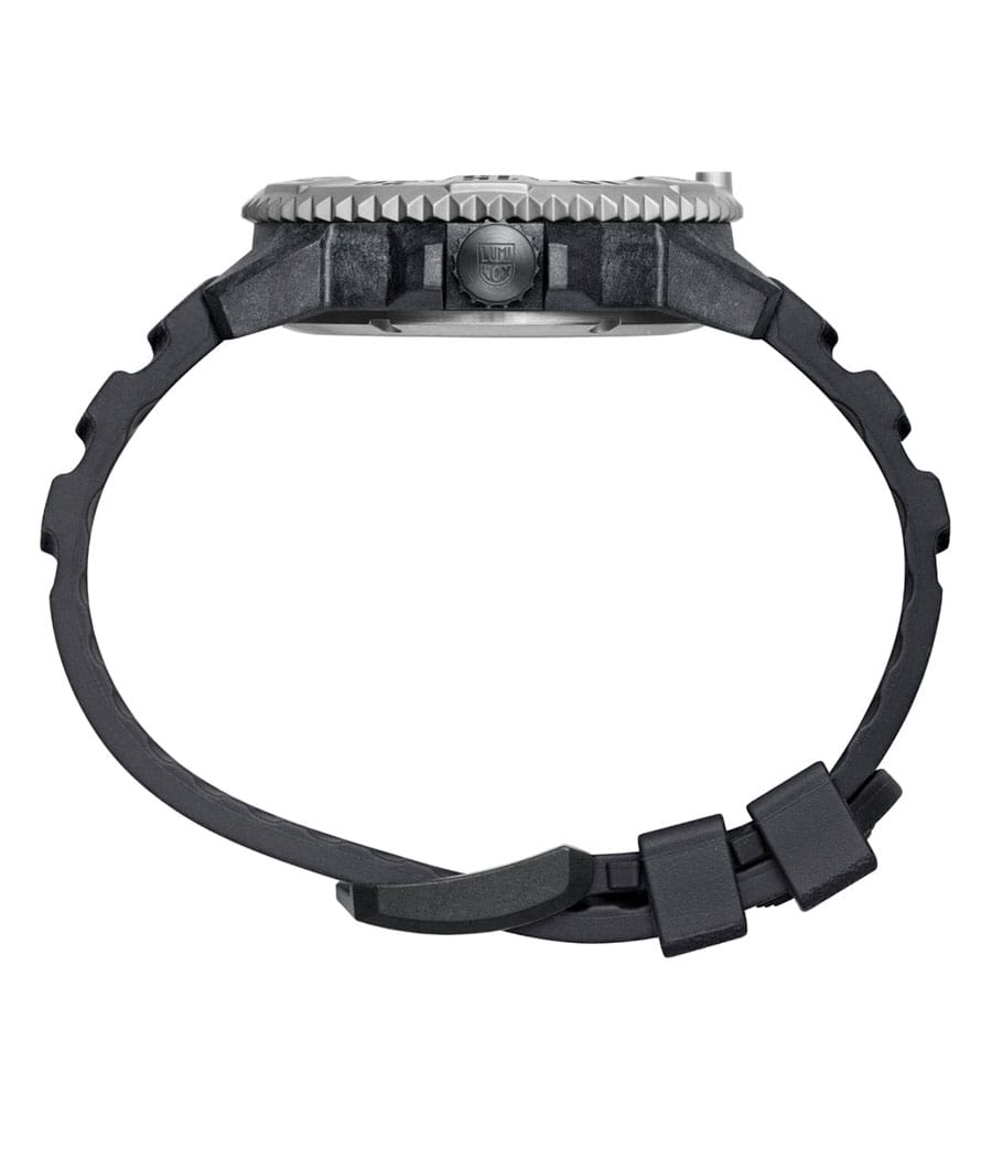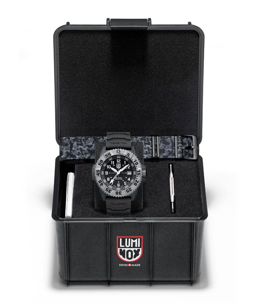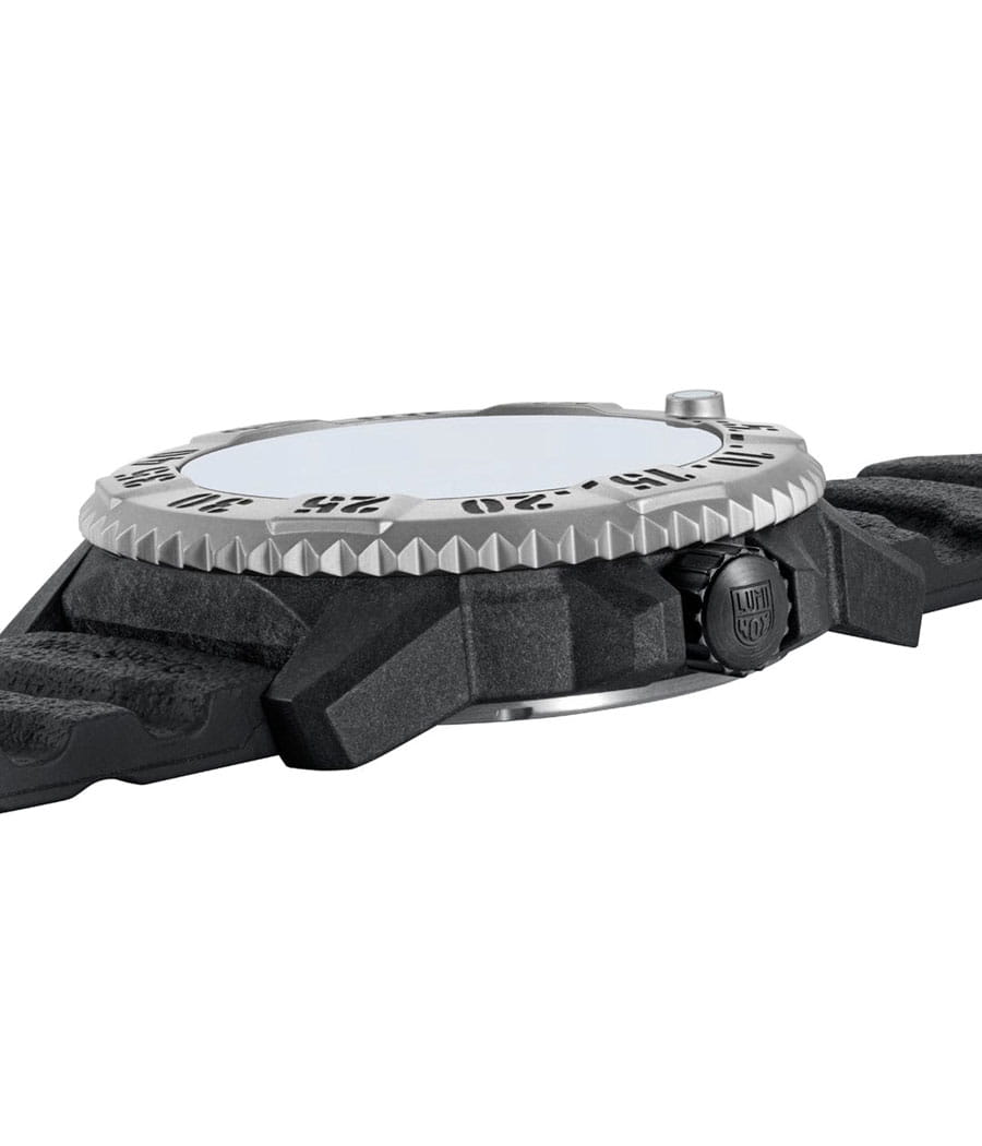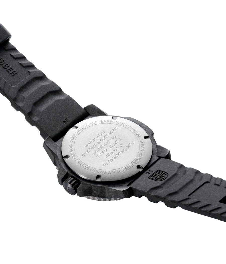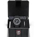 Luminox XL.3513.S.SET — мужская модель из коллекции Navy SEAL с мощным и функциональным дизайном, ориентированным на экстремальные условия. Корпус диаметром 46 мм выполнен из лёгкого и прочного углеродного композита Carbon Core GuardCarbon Core Guard Новейшая структура корпуса, разработанная Casio. Полиуретановая пластина дополнительно усилена карбоновыми вставками, что придаёт специальную защиту от механических повреждений. Карбон отличается лёгкостью и прочностью., а массивный односторонний вращающийся безельБезельВнешний ободок, закрепляющий стекло. В спортивных часах так называется поворотное кольцо с делениями на циферблате, выполняет роль таймера – замеряет отрезки времени на шкале. Неподвижный безель – элемент декора. Однонаправленно вращающийся безель на дайверских часах позволяет фиксировать моменты погружения и выныривания на поверхность. изготовлен из нержавеющей стали и дополнен крупной минутной разметкой для удобства под водой. Защитную функцию выполняет сапфировое стеклоСапфировое стеклоПрочный и надёжный материал из кристалла сапфира синтетического происхождения, характеризующийся особой твёрдостью и устойчивостью к царапинам и повреждениям. с антибликовым покрытиемАнтибликовое покрытиеСлой оксида металла в 0,13-0,3 микрон, благодаря которому стекло часов не бликует и не отражает свет. Антибликовое покрытие уменьшает отражение света в 10 раз, обеспечивая отличную читаемость показателей циферблата., обеспечивающим читаемость в любых условиях. В основе лежит швейцарский кварцевый механизм с индикацией часов, минут, секунд, даты и центральной секундной стрелкой. Водозащита 300 м (30 бар) соответствует профессиональным стандартам дайвинга. Метки и стрелки оснащены системой постоянной подсветки Luminox Light Technology, гарантирующей видимость до 25 лет без подзарядки. Модель укомплектована каучуковым ремешком с классической застёжкой, который обеспечивает комфорт и долговечность в носке. Так же в комплекте идет тканевый ремешок.