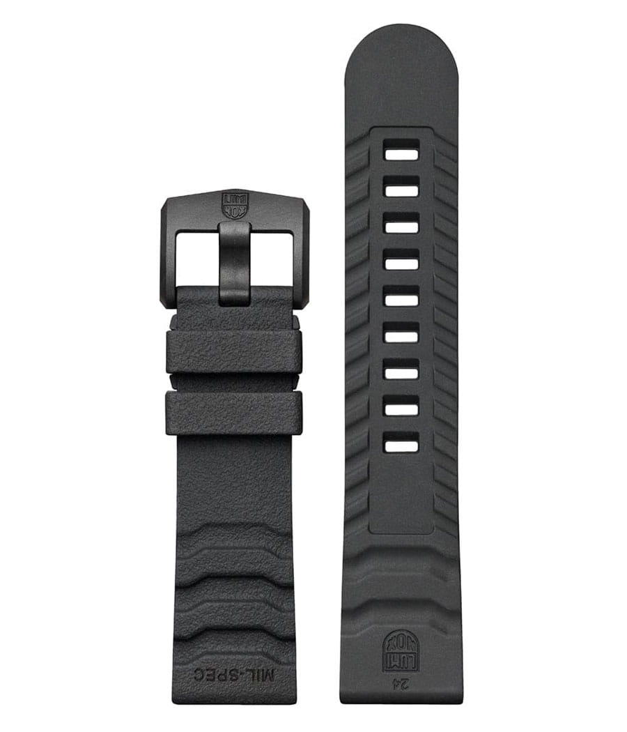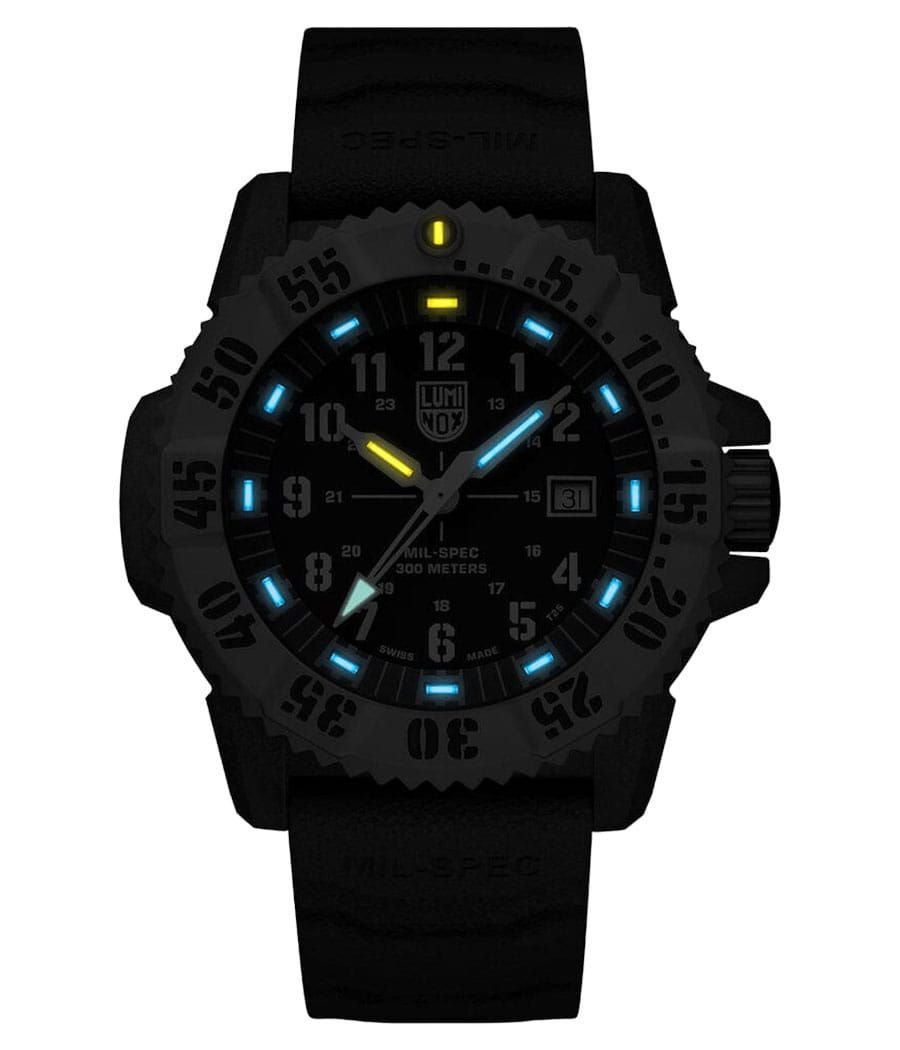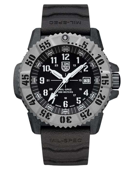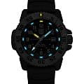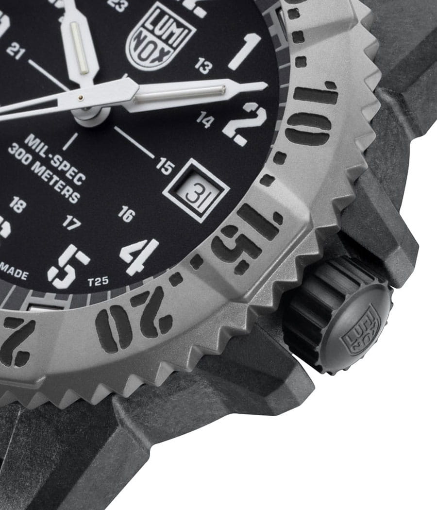 Luminox XL.3513.S.SET — мужская модель из коллекции Navy SEAL с мощным и функциональным дизайном, ориентированным на экстремальные условия. Корпус диаметром 46 мм выполнен из лёгкого и прочного углеродного композита Carbon Core GuardCarbon Core Guard Новейшая структура корпуса, разработанная Casio. Полиуретановая пластина дополнительно усилена карбоновыми вставками, что придаёт специальную защиту от механических повреждений. Карбон отличается лёгкостью и прочностью., а массивный односторонний вращающийся безельБезельВнешний ободок, закрепляющий стекло. В спортивных часах так называется поворотное кольцо с делениями на циферблате, выполняет роль таймера – замеряет отрезки времени на шкале. Неподвижный безель – элемент декора. Однонаправленно вращающийся безель на дайверских часах позволяет фиксировать моменты погружения и выныривания на поверхность. изготовлен из нержавеющей стали и дополнен крупной минутной разметкой для удобства под водой. Защитную функцию выполняет сапфировое стеклоСапфировое стеклоПрочный и надёжный материал из кристалла сапфира синтетического происхождения, характеризующийся особой твёрдостью и устойчивостью к царапинам и повреждениям. с антибликовым покрытиемАнтибликовое покрытиеСлой оксида металла в 0,13-0,3 микрон, благодаря которому стекло часов не бликует и не отражает свет. Антибликовое покрытие уменьшает отражение света в 10 раз, обеспечивая отличную читаемость показателей циферблата., обеспечивающим читаемость в любых условиях. В основе лежит швейцарский кварцевый механизм с индикацией часов, минут, секунд, даты и центральной секундной стрелкой. Водозащита 300 м (30 бар) соответствует профессиональным стандартам дайвинга. Метки и стрелки оснащены системой постоянной подсветки Luminox Light Technology, гарантирующей видимость до 25 лет без подзарядки. Модель укомплектована каучуковым ремешком с классической застёжкой, который обеспечивает комфорт и долговечность в носке. Так же в комплекте идет тканевый ремешок.