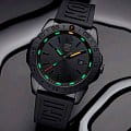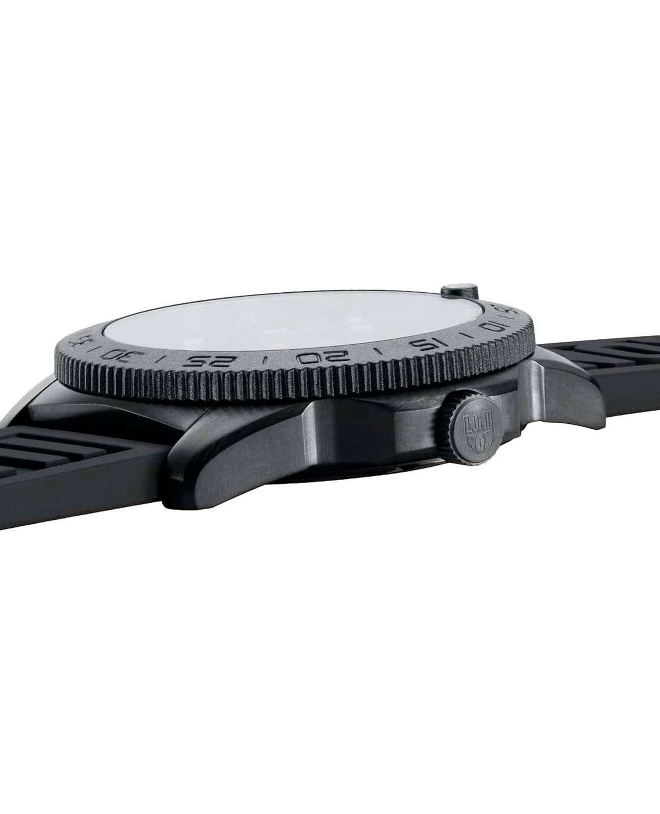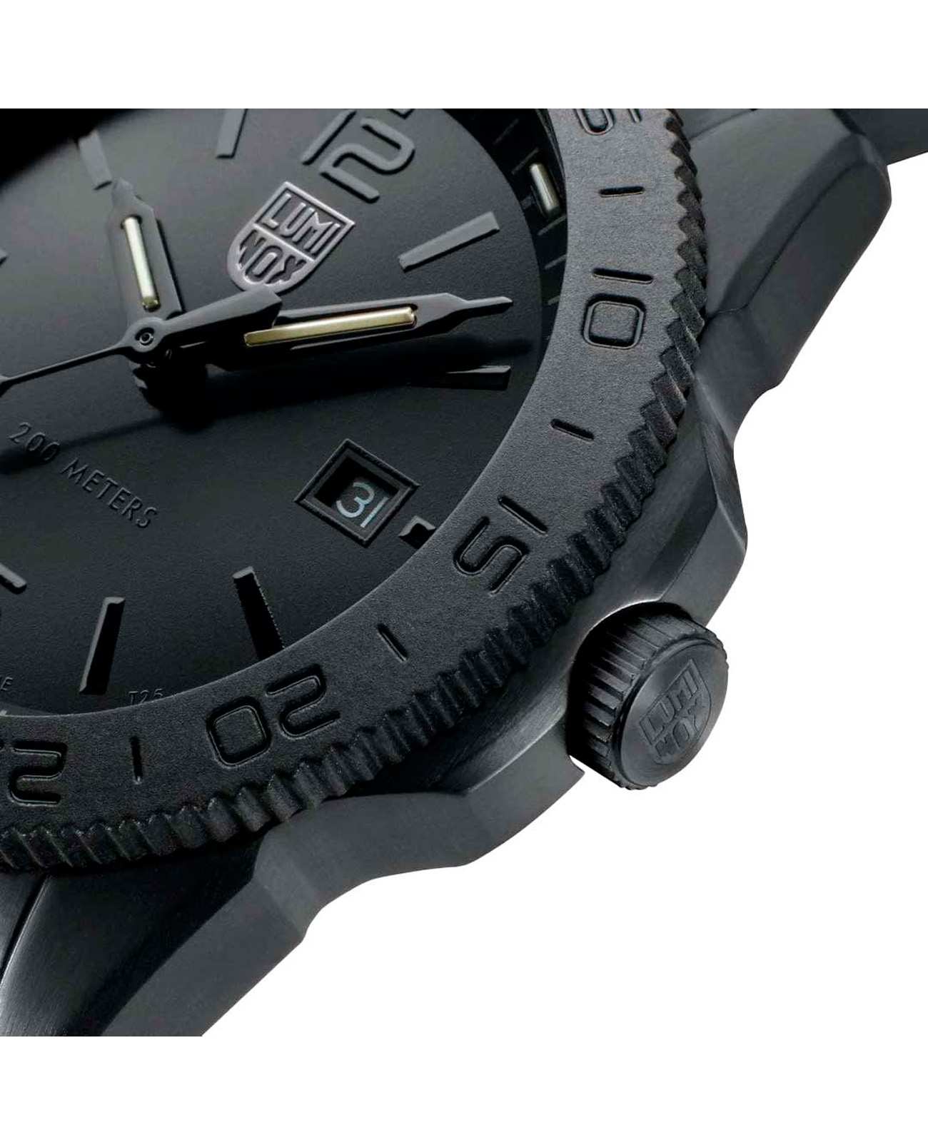 Мужские наручные часы Luminox XS.3121.BO.1 из коллекции Pacific Diver сочетают в себе спортивный дизайн и надежность швейцарского качества . Модель обладает круглым корпусом диаметром 44 мм, изготовленным из нержавеющей стали с PVD-покрытиемPVDУльтратонкое покрытие наносится в технике вакуумного напыления, сочетает в себе нитрид титана особой прочности со слоем золота или оксида хрома. Несёт в себе декоративную или защитную функцию., что обеспечивает высокую устойчивость к внешним воздействиям и долговечность . Циферблат черного цвета украшен контрастными метками и стрелками с люминесцентным покрытиемЛюминесцентное покрытиеПозволяет считывать показания времени в темноте. Производители наносят на стрелки, часовые индексы, безель или поверхность циферблата светонакопительный состав, дающий холодное свечение., гарантирующим постоянную видимость времени даже в условиях низкой освещенности благодаря системе LLTLLTLLT — это автономный механизм подсветки, основанный на использовании микроскопических газонаполненных элементов. Специальные герметичные капсулы из боросиликатного стекла, интегрированные в циферблат, генерируют свечение без необходимости подключения к внешним источникам энергии. Для их работы не требуется ни дополнительный свет, ни механическое воздействие (например, нажатие кнопки). Свечение возникает благодаря химическому процессу: реакция между тритием, заключенным в капсулах, и люминофорным покрытием создает стабильное автономное освещение. Технология обеспечивает энергетическую независимость и долговечность подсветки. (микрогазовые огни) . Часы оснащены кварцевым механизмом швейцарского производства Ronda 515, обеспечивающим точность хода ±15 секунд в месяц . Защиту циферблата обеспечивает прочное сапфировое стеклоСапфировое стеклоПрочный и надёжный материал из кристалла сапфира синтетического происхождения, характеризующийся особой твёрдостью и устойчивостью к царапинам и повреждениям. с антибликовым покрытиемАнтибликовое покрытиеСлой оксида металла в 0,13-0,3 микрон, благодаря которому стекло часов не бликует и не отражает свет. Антибликовое покрытие уменьшает отражение света в 10 раз, обеспечивая отличную читаемость показателей циферблата., устойчивое к царапинам и механическим повреждениям. Водонепроницаемость модели достигает 20 атмосфер (200 метров), что делает их подходящими для плавания и активного отдыха на воде, включая дайвинг . Модель также оснащена безелемБезельВнешний ободок, закрепляющий стекло. В спортивных часах так называется поворотное кольцо с делениями на циферблате, выполняет роль таймера – замеряет отрезки времени на шкале. Неподвижный безель – элемент декора. Однонаправленно вращающийся безель на дайверских часах позволяет фиксировать моменты погружения и выныривания на поверхность. из карбонаКарбонОт «carbon», «carbone» - углерод, углепластик - полимерный композиционный материал из переплетённых под определенным углом между собой нитей углеродного волокна, применяется для изготовления лёгких, но прочных деталей. В часах часто используют для украшения циферблатов и ремешков. Так же карбон используется в изготовлении корпусов. Такие корпуса обладают антикоррозионным свойством, не поддаются электромагнитному излучению, обладают повышенной прочностью и противоударностью. (CARBONOX™