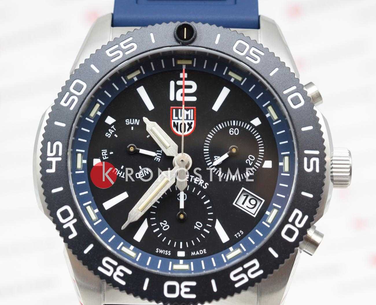 Мужские наручные часы-хронографХронографФункция позволяет измерять отрезки времени с особой точностью: часы, минуты, секунды. Верным признаком хронографа является наличие на циферблате 3 дополнительных окошек-счётчиков. Luminox XS.3143.SET из коллекции Pacific Diver сочетают в себе спортивный дизайн и надежность швейцарского качества . Модель обладает круглым корпусом диаметром 44 мм, изготовленным из нержавеющей стали, что обеспечивает высокую устойчивость к внешним воздействиям и долговечность . Циферблат черного цвета украшен контрастными метками и стрелками с люминесцентным покрытиемЛюминесцентное покрытиеПозволяет считывать показания времени в темноте. Производители наносят на стрелки, часовые индексы, безель или поверхность циферблата светонакопительный состав, дающий холодное свечение., гарантирующим постоянную видимость времени даже в условиях низкой освещенности благодаря системе LLTLLTLLT — это автономный механизм подсветки, основанный на использовании микроскопических газонаполненных элементов. Специальные герметичные капсулы из боросиликатного стекла, интегрированные в циферблат, генерируют свечение без необходимости подключения к внешним источникам энергии. Для их работы не требуется ни дополнительный свет, ни механическое воздействие (например, нажатие кнопки). Свечение возникает благодаря химическому процессу: реакция между тритием, заключенным в капсулах, и люминофорным покрытием создает стабильное автономное освещение. Технология обеспечивает энергетическую независимость и долговечность подсветки. (микрогазовые огни) . Часы оснащены кварцевым механизмом швейцарского производства Ronda 515, обеспечивающим точность хода ±15 секунд в месяц . Защиту циферблата обеспечивает прочное сапфировое стеклоСапфировое стеклоПрочный и надёжный материал из кристалла сапфира синтетического происхождения, характеризующийся особой твёрдостью и устойчивостью к царапинам и повреждениям. с антибликовым покрытиемАнтибликовое покрытиеСлой оксида металла в 0,13-0,3 микрон, благодаря которому стекло часов не бликует и не отражает свет. Антибликовое покрытие уменьшает отражение света в 10 раз, обеспечивая отличную читаемость показателей циферблата., устойчивое к царапинам и механическим повреждениям . Водонепроницаемость модели достигает 20 атмосфер (200 метров), что делает их подходящими для плавания и активного отдыха на воде, включая дайвинг . Модель также оснащена безелемБезельВнешний ободок, закрепляющий стекло. В спортивных часах так называется поворотное кольцо с делениями на циферблате, выполняет роль таймера – замеряет отрезки времени на шкале. Неподвижный безель – элемент декора. Однонаправленно вращающийся безель на дайверских часах позволяет фиксировать моменты погружения и выныривания на поверхность. с односторонним вращением, что добавляет функциональности при использовании в водных условиях . Ремешок выполнен из каучука, что обеспечивает комфортное ношение в течение дня и удобство в уходе . Дополнительно часы имеют окно даты в положении «3 часа», что делает их практичными для повседневного использования . Сочетание современных технологий, надежности и стильного дизайна делает Luminox XS.3143.SET идеальным выбором для ценителей качественных аксессуаров. В комплекте идет дополнительный черный каучуковый р