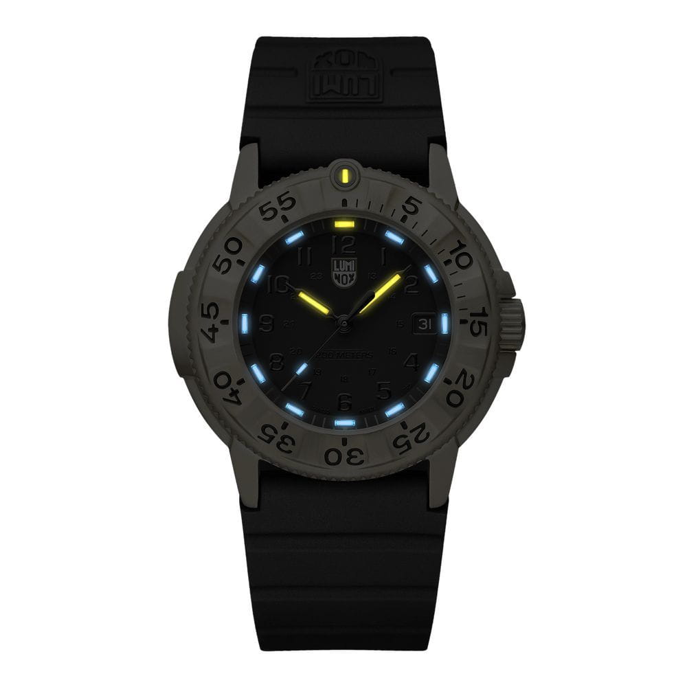 Luminox XS.3221.NSF — мужская модель серии Navy SEAL Foundation, сочетающая функциональность дайверских часов и выразительный дизайн. Корпус диаметром 43 мм выполнен из нержавеющей стали с жёлтым PVDPVDУльтратонкое покрытие наносится в технике вакуумного напыления, сочетает в себе нитрид титана особой прочности со слоем золота или оксида хрома. Несёт в себе декоративную или защитную функцию.-покрытием, а односторонний вращающийся безельБезельВнешний ободок, закрепляющий стекло. В спортивных часах так называется поворотное кольцо с делениями на циферблате, выполняет роль таймера – замеряет отрезки времени на шкале. Неподвижный безель – элемент декора. Однонаправленно вращающийся безель на дайверских часах позволяет фиксировать моменты погружения и выныривания на поверхность. с минутной шкалой обеспечивает удобство при работе под водой. Защитную функцию выполняет сапфировое стеклоСапфировое стеклоПрочный и надёжный материал из кристалла сапфира синтетического происхождения, характеризующийся особой твёрдостью и устойчивостью к царапинам и повреждениям., устойчивое к царапинам и дополненное антибликовым покрытием для лучшей читаемости. Водозащита 200 м (20 бар) делает модель надёжным инструментом для дайвинга. Часы оснащены швейцарским кварцевым механизмом с индикацией часов, минут, секунд и даты. Стрелки и метки имеют люминесцентное покрытиеЛюминесцентное покрытиеПозволяет считывать показания времени в темноте. Производители наносят на стрелки, часовые индексы, безель или поверхность циферблата светонакопительный состав, дающий холодное свечение. с системой постоянной подсветки Luminox Light Technology, обеспечивающей читаемость в любых условиях, включая полную темноту. Модель дополнена каучуковым ремешком с классической застёжкой, обеспечивающим комфортное ношение и долговечность.