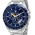 Мужские наручные часы-хронографХронографФункция позволяет измерять отрезки времени с особой точностью: часы, минуты, секунды. Верным признаком хронографа является наличие на циферблате 3 дополнительных окошек-счётчиков. Maserati R8871612039, кварцевый механизм с высокой точностью. Минеральное стеклоМинеральное стеклоМинеральное стекло представляет собой искусственно выращенный минерал кварца. Такое стекло отличается особой устойчивостью к повреждениям и царапинам. Уступает по некоторым качествам сапфировому стеклу. устойчивое к появлению царапин, обладающее высокой прозрачностью. Стрелки и метки с люминесцентным покрытиемЛюминесцентное покрытиеПозволяет считывать показания времени в темноте. Производители наносят на стрелки, часовые индексы, безель или поверхность циферблата светонакопительный состав, дающий холодное свечение.. Класс водозащиты: 100 метров, позволит плавать, нырять и заниматься другими водными видами спорта.БезельБезельВнешний ободок, закрепляющий стекло. В спортивных часах так называется поворотное кольцо с делениями на циферблате, выполняет роль таймера – замеряет отрезки времени на шкале. Неподвижный безель – элемент декора. Однонаправленно вращающийся безель на дайверских часах позволяет фиксировать моменты погружения и выныривания на поверхность. изготовлен из нержавеющей стали с PVD-покрытиемPVDУльтратонкое покрытие наносится в технике вакуумного напыления, сочетает в себе нитрид титана особой прочности со слоем золота или оксида хрома. Несёт в себе декоративную или защитную функцию..