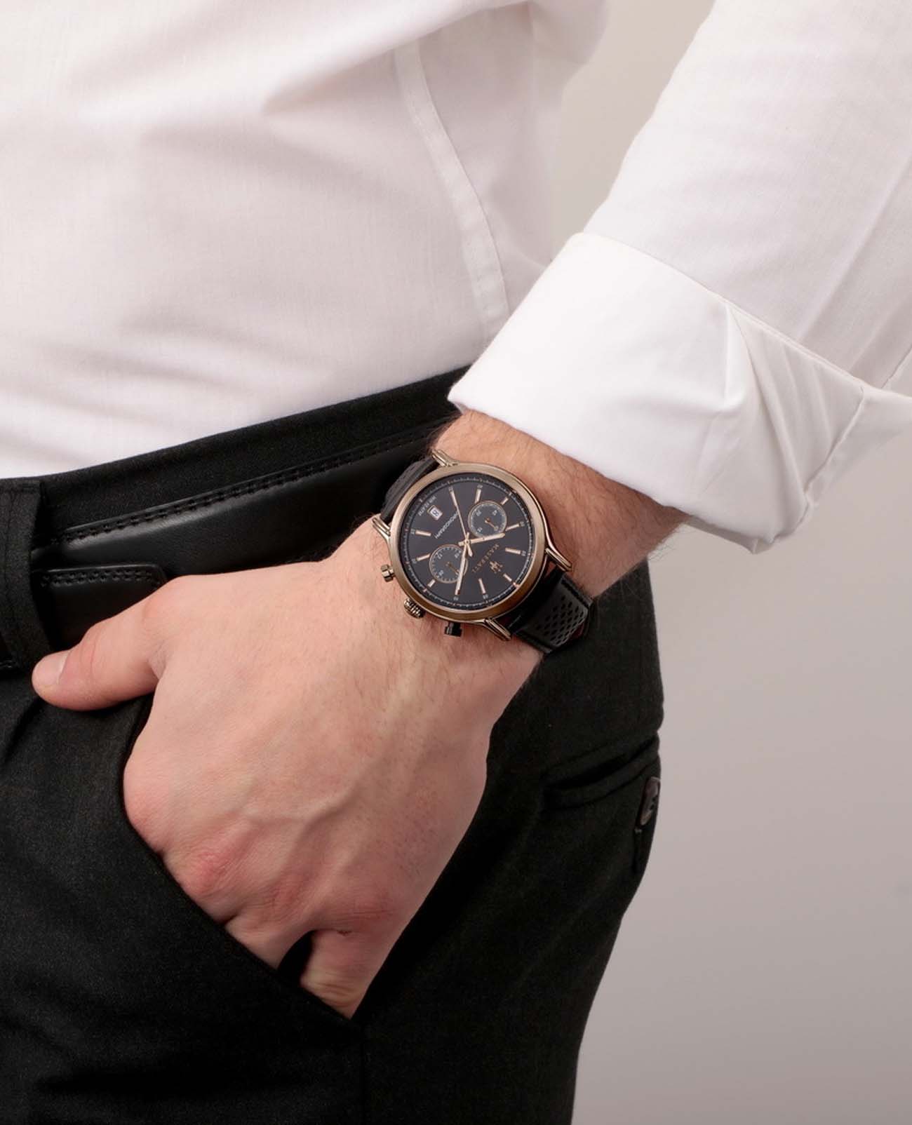 Мужские итальянские часы-хронографХронографФункция позволяет измерять отрезки времени с особой точностью: часы, минуты, секунды. Верным признаком хронографа является наличие на циферблате 3 дополнительных окошек-счётчиков. Maserati Legend R8871638001, кварцевый механизм с высокой точностью. Корпус часов изготовлен из стали с PVD-покрытиемPVDУльтратонкое покрытие наносится в технике вакуумного напыления, сочетает в себе нитрид титана особой прочности со слоем золота или оксида хрома. Несёт в себе декоративную или защитную функцию.. Стрелки с люминесцентным покрытиемЛюминесцентное покрытиеПозволяет считывать показания времени в темноте. Производители наносят на стрелки, часовые индексы, безель или поверхность циферблата светонакопительный состав, дающий холодное свечение.. Класс водозащиты: 100 метров, позволит плавать, нырять и заниматься другими водными видами спорта. Кожаный ремешок на стандартной застежке.