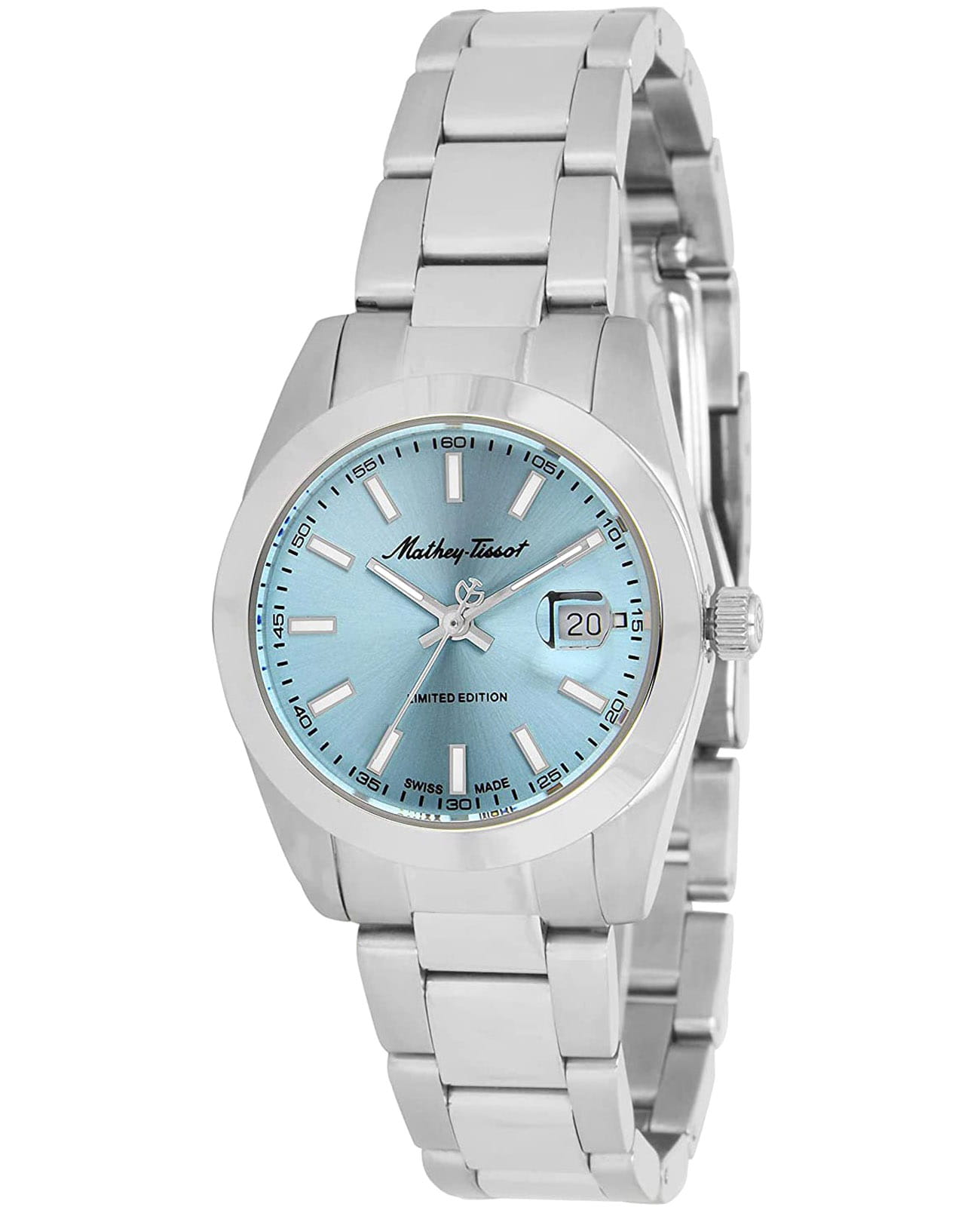 Женские кварцевые часы Mathey-Tissot Mathy D451BU — это стильное сочетание элегантности и современного дизайна. Лимитированная серия. Изящный корпус выполнен из нержавеющей стали, диаметром 32 мм, что придаст образу женственности и романтизма. Изысканный циферблат с метками в виде штрихов придает модели особый блеск. Циферблат защищен минеральным стекломМинеральное стеклоМинеральное стекло представляет собой искусственно выращенный минерал кварца. Такое стекло отличается особой устойчивостью к повреждениям и царапинам. Уступает по некоторым качествам сапфировому стеклу., обеспечивающий устойчивость к царапинам. Стрелки и метки с люминесцентным покрытиемЛюминесцентное покрытиеПозволяет считывать показания времени в темноте. Производители наносят на стрелки, часовые индексы, безель или поверхность циферблата светонакопительный состав, дающий холодное свечение.. Окошко даты находится в положении 3 часа. Часы оснащены надежным кварцевым механизмом. Стальной браслет на раскладной застёжке с фиксаторомРаскладная застёжкаТакой тип застёжки используется только на браслетах из металла. Она никогда не раскрывается полностью, происходит разделение на 2 и более частей. Раскладывающая застёжка снизит вероятность потери часов к минимуму., гарантирует комфортное и безопасное ношение. Класс водозащиты: 50 метров позволит защитить корпус от случайных брызг или капель дождя. Mathey-Tissot  — отличный выбор для тех, кто ценит утонченность и качество.
