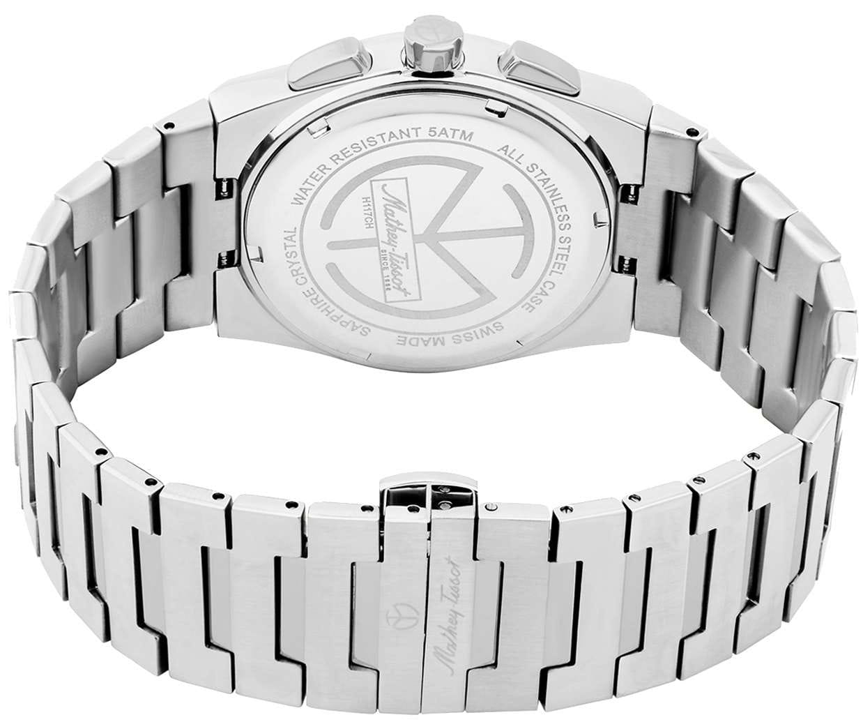 Мужские кварцевые часы-хронографХронографФункция позволяет измерять отрезки времени с особой точностью: часы, минуты, секунды. Верным признаком хронографа является наличие на циферблате 3 дополнительных окошек-счётчиков. Mathey-Tissot Zoltan H117CHAS — это стильное сочетание элегантности и современного дизайна. Изящный корпус выполнен из нержавеющей стали, диаметром 42 мм, что придаст образу элегантности и надежности. Изысканный циферблат с метками в виде штрихов придает модели особый блеск. Циферблат защищен сапфировым стекломСапфировое стеклоПрочный и надёжный материал из кристалла сапфира синтетического происхождения, характеризующийся особой твёрдостью и устойчивостью к царапинам и повреждениям., обеспечивающий устойчивость к царапинам. Стрелки и метки с люминесцентным покрытиемЛюминесцентное покрытиеПозволяет считывать показания времени в темноте. Производители наносят на стрелки, часовые индексы, безель или поверхность циферблата светонакопительный состав, дающий холодное свечение.. Окошко даты находится в положении 4 часа. Часы оснащены надежным кварцевым механизмом. Стальной браслет на застёжке-бабочке с кнопкамиЗастёжка "бабочка"Такой вид застёжки дополняется предохранителями, помогающими избежать случайного раскрытия браслета. Обладают изящным исполнением. , гарантирует комфортное и безопасное ношение. Класс водозащиты: 50 метров позволит защитить корпус от случайных брызг или капель дождя. Mathey-Tissot  — отличный выбор для тех, кто ценит утонченность и качество.