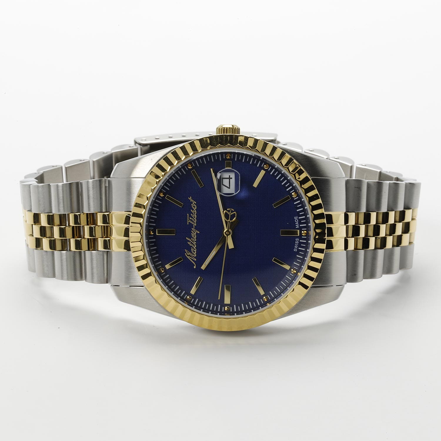 Мужские кварцевые часы Mathey-Tissot Mathy H810BBU — это стильное сочетание элегантности и современного дизайна. Изящный корпус выполнен из нержавеющей стали, диаметром 40 мм, что придаст образу элегантности и надежности. Изысканный циферблат с метками в виде штрихов придает модели особый блеск. Циферблат защищен минеральным стекломМинеральное стеклоМинеральное стекло представляет собой искусственно выращенный минерал кварца. Такое стекло отличается особой устойчивостью к повреждениям и царапинам. Уступает по некоторым качествам сапфировому стеклу., обеспечивает устойчивость к царапинам. Стрелки с люминесцентным покрытиемЛюминесцентное покрытиеПозволяет считывать показания времени в темноте. Производители наносят на стрелки, часовые индексы, безель или поверхность циферблата светонакопительный состав, дающий холодное свечение., которое светится в темноте после непродолжительной зарядки на свету. БезельБезельВнешний ободок, закрепляющий стекло. В спортивных часах так называется поворотное кольцо с делениями на циферблате, выполняет роль таймера – замеряет отрезки времени на шкале. Неподвижный безель – элемент декора. Однонаправленно вращающийся безель на дайверских часах позволяет фиксировать моменты погружения и выныривания на поверхность. с PVD-покрытиемPVDУльтратонкое покрытие наносится в технике вакуумного напыления, сочетает в себе нитрид титана особой прочности со слоем золота или оксида хрома. Несёт в себе декоративную или защитную функцию. золотистого цвета. Окошко даты находится в положении 3 часа. Часы оснащены надежным кварцевым механизмом. Стальной браслет с частичным PVD-покрытиемPVDУльтратонкое покрытие наносится в технике вакуумного напыления, сочетает в себе нитрид титана особой прочности со слоем золота или оксида хрома. Несёт в себе декоративную или защитную функцию. на раскладной застёжке с фиксаторомРаскладная застёжкаТакой тип застёжки используется только на браслетах из металла. Она никогда не раскрывается полностью, происходит разделение на 2 и более частей. Раскладывающая застёжка снизит вероятность потери часов к минимуму., гарантирует комфортное и безопасное ношение. Рифленая заводная головка. Класс водозащиты: 50 метров позволит защитить корпус от случайных брызг или капель дождя. Mathey-Tissot  — отличный выбор для тех, кто ценит утонченность и качество.