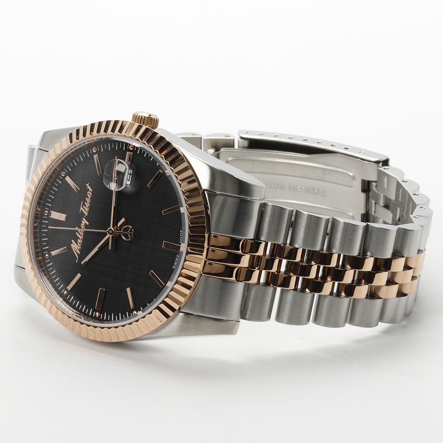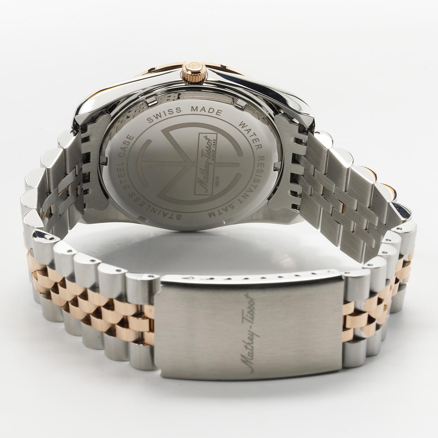 Мужские кварцевые часы Mathey-Tissot Mathy H810RN — это стильное сочетание элегантности и современного дизайна. Изящный корпус выполнен из нержавеющей стали, диаметром 40 мм, что придаст образу элегантности и надежности. Изысканный циферблат с метками в виде штрихов придает модели особый блеск. Циферблат защищен минеральным стекломМинеральное стеклоМинеральное стекло представляет собой искусственно выращенный минерал кварца. Такое стекло отличается особой устойчивостью к повреждениям и царапинам. Уступает по некоторым качествам сапфировому стеклу., обеспечивает устойчивость к царапинам. Стрелки с люминесцентным покрытиемЛюминесцентное покрытиеПозволяет считывать показания времени в темноте. Производители наносят на стрелки, часовые индексы, безель или поверхность циферблата светонакопительный состав, дающий холодное свечение., которое светится в темноте после непродолжительной зарядки на свету. БезельБезельВнешний ободок, закрепляющий стекло. В спортивных часах так называется поворотное кольцо с делениями на циферблате, выполняет роль таймера – замеряет отрезки времени на шкале. Неподвижный безель – элемент декора. Однонаправленно вращающийся безель на дайверских часах позволяет фиксировать моменты погружения и выныривания на поверхность. с PVD-покрытиемPVDУльтратонкое покрытие наносится в технике вакуумного напыления, сочетает в себе нитрид титана особой прочности со слоем золота или оксида хрома. Несёт в себе декоративную или защитную функцию. цвета розового золота. Окошко даты находится в положении 3 часа. Часы оснащены надежным кварцевым механизмом. Стальной браслет с частичным PVD-покрытиемPVDУльтратонкое покрытие наносится в технике вакуумного напыления, сочетает в себе нитрид титана особой прочности со слоем золота или оксида хрома. Несёт в себе декоративную или защитную функцию. на раскладной застёжке с фиксаторомРаскладная застёжкаТакой тип застёжки используется только на браслетах из металла. Она никогда не раскрывается полностью, происходит разделение на 2 и более частей. Раскладывающая застёжка снизит вероятность потери часов к минимуму., гарантирует комфортное и безопасное ношение. Рифленая заводная головка. Класс водозащиты: 50 метров позволит защитить корпус от случайных брызг или капель дождя. Mathey-Tissot — отличный выбор для тех, кто ценит утонченность и качество.