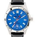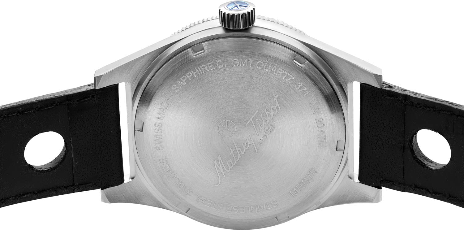 Мужские кварцевые часы Mathey-Tissot Mergulhador GMTGMTОтображение времени второго часового пояса.Такая функция особенно актуальна для путешественников и бизнесменов,которые общаются с людьми из разных стран,теперь вы всегда будете знать,какой час у вашего партнёра или близкого человека. MRGABU — это стильное сочетание элегантности и современного дизайна. Изящный корпус выполнен из нержавеющей стали, диаметром 41 мм, что придаст образу элегантности и надежности. Циферблат с метками в виде штрихов придает модели особый блеск. Циферблат защищен минеральным стекломМинеральное стеклоМинеральное стекло представляет собой искусственно выращенный минерал кварца. Такое стекло отличается особой устойчивостью к повреждениям и царапинам. Уступает по некоторым качествам сапфировому стеклу. с сапфировым покрытием, обеспечивает устойчивость к царапинам. Второй часовой поясВторой часовой поясФункция, позволяющая отображать время двух часовых поясов одновременно. в 24-х часовом формате времени отображается центральной стрелкой. Стрелки и метки с люминесцентным покрытиемЛюминесцентное покрытиеПозволяет считывать показания времени в темноте. Производители наносят на стрелки, часовые индексы, безель или поверхность циферблата светонакопительный состав, дающий холодное свечение. SuperLumiNova, которое светится в темноте после непродолжительной зарядки на свету. Окошко даты находится в положении 6 часов.  Рифленый безельБезельВнешний ободок, закрепляющий стекло. В спортивных часах так называется поворотное кольцо с делениями на циферблате, выполняет роль таймера – замеряет отрезки времени на шкале. Неподвижный безель – элемент декора. Однонаправленно вращающийся безель на дайверских часах позволяет фиксировать моменты погружения и выныривания на поверхность. с минутными отметками вращается в одном направлении. Часы оснащены надежным кварцевым механизмом. Кожаный ремешок на стандартной застёжке гарантирует комфортное и безопасное ношение. Класс водозащиты: 200 метров позволит плавать, нырять и заниматься другими водными видами спорта. Mathey-Tissot  — отличный выбор для тех, кто ценит утонченность и качество.