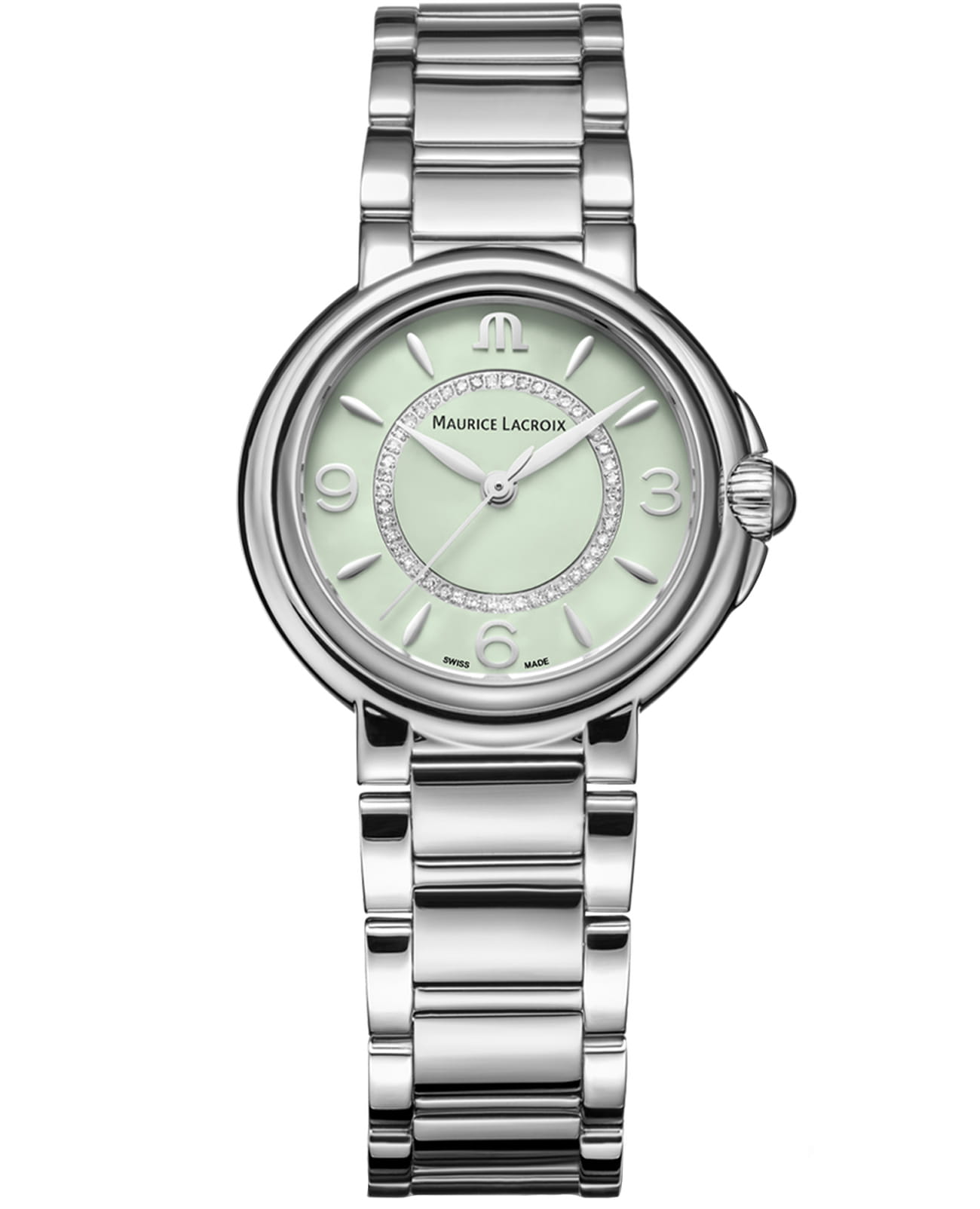 Часы Maurice Lacroix FIABA Colours Edition (артикул FA1104-SS002-G20-1) — элегантная женская модель, сочетающая изысканный дизайн и швейцарское качество. Корпус диаметром 32 мм выполнен из нержавеющей стали с водозащитой до 5 ATM (50 метров). Зелёный циферблат украшен 46 бриллиантами и защищён сапфировым стекломСапфировое стеклоПрочный и надёжный материал из кристалла сапфира синтетического происхождения, характеризующийся особой твёрдостью и устойчивостью к царапинам и повреждениям. с двойным антибликовым покрытием.
