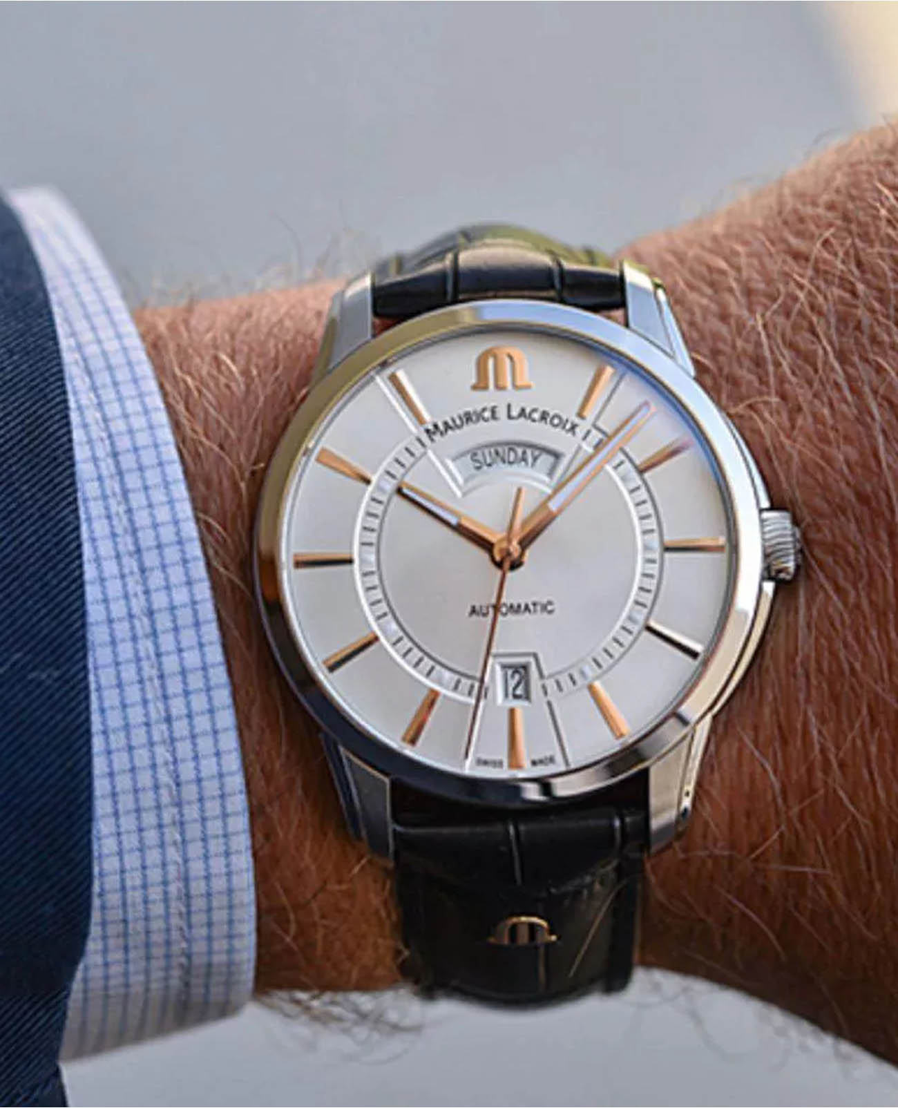 Мужские швейцарские часы Maurice Lacroix Pontos Day Date PT6358-SS001-230-2, механический механизм (автоматический калибр) с высокой точностью. Часы PONTOS являются образцом элегантности и утонченности и в то же время подтверждают нашу репутацию производителя доступных часов класса люкс.В механизме 26 камней, частота 28800 полуколебаний в час. Запас хода 38 часов. Сапфировое стеклоСапфировое стеклоПрочный и надёжный материал из кристалла сапфира синтетического происхождения, характеризующийся особой твёрдостью и устойчивостью к царапинам и повреждениям. устойчивое к появлению царапин, обладающее высокой прозрачностью. Корпус изготовлен из нержавеющей стали. Стрелки с люминесцентным покрытиемЛюминесцентное покрытиеПозволяет считывать показания времени в темноте. Производители наносят на стрелки, часовые индексы, безель или поверхность циферблата светонакопительный состав, дающий холодное свечение.. Окошко даты в положении 3 часов, окошда дня недели в положении 12 часов. Класс водозащиты: 100 метров, позволит плавать, нырять и заниматься другими водными видами спорта. Кожаный ремешок на застёжке-бабочке с кнопкамиЗастёжка "бабочка"Такой вид застёжки дополняется предохранителями, помогающими избежать случайного раскрытия браслета. Обладают изящным исполнением. .