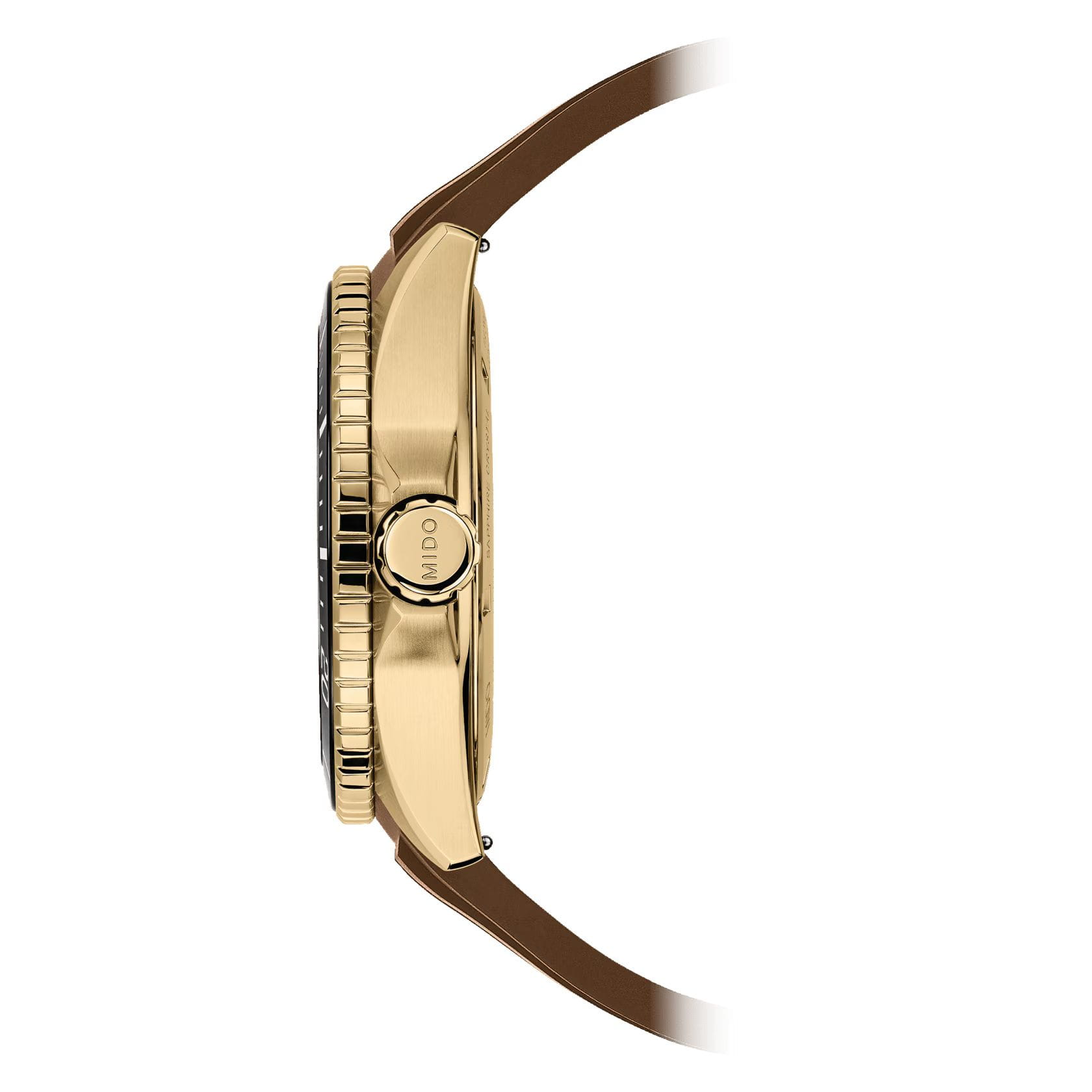 Часы MIDO Ocean Star GMT (артикул M026.629.37.291.00) сочетают элегантность и функциональность, идеально подходя для путешественников и любителей водных видов спорта. Корпус диаметром 44 мм выполнен из нержавеющей стали с керамическим безелем и водозащитой до 20 бар (200 метров). Завинчивающаяся заводная головка и накладные часовые метки, покрытые люминесцентным покрытиемЛюминесцентное покрытиеПозволяет считывать показания времени в темноте. Производители наносят на стрелки, часовые индексы, безель или поверхность циферблата светонакопительный состав, дающий холодное свечение.обеспечивают удобство и надёжность. Чёрный циферблат защищён сапфировым стекломСапфировое стеклоПрочный и надёжный материал из кристалла сапфира синтетического происхождения, характеризующийся особой твёрдостью и устойчивостью к царапинам и повреждениям.. Модель оснащена автоматическим механизмом MIDO Caliber 80, обеспечивающим запас хода до 80 часов. Функционал включает индикацию часов, минут, секунд, даты в положении «3 часа» и второго часового пояса GMTGMTОтображение времени второго часового пояса.Такая функция особенно актуальна для путешественников и бизнесменов,которые общаются с людьми из разных стран,теперь вы всегда будете знать,какой час у вашего партнёра или близкого человека.. Коричневый ремешок с раскладной застёжкойРаскладная застёжкаТакой тип застёжки используется только на браслетах из металла. Она никогда не раскрывается полностью, происходит разделение на 2 и более частей. Раскладывающая застёжка снизит вероятность потери часов к минимуму. с удлинением для дайвинга обеспечивает комфортное ношение и стильный внешний вид. На задней крышке выгравированы часовые пояса, что упрощает настройку времени при путешествиях. Эти часы идеально подходят как для повседневного ношения, так и для приключений.