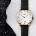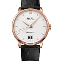 Часы Mido Baroncelli Big Date M027.426.36.018.00 — это элегантный мужской аксессуар, сочетающий классический дизайн и современные технологии. Корпус диаметром 40 мм выполнен из нержавеющей стали с розовым PVD-покрытиемPVDУльтратонкое покрытие наносится в технике вакуумного напыления, сочетает в себе нитрид титана особой прочности со слоем золота или оксида хрома. Несёт в себе декоративную или защитную функцию., что придаёт часам утончённый вид. Белый циферблат с римскими цифрами и стрелками защищён сапфировым стекломСапфировое стеклоПрочный и надёжный материал из кристалла сапфира синтетического происхождения, характеризующийся особой твёрдостью и устойчивостью к царапинам и повреждениям. с двойным антибликовым покрытиемАнтибликовое покрытиеСлой оксида металла в 0,13-0,3 микрон, благодаря которому стекло часов не бликует и не отражает свет. Антибликовое покрытие уменьшает отражение света в 10 раз, обеспечивая отличную читаемость показателей циферблата., устойчивым к царапинам и бликам.