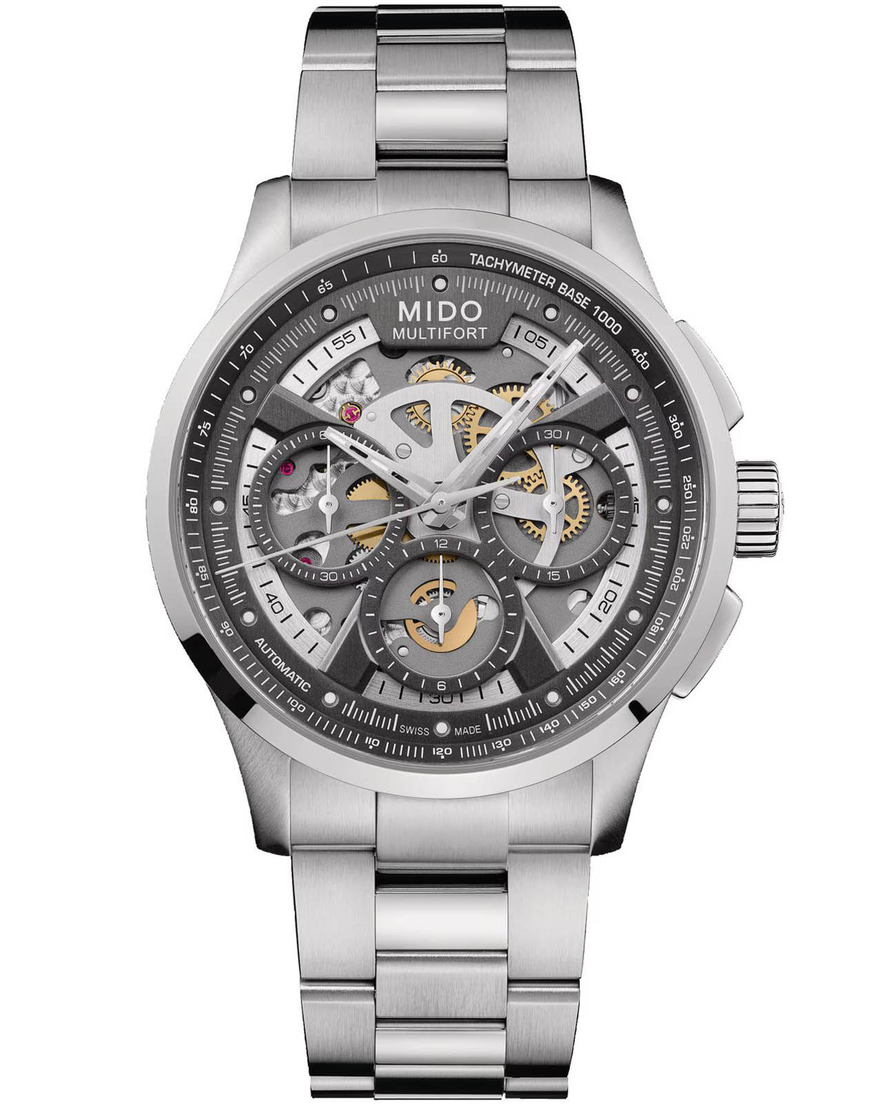 Швейцарские мужские наручные часы Mido Multifort Skeleton Chronograph M038.662.11.060.00, механический механизм с высокой точностью. Циферблат c сапфировым стекломСапфировое стеклоПрочный и надёжный материал из кристалла сапфира синтетического происхождения, характеризующийся особой твёрдостью и устойчивостью к царапинам и повреждениям., устойчивым к появлению царапин и обладающее высокой прозрачностью. Часы оснащены люминесцентным покрытиемЛюминесцентное покрытиеПозволяет считывать показания времени в темноте. Производители наносят на стрелки, часовые индексы, безель или поверхность циферблата светонакопительный состав, дающий холодное свечение., обеспечивающим отличную видимость даже при слабом освещении. Класс водозащиты: 100 метров, позволит плавать, нырять и заниматься другими водными видами спорта. Корпус часов изготовлен из стали. Часы с балансом из Nivachron™Nivachron™Специально разработанный инновационный сплав Nivachron™ повышает устойчивость часов к воздействию магнитных полей., обеспечивающим высокую устойчивость к магнитным полям и ударам. Часы с функциями хронографаХронографФункция позволяет измерять отрезки времени с особой точностью: часы, минуты, секунды. Верным признаком хронографа является наличие на циферблате 3 дополнительных окошек-счётчиков. и тахиметраТахиметрРазмеченная шкала, располагается на ободке или безеле часов. Тахиметр позволяет рассчитать скорость на определённом участке пути, расстояние измеряется в километрах или милях.. Браслет из стали с раскладной застёжкойРаскладная застёжкаТакой тип застёжки используется только на браслетах из металла. Она никогда не раскрывается полностью, происходит разделение на 2 и более частей. Раскладывающая застёжка снизит вероятность потери часов к минимуму. обеспечивает комфортное ношение.