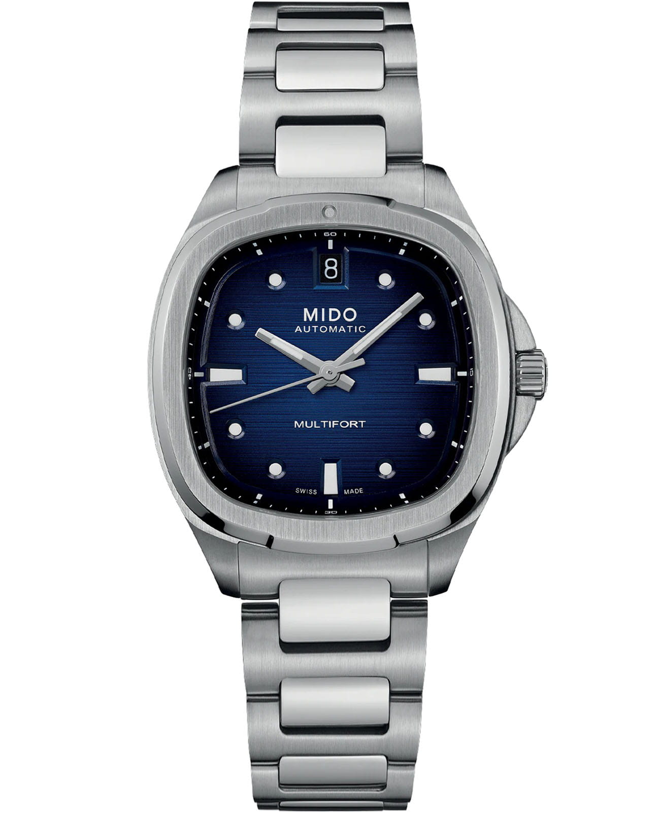 Женские швейцарские механические часы Mido Multifort TV 35 M049.307.11.041.00, механический механизм с высокой точностью.  Циферблат c сапфировым стекломСапфировое стеклоПрочный и надёжный материал из кристалла сапфира синтетического происхождения, характеризующийся особой твёрдостью и устойчивостью к царапинам и повреждениям., устойчивым к появлению царапин и обладающее высокой прозрачностью. Класс водозащиты: 100 метров. Корпус часов изготовлен из стали. Часы с балансом из Nivachron™Nivachron™Специально разработанный инновационный сплав Nivachron™ повышает устойчивость часов к воздействию магнитных полей., обеспечивающим высокую устойчивость к магнитным полям и ударам, а также оснащены люминесцентным покрытиемЛюминесцентное покрытиеПозволяет считывать показания времени в темноте. Производители наносят на стрелки, часовые индексы, безель или поверхность циферблата светонакопительный состав, дающий холодное свечение., обеспечивающим отличную видимость даже при слабом освещении. Браслет из стали с раскладной застёжкойРаскладная застёжкаТакой тип застёжки используется только на браслетах из металла. Она никогда не раскрывается полностью, происходит разделение на 2 и более частей. Раскладывающая застёжка снизит вероятность потери часов к минимуму. обеспечивает комфортное ношение. Окошко даты в положении 12 часов.
