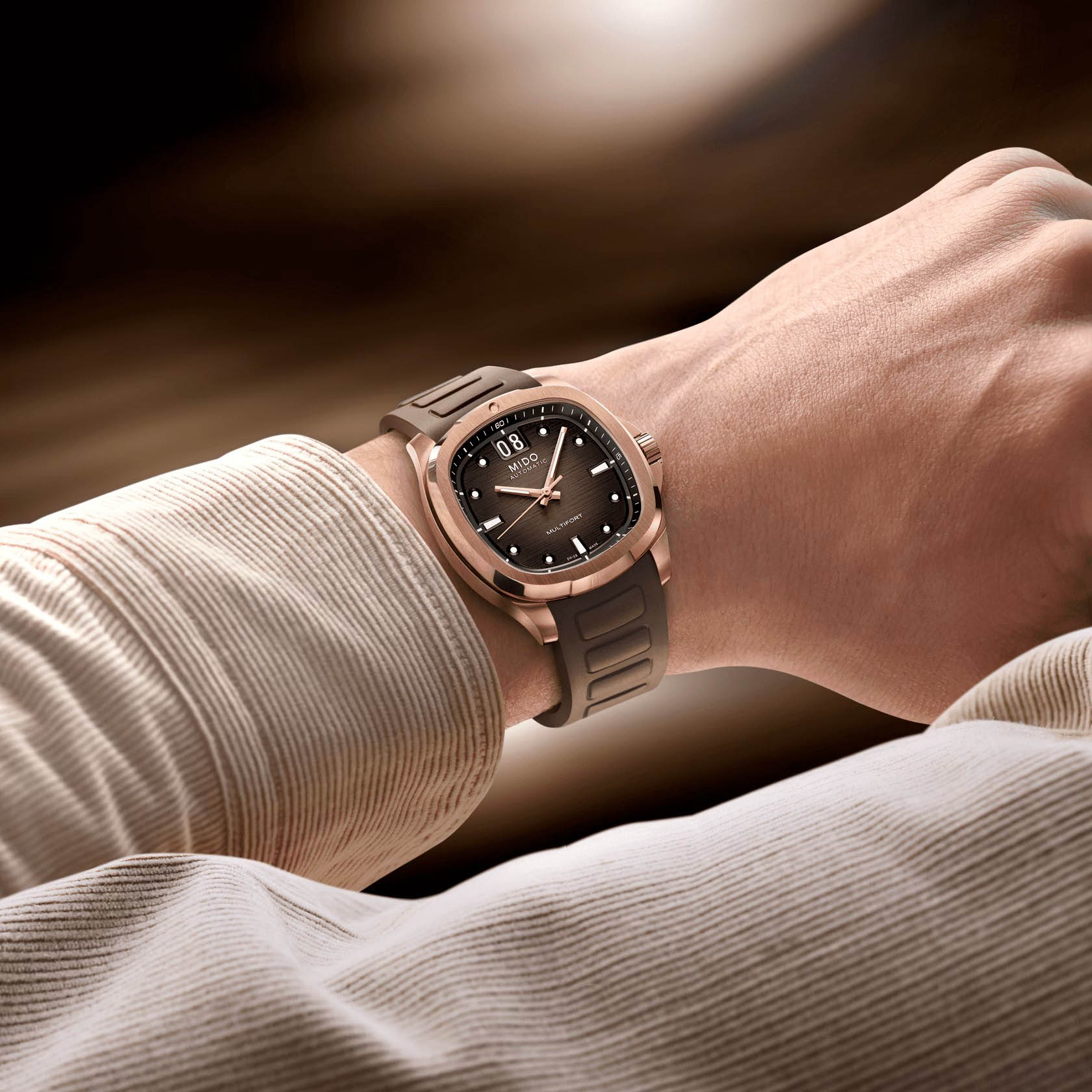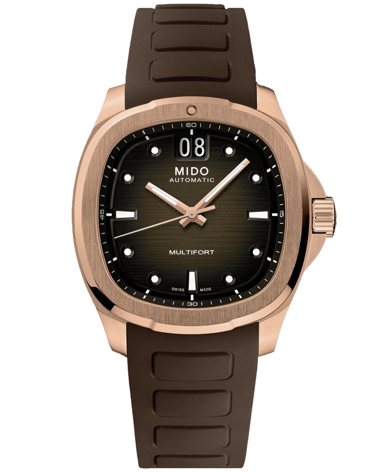 Мужские механические швейцарские часы Mido Multifort TV Big Date M049.526.37.291.00, механический механизм (автоматический калибр) с высокой точностью. Сапфировое стеклоСапфировое стеклоПрочный и надёжный материал из кристалла сапфира синтетического происхождения, характеризующийся особой твёрдостью и устойчивостью к царапинам и повреждениям. устойчивое к появлению царапин, обладающее высокой прозрачностью. Корпус часов изготовлен из нержавеющей стали с PVD-покрытиемPVDУльтратонкое покрытие наносится в технике вакуумного напыления, сочетает в себе нитрид титана особой прочности со слоем золота или оксида хрома. Несёт в себе декоративную или защитную функцию. в форме телевизора, столь же впечатляющий, сколь и точный, благодаря своему мощному механическому механизму. Современный и динамичный дизайн этих швейцарских часов подчеркивается ярким горизонтальным циферблатом с матовой отделкой, а также их отличительной функцией: большой датой в положении 12 часов. Стрелки с люминесцентным покрытиемЛюминесцентное покрытиеПозволяет считывать показания времени в темноте. Производители наносят на стрелки, часовые индексы, безель или поверхность циферблата светонакопительный состав, дающий холодное свечение.. Мощный автоматический механизм последнего поколения Calibre 80 оснащен высокотехнологичной балансировочной пружиной Nivachron ™ , которая обеспечивает исключительную устойчивость к ударам и магнитным полям. Класс водозащиты: 100 метров, позволит плавать, нырять и заниматься другими водными видами спорта. Каучуковый ремешок на стандартной застежке.
