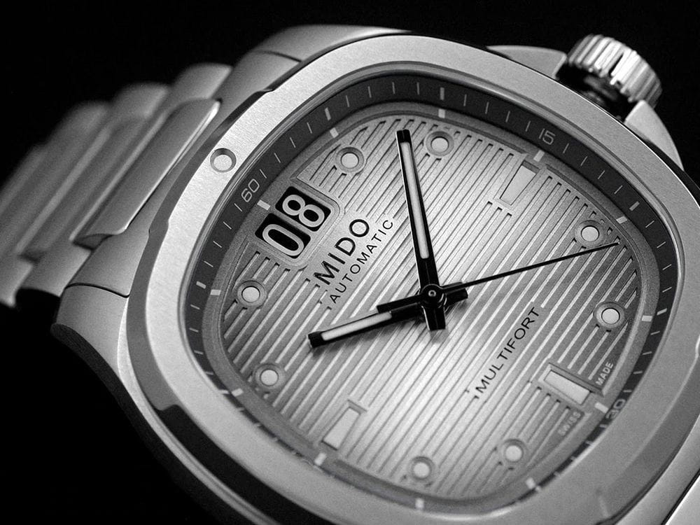 Мужские механические швейцарские часы Mido Multifort TV Big Date M049.526.44.081.00, механический механизм (автоматический калибр) с высокой точностью. Сапфировое стеклоСапфировое стеклоПрочный и надёжный материал из кристалла сапфира синтетического происхождения, характеризующийся особой твёрдостью и устойчивостью к царапинам и повреждениям. устойчивое к появлению царапин, обладающее высокой прозрачностью. Корпус часов изготовлен из нержавеющей стали в форме телевизора, столь же впечатляющий, сколь и точный, благодаря своему мощному механическому механизму. Современный и динамичный дизайн этих швейцарских часов подчеркивается ярким горизонтальным циферблатом с матовой отделкой, а также их отличительной функцией: большой датой в положении 12 часов. Стрелки с люминесцентным покрытиемЛюминесцентное покрытиеПозволяет считывать показания времени в темноте. Производители наносят на стрелки, часовые индексы, безель или поверхность циферблата светонакопительный состав, дающий холодное свечение.. Мощный автоматический механизм последнего поколения Calibre 80 оснащен высокотехнологичной балансировочной пружиной Nivachron ™ , которая обеспечивает исключительную устойчивость к ударам и магнитным полям. Класс водозащиты: 100 метров, позволит плавать, нырять и заниматься другими водными видами спорта. Стальной браслет на раскладной застёжкеРаскладная застёжкаТакой тип застёжки используется только на браслетах из металла. Она никогда не раскрывается полностью, происходит разделение на 2 и более частей. Раскладывающая застёжка снизит вероятность потери часов к минимуму..