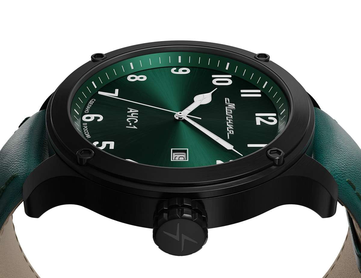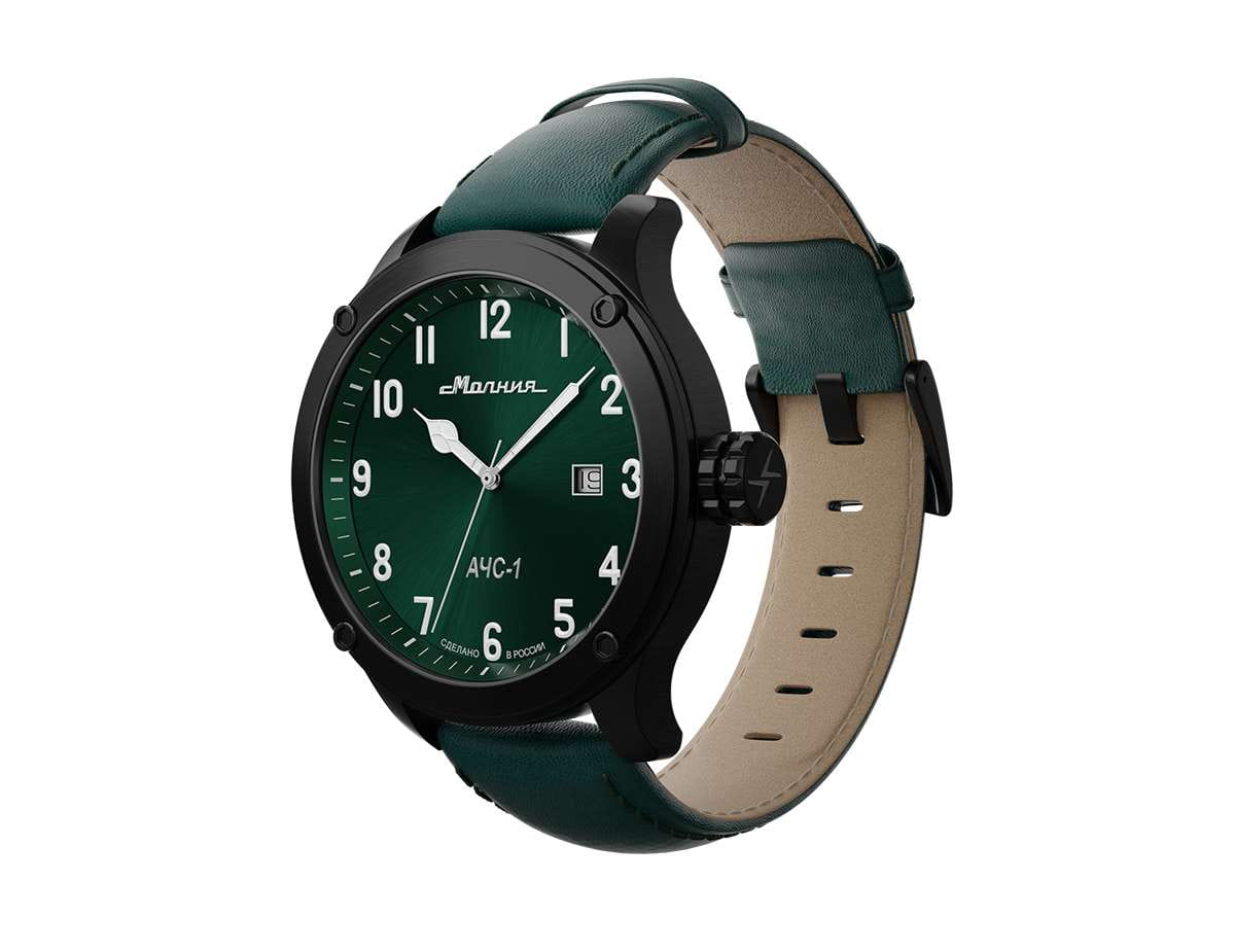 Мужские механические часы с автоподзаводом — это надёжный аксессуар от легендарного бренда «МОЛНИЯ», созданного на Челябинском часовом заводе. Корпус диаметром 44 мм и высотой 12 мм выполнен из нержавеющей стали 316L с IP-покрытиемIP-покрытиеМетод ионного напыления. Демонстрирует повышенную устойчивость к истиранию, окислению и химическим веществам. Под воздействием высокого давления и температуры около 1500°C молекулы металла надёжно соединяются с частицами корпуса часов.. Циферблат зелёного цвета матовый, оформлен стрелками и индексами с люминесцентным покрытиемЛюминесцентное покрытиеПозволяет считывать показания времени в темноте. Производители наносят на стрелки, часовые индексы, безель или поверхность циферблата светонакопительный состав, дающий холодное свечение. Super-LumiNova. Окошко даты расположено в положении 3 часов. Циферблат защищён сапфировым стекломСапфировое стеклоПрочный и надёжный материал из кристалла сапфира синтетического происхождения, характеризующийся особой твёрдостью и устойчивостью к царапинам и повреждениям. толщиной 1,5 мм. Механизм — японский автоматический калибр Miyota 8215 с функцией и запасом хода 42 часа. Часы оснащены кожаным ремешком зелёного цвета шириной 22 мм с классической пряжкой. Водонепроницаемость 100 м позволяет использовать часы для плавания и повседневного ношения. Идеальный выбор для тех, кто ценит российское качество и мужественный дизайн.