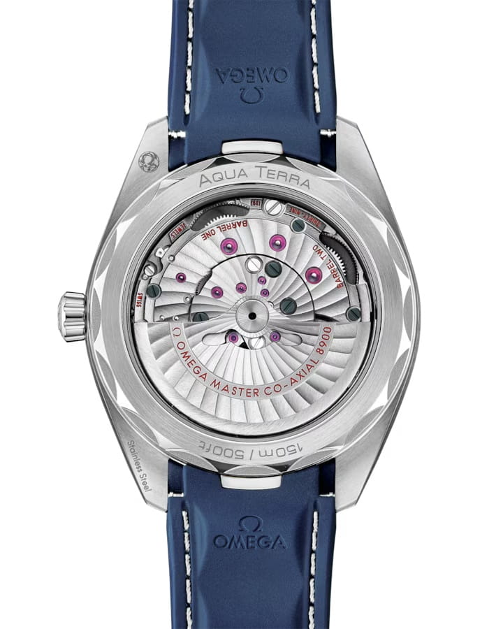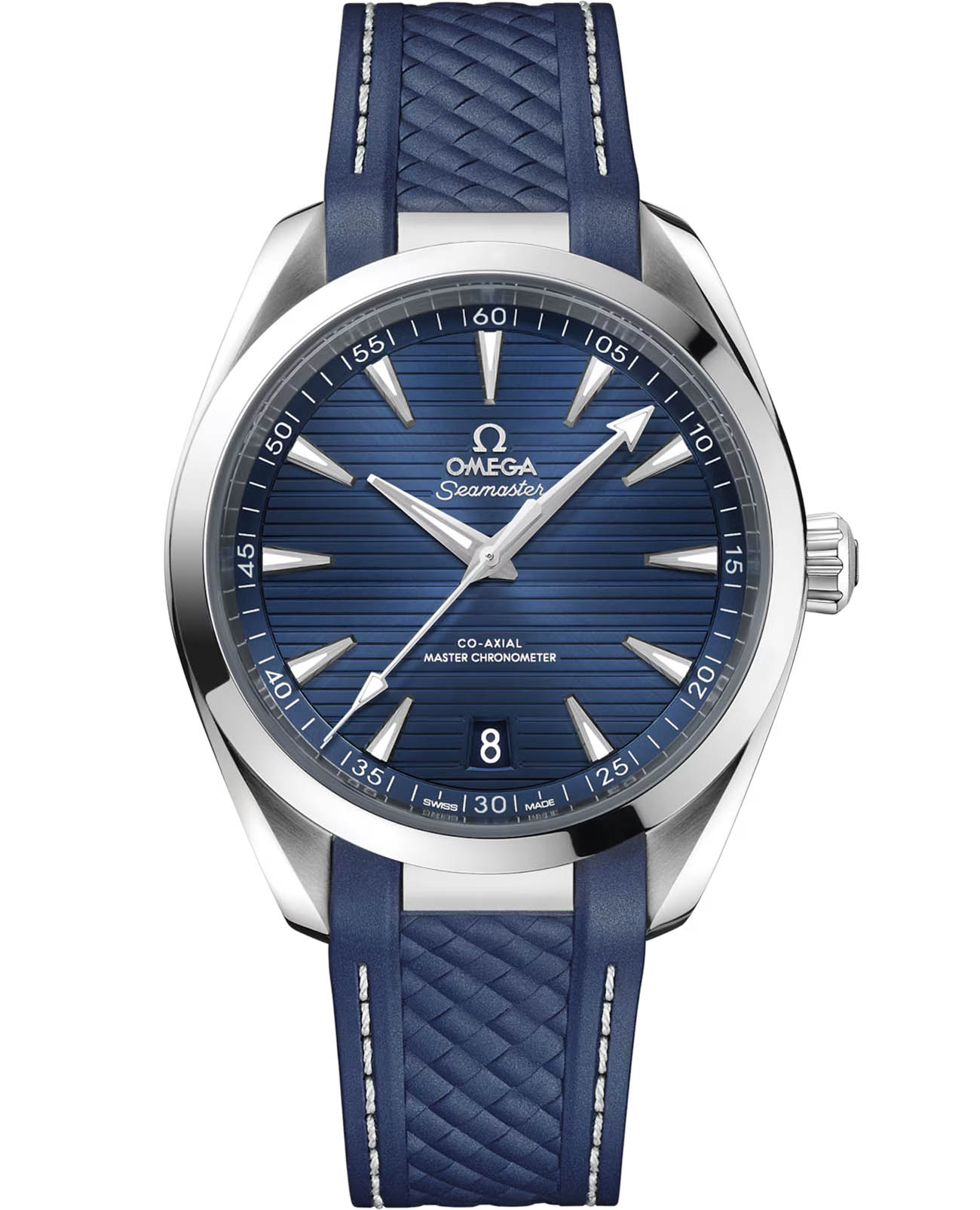Omega Seamaster Aqua Terra выполнены в симметричном корпусе из нержавеющей стали с завинчивающейся задней крышкой, украшенной волновым узором. Циферблат дополнен окошком даты на 6 часах и оформлен в виде горизонтального рисунка, вдохновлённого текстурой тикового дерева палуб яхт. Стрелки и метки оснащены люминесцентным покрытиемЛюминесцентное покрытиеПозволяет считывать показания времени в темноте. Производители наносят на стрелки, часовые индексы, безель или поверхность циферблата светонакопительный состав, дающий холодное свечение. Super-LumiNova для лучшей читаемости в темноте. Калибр Omega 8900 сертифицирован как Master Chronometer — гарантия высочайшей точности и устойчивости к магнитным полям. Запас хода составляет 60 часов. Защиту циферблата обеспечивает сапфировое стеклоСапфировое стеклоПрочный и надёжный материал из кристалла сапфира синтетического происхождения, характеризующийся особой твёрдостью и устойчивостью к царапинам и повреждениям. с антибликовым покрытиемАнтибликовое покрытиеСлой оксида металла в 0,13-0,3 микрон, благодаря которому стекло часов не бликует и не отражает свет. Антибликовое покрытие уменьшает отражение света в 10 раз, обеспечивая отличную читаемость показателей циферблата.. Водозащита позволяет использовать часы в воде без риска повреждения. Часы установлены на структурированный резиновый ремешок с дополнительным стальным звеном для интеграции с корпусом. Это сочетание премиального качества, технологичности и классического дизайна.
