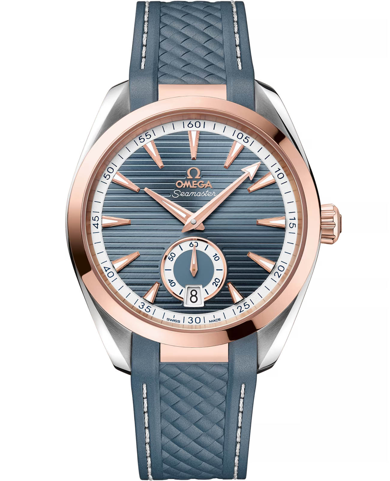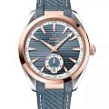 Мужские наручные часы Omega Seamaster Aqua Terra выполнены в корпусе из нержавеющей стали и 18К Sedna™ золота , диаметром 41 мм , толщиной 13,2 мм , ширина между ушками — 20 мм , общий вес составляет около 116 граммов .Циферблат с горизонтальным узором «тиковое дерево» имеет окошко даты в положении 6 часов и дополнительный циферблат малой секундной стрелки с черным кольцом. Стрелки и индексы выполнены из 18К Sedna™ золота и покрыты белым люминесцентным составом Super-LumiNovaЛюминесцентное покрытиеПозволяет считывать показания времени в темноте. Производители наносят на стрелки, часовые индексы, безель или поверхность циферблата светонакопительный состав, дающий холодное свечение., обеспечивающим читаемость в темноте. Минутная шкала и малый циферблат дополнительно обработаны пескоструйным методом для повышения контраста. Стекло — выпуклое сапфировое стекло сапфировое стеклоСапфировое стеклоПрочный и надёжный материал из кристалла сапфира синтетического происхождения, характеризующийся особой твёрдостью и устойчивостью к царапинам и повреждениям. с двусторонним антибликовым покрытием антибликовое покрытиеАнтибликовое покрытиеСлой оксида металла в 0,13-0,3 микрон, благодаря которому стекло часов не бликует и не отражает свет. Антибликовое покрытие уменьшает отражение света в 10 раз, обеспечивая отличную читаемость показателей циферблата., задняя крышка прозрачная, украшена волнообразным узором. Механизм — механический с автоподзаводом , калибр OMEGA Master Chronometer 8916 , сертифицированный METAS и COSC. Обладает запасом хода до 60 часов , антимагнитными свойствами и точностью от 0 до +5 секунд в сутки благодаря коаксиальному спуску и балансу из кремния. Мосты и платина механизма имеют родиевое покрытие и декор Женевские волны. Водозащита — 15 АТМ (150 метров) , что позволяет использовать часы в воде, включая плавание и дайвинг. Часы оснащены каучуковым ремешком с текстурой и серой прошивкой , застёжка — раскладная, с двойной системой блокировки. Это технологичная модель для делового и активного образа жизни, сочетающая морское наследие, швейцарское качество и современные стандарты.