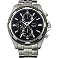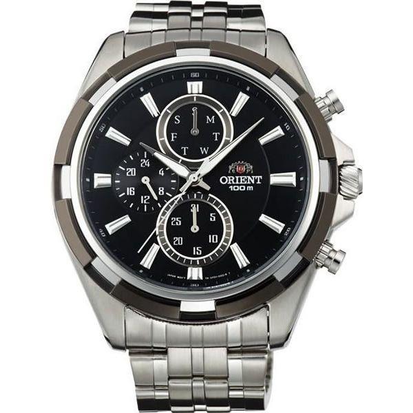 Спортивные кварцевые часы ORIENT диаметром 46 мм в корпусе и браслете из нержавеющей стали с черным циферблатом Отличительными особенностями модели являются дополнительный циферблат на 31 день, индикатор дня недели и дополнительный циферблат на 24 часа Оригинальный внешний вид часов дополняют люминесцентные стрелки, часовые метки, оформленные серебристым цветом, и контрастная красная секундная стрелка Спортивная модель UY07001B обладает водостойкостью до 100 метров