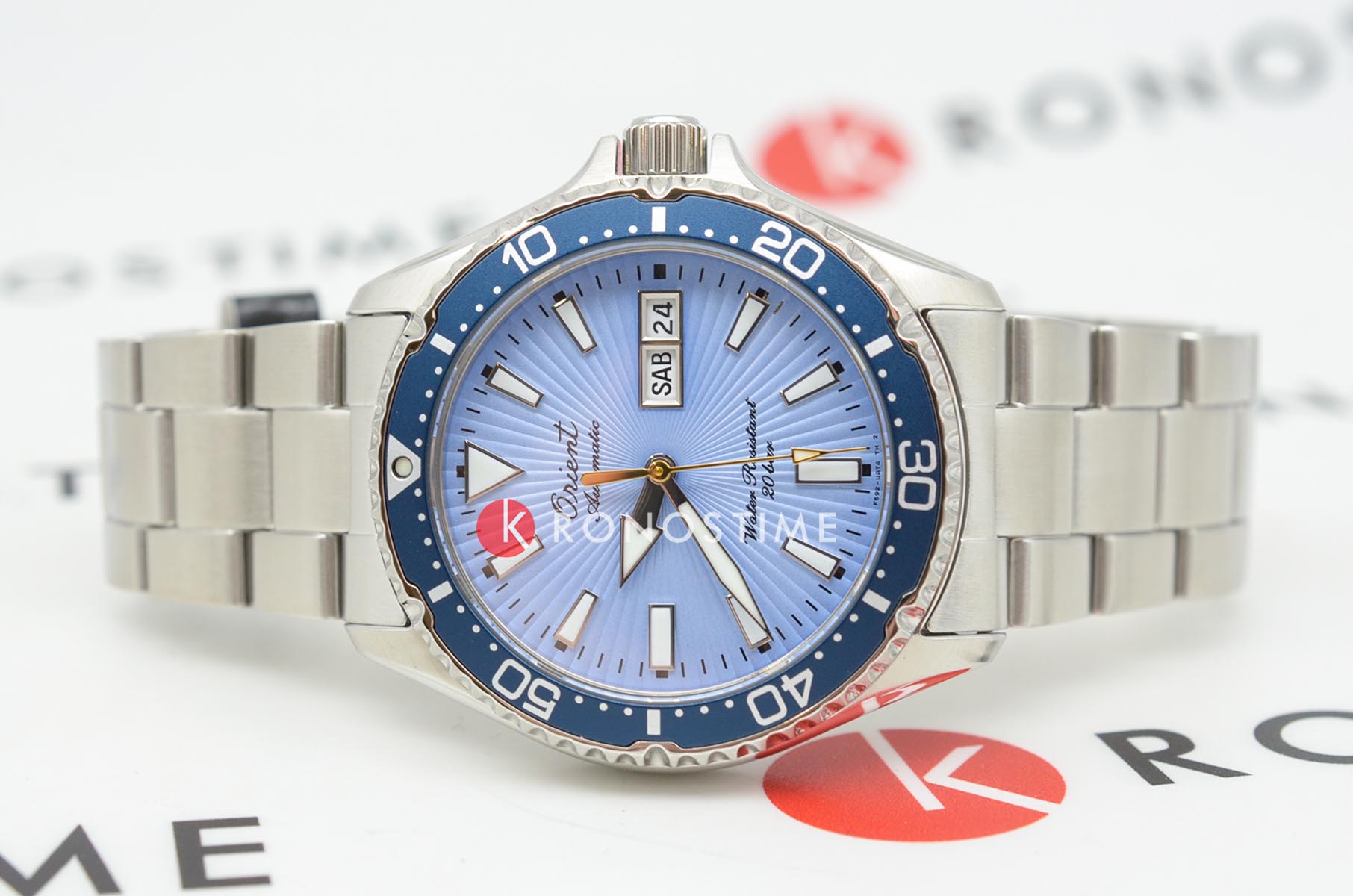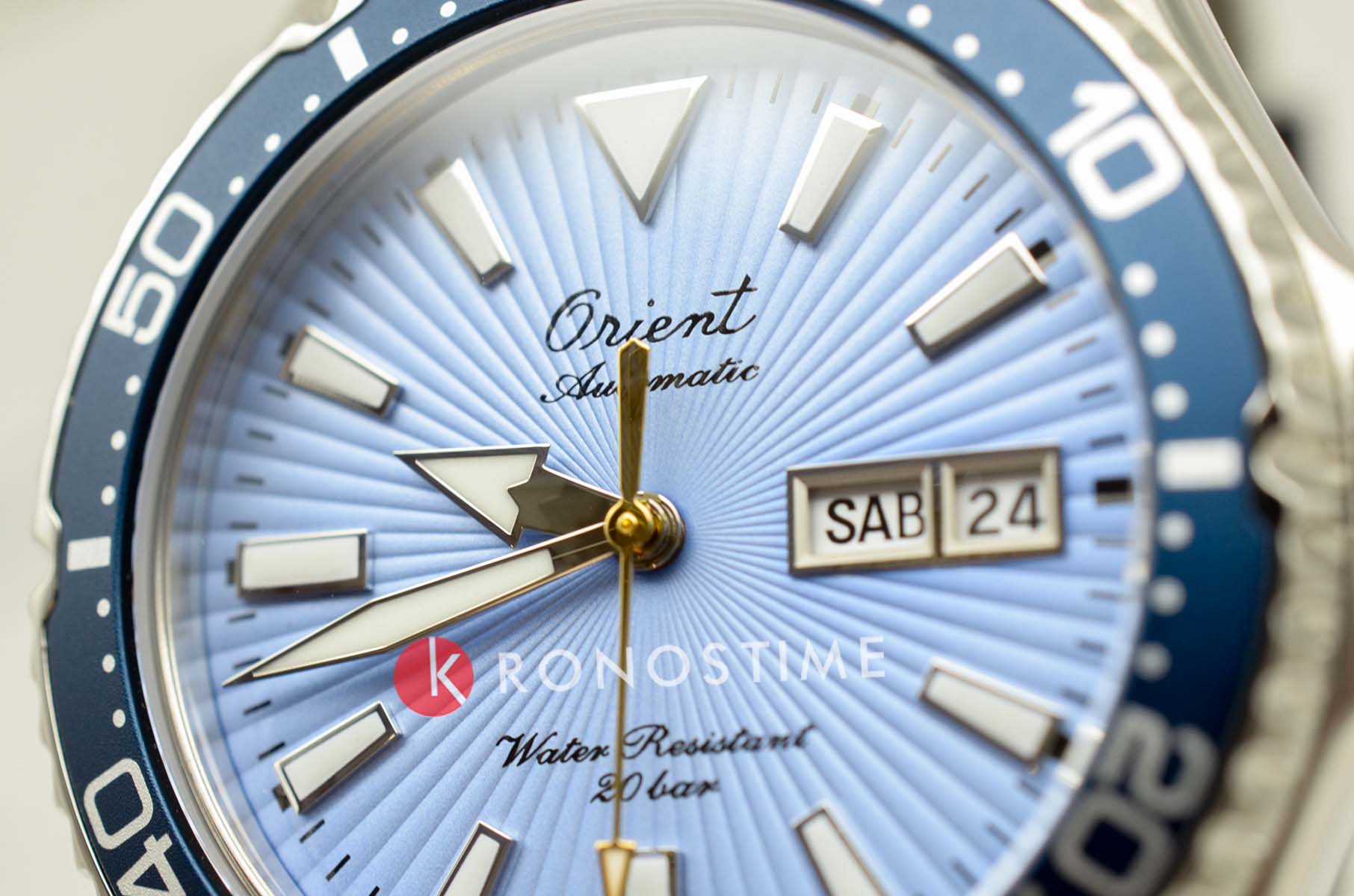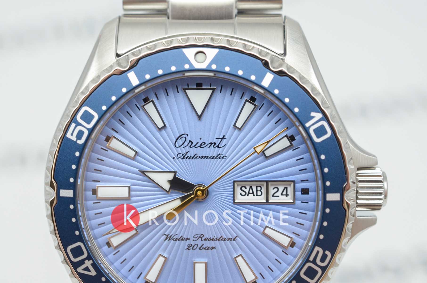 Циферблат выполнен в небесно-голубом оттенке с эффектом солнечных лучей. Эстетику подчёркивает винтажный логотип Orient, а крупные часовые метки и стрелки с люминесцентным покрытиемЛюминесцентное покрытиеПозволяет считывать показания времени в темноте. Производители наносят на стрелки, часовые индексы, безель или поверхность циферблата светонакопительный состав, дающий холодное свечение. обеспечивают отличную читаемость. Защиту обеспечивает устойчивое к царапинам сапфировое стеклоСапфировое стеклоПрочный и надёжный материал из кристалла сапфира синтетического происхождения, характеризующийся особой твёрдостью и устойчивостью к царапинам и повреждениям..