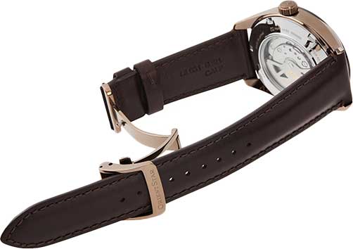 Компактный циферблат дополнен крупными часовыми метками и стрелками, такое исполнение позволяет идеально считывать показания времени. Дизайнеры акцентируют внимание на лаконичном оформлении, делая осуществимой возможность сочетать аксессуар с любой одеждой. Наручные часы оснащаются высокоточными механизмами собственного изготовления, ни одна деталь не изготавливается на сторонних производствах. Прочное сапфировое стеклоСапфировое стеклоПрочный и надёжный материал из кристалла сапфира синтетического происхождения, характеризующийся особой твёрдостью и устойчивостью к царапинам и повреждениям.