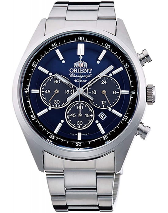 Мужские кварцевые часы-хронографХронографФункция позволяет измерять отрезки времени с особой точностью: часы, минуты, секунды. Верным признаком хронографа является наличие на циферблате 3 дополнительных окошек-счётчиков. Orient Sport WV0021TX. Корпус часов изготовлен из нержавеющей стали. Минеральное стеклоМинеральное стеклоМинеральное стекло представляет собой искусственно выращенный минерал кварца. Такое стекло отличается особой устойчивостью к повреждениям и царапинам. Уступает по некоторым качествам сапфировому стеклу. устойчивое к появлению царапин, обладающее высокой прозрачностью. Стальной браслет на раскладной застёжкеРаскладная застёжкаТакой тип застёжки используется только на браслетах из металла. Она никогда не раскрывается полностью, происходит разделение на 2 и более частей. Раскладывающая застёжка снизит вероятность потери часов к минимуму.. Водозащита: 100 метров, позволит плавать, нырять и заниматься другими водными видами спорта. Стрелки и метки с люминесцентным покрытиемЛюминесцентное покрытиеПозволяет считывать показания времени в темноте. Производители наносят на стрелки, часовые индексы, безель или поверхность циферблата светонакопительный состав, дающий холодное свечение..