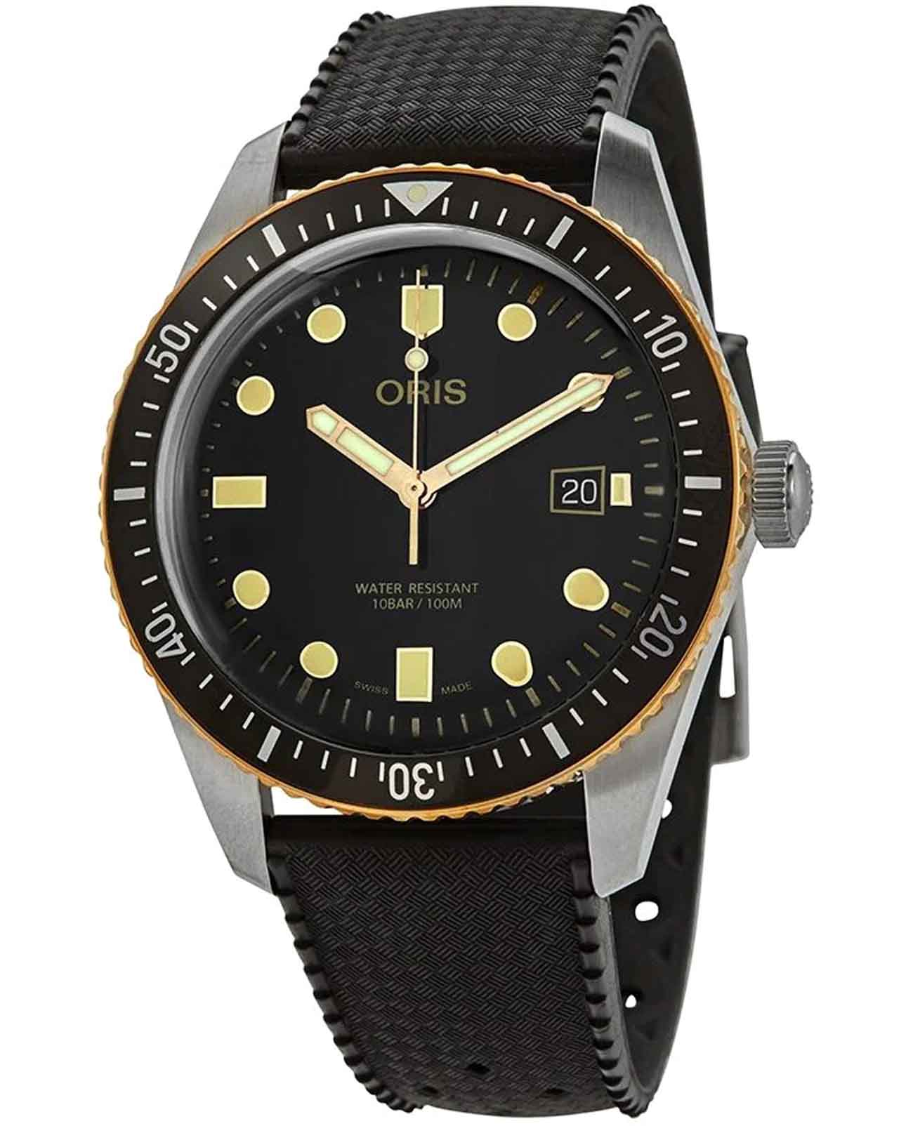 Oris 01 733 7720 4354-07 4 21 18 Divers Sixty-Five – это часы, сочетающие в себе классический дизайн и современную функциональность. Корпус из нержавеющей стали диаметром 42 мм идеально подходит для тех, кто ценит утонченность и стиль. Сапфировое стеклоСапфировое стеклоПрочный и надёжный материал из кристалла сапфира синтетического происхождения, характеризующийся особой твёрдостью и устойчивостью к царапинам и повреждениям. с антибликовым покрытием защищает циферблат от царапин и обеспечивает отличную читаемость при любом освещении. Каучуковый браслет на стандартной застёжке идеально дополняет дизайн часов, обеспечивая комфортное ношение. Стрелки и метки с люминесцентным покрытиемЛюминесцентное покрытиеПозволяет считывать показания времени в темноте. Производители наносят на стрелки, часовые индексы, безель или поверхность циферблата светонакопительный состав, дающий холодное свечение. позволят следить за временем даже в полной темноте. Вращающийся безельБезельВнешний ободок, закрепляющий стекло. В спортивных часах так называется поворотное кольцо с делениями на циферблате, выполняет роль таймера – замеряет отрезки времени на шкале. Неподвижный безель – элемент декора. Однонаправленно вращающийся безель на дайверских часах позволяет фиксировать моменты погружения и выныривания на поверхность. с бронзовым поворотным кольцом. Часы оснащены центральной секундной стрелкой и окошком даты в положении «6 часов», что делает их функциональными для повседневного использования. Автоматический механизм на базе калибра 733 с 38-часовым запасом хода. Часы обладают водонепроницаемостью в 10 бар (100 метров). Механизм с автоподзаводом, скрытый внутри, является сердцем этих часов, гарантируя безупречную работу на протяжении многих лет.