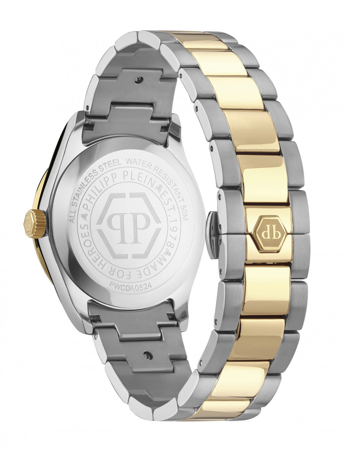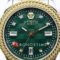 Часы Philipp Plein PWCDA0524 из коллекции Queen сочетают элегантность и функциональность. Корпус диаметром 38 мм выполнен из нержавеющей стали, придающим изделию роскошный вид. Зеленый циферблат украшен фирменным логотипом бренда в виде черепа на отметке 12 часов. БезельБезельВнешний ободок, закрепляющий стекло. В спортивных часах так называется поворотное кольцо с делениями на циферблате, выполняет роль таймера – замеряет отрезки времени на шкале. Неподвижный безель – элемент декора. Однонаправленно вращающийся безель на дайверских часах позволяет фиксировать моменты погружения и выныривания на поверхность. с IP-покрытиемIP-покрытиеМетод ионного напыления. Демонстрирует повышенную устойчивость к истиранию, окислению и химическим веществам. Под воздействием высокого давления и температуры около 1500°C молекулы металла надёжно соединяются с частицами корпуса часов..