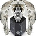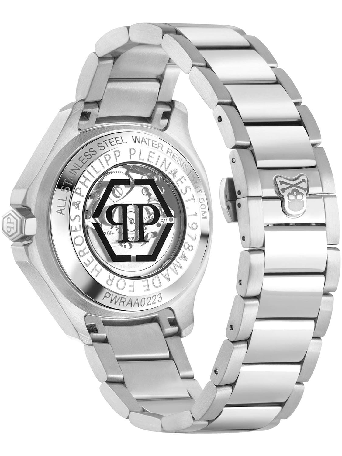 Яркие мужские часы с минеральным стекломМинеральное стеклоМинеральное стекло представляет собой искусственно выращенный минерал кварца. Такое стекло отличается особой устойчивостью к повреждениям и царапинам. Уступает по некоторым качествам сапфировому стеклу. Philipp Plein PWRAA0223, механический механизм с автоподзаводом.  Класс водозащиты: 50 метров, позволит защитить корпус от случайных брызг или капель дождя. Корпус часов изготовлен из стали. Стрелки и метки с люминесцентным покрытиемЛюминесцентное покрытиеПозволяет считывать показания времени в темноте. Производители наносят на стрелки, часовые индексы, безель или поверхность циферблата светонакопительный состав, дающий холодное свечение.. Скелетонизированные. Часы с механизмом, из которого удалён весь «лишний» металл, с прозрачными циферблатом и задней крышкой. Застёжка бабочка с кнопкамиЗастёжка "бабочка"Такой вид застёжки дополняется предохранителями, помогающими избежать случайного раскрытия браслета. Обладают изящным исполнением.