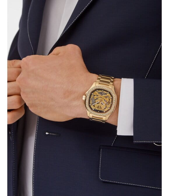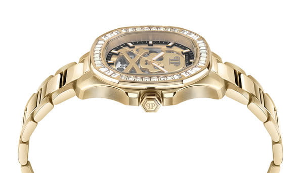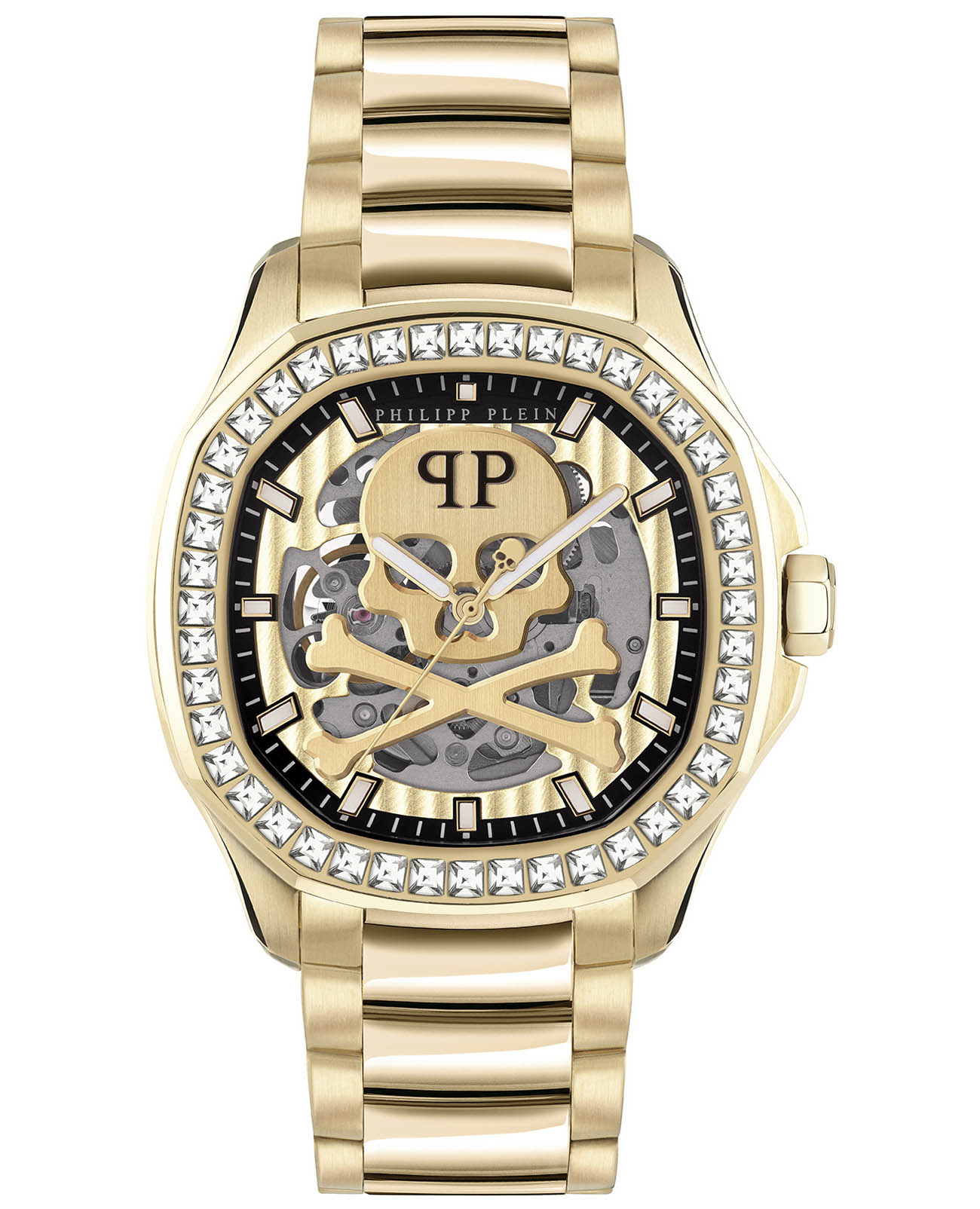 Механические мужские часы-скелетоны с минеральным стекломМинеральное стеклоМинеральное стекло представляет собой искусственно выращенный минерал кварца. Такое стекло отличается особой устойчивостью к повреждениям и царапинам. Уступает по некоторым качествам сапфировому стеклу. Philipp Plein Plein Philipp PWRAA0723, механический механизм с автоподзаводом. Класс водозащиты: 50 метров, позволит защитить корпус от случайных брызг или капель дождя. Корпус часов изготовлен из стали с IP-покрытиемIP-покрытиеМетод ионного напыления. Демонстрирует повышенную устойчивость к истиранию, окислению и химическим веществам. Под воздействием высокого давления и температуры около 1500°C молекулы металла надёжно соединяются с частицами корпуса часов.. Стрелки и метки с люминесцентным покрытиемЛюминесцентное покрытиеПозволяет считывать показания времени в темноте. Производители наносят на стрелки, часовые индексы, безель или поверхность циферблата светонакопительный состав, дающий холодное свечение.. Часы с механизмом, из которого удалён весь «лишний» металл, с прозрачными циферблатом и задней крышкой. Стальной браслет на застёжке-бабочке с кнопкамиЗастёжка "бабочка"Такой вид застёжки дополняется предохранителями, помогающими избежать случайного раскрытия браслета. Обладают изящным исполнением. с IP-покрытиемIP-покрытиеМетод ионного напыления. Демонстрирует повышенную устойчивость к истиранию, окислению и химическим веществам. Под воздействием высокого давления и температуры около 1500°C молекулы металла надёжно соединяются с частицами корпуса часов.. БезельБезельВнешний ободок, закрепляющий стекло. В спортивных часах так называется поворотное кольцо с делениями на циферблате, выполняет роль таймера – замеряет отрезки времени на шкале. Неподвижный безель – элемент декора. Однонаправленно вращающийся безель на дайверских часах позволяет фиксировать моменты погружения и выныривания на поверхность. инкрустирован кристаллами.