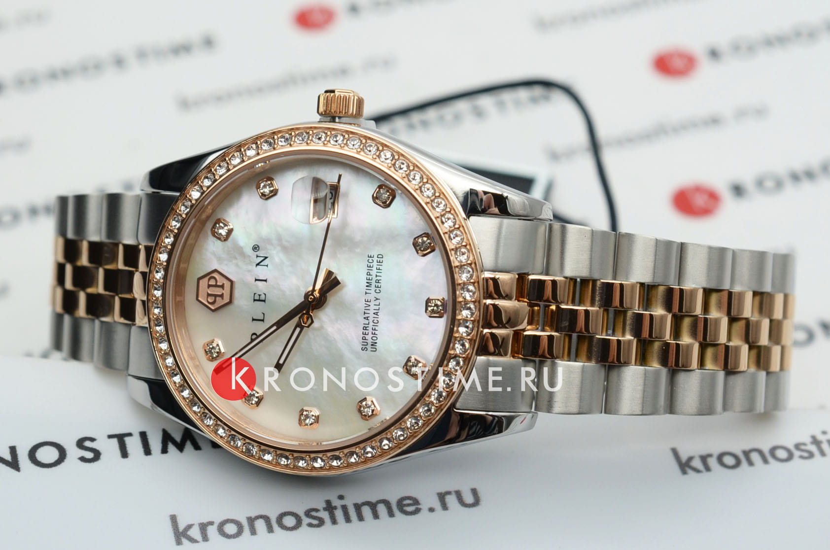 Яркие женские часы Philipp Plein Date Superlative PWYAA0223 c с минеральным стекломМинеральное стеклоМинеральное стекло представляет собой искусственно выращенный минерал кварца. Такое стекло отличается особой устойчивостью к повреждениям и царапинам. Уступает по некоторым качествам сапфировому стеклу.. Особенные часы для особенных женщин! Ослепительный аксессуар, демонстрирующий роскошь и изысканность.Часы с круглым стальным корпусом с IP-покрытиемIP-покрытиеМетод ионного напыления. Демонстрирует повышенную устойчивость к истиранию, окислению и химическим веществам. Под воздействием высокого давления и температуры около 1500°C молекулы металла надёжно соединяются с частицами корпуса часов.. Перламутровый циферблат с метками в виде точек, украшенных кристаллами. Люминесцентное покрытиеЛюминесцентное покрытиеПозволяет считывать показания времени в темноте. Производители наносят на стрелки, часовые индексы, безель или поверхность циферблата светонакопительный состав, дающий холодное свечение. стрелок. Окошко даты с увеличительным стеклом находится в положении 3 часа. Рифленая заводная головка. Стальной браслет на застёжке бабочка с кнопкамиЗастёжка "бабочка"Такой вид застёжки дополняется предохранителями, помогающими избежать случайного раскрытия браслета. Обладают изящным исполнением.