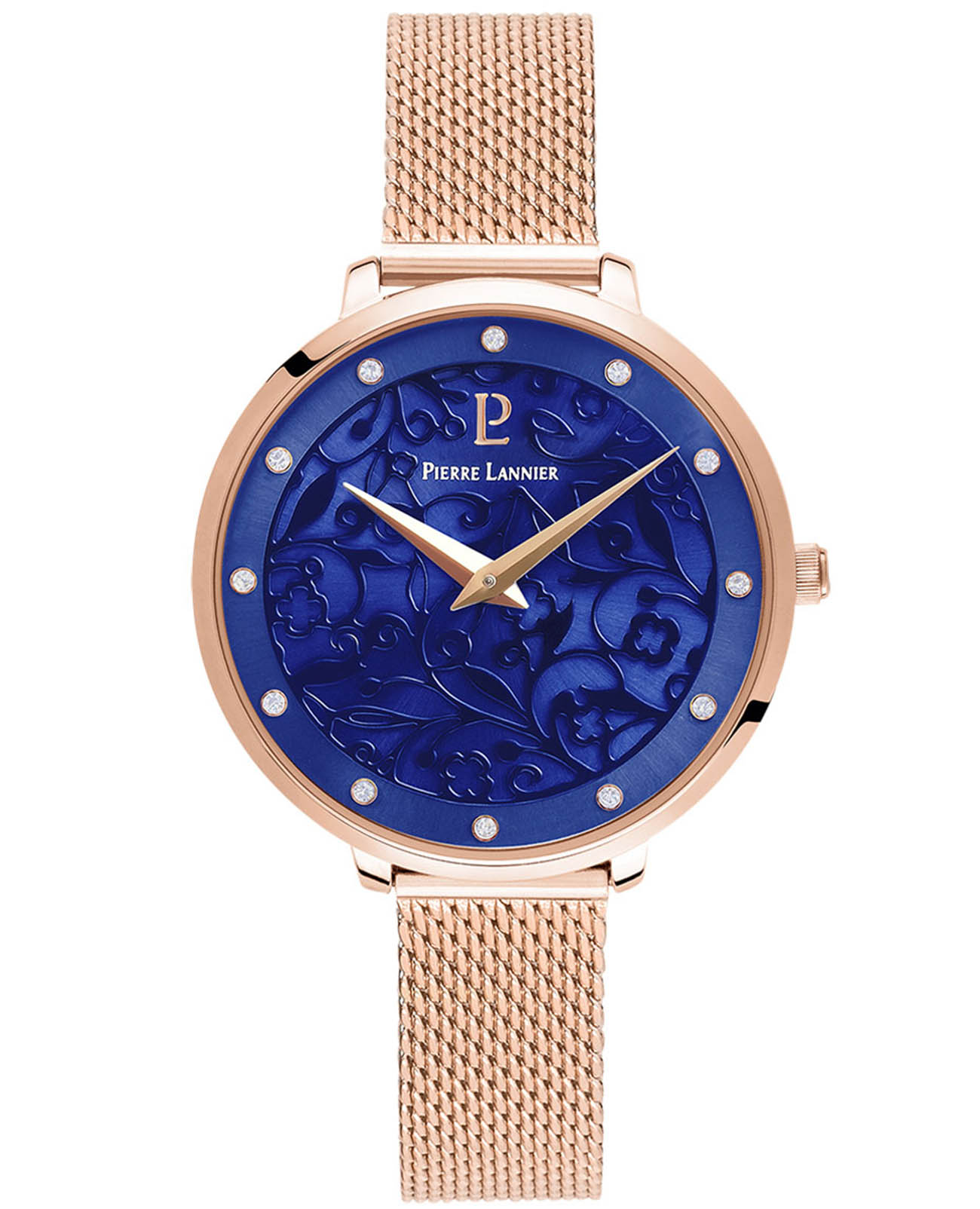 Женские кварцевые часы Pierre Lannier Eolia 039L968. Минеральное стеклоМинеральное стеклоМинеральное стекло представляет собой искусственно выращенный минерал кварца. Такое стекло отличается особой устойчивостью к повреждениям и царапинам. Уступает по некоторым качествам сапфировому стеклу. устойчивое к мелким механическим повреждениям. Центральные часовая и минутная стрелки. Циферблат синего цвета. Корпус выполнен из полированной нержавеющей стали с PVD-покрытиемPVDУльтратонкое покрытие наносится в технике вакуумного напыления, сочетает в себе нитрид титана особой прочности со слоем золота или оксида хрома. Несёт в себе декоративную или защитную функцию.. Диаметр корпуса 33 мм. Браслет миланского плетения, выполнен из нержавеющей стали с PVD-покрытиемPVDУльтратонкое покрытие наносится в технике вакуумного напыления, сочетает в себе нитрид титана особой прочности со слоем золота или оксида хрома. Несёт в себе декоративную или защитную функцию.. Водозащита WR 50. Часы украшены кристаллами.