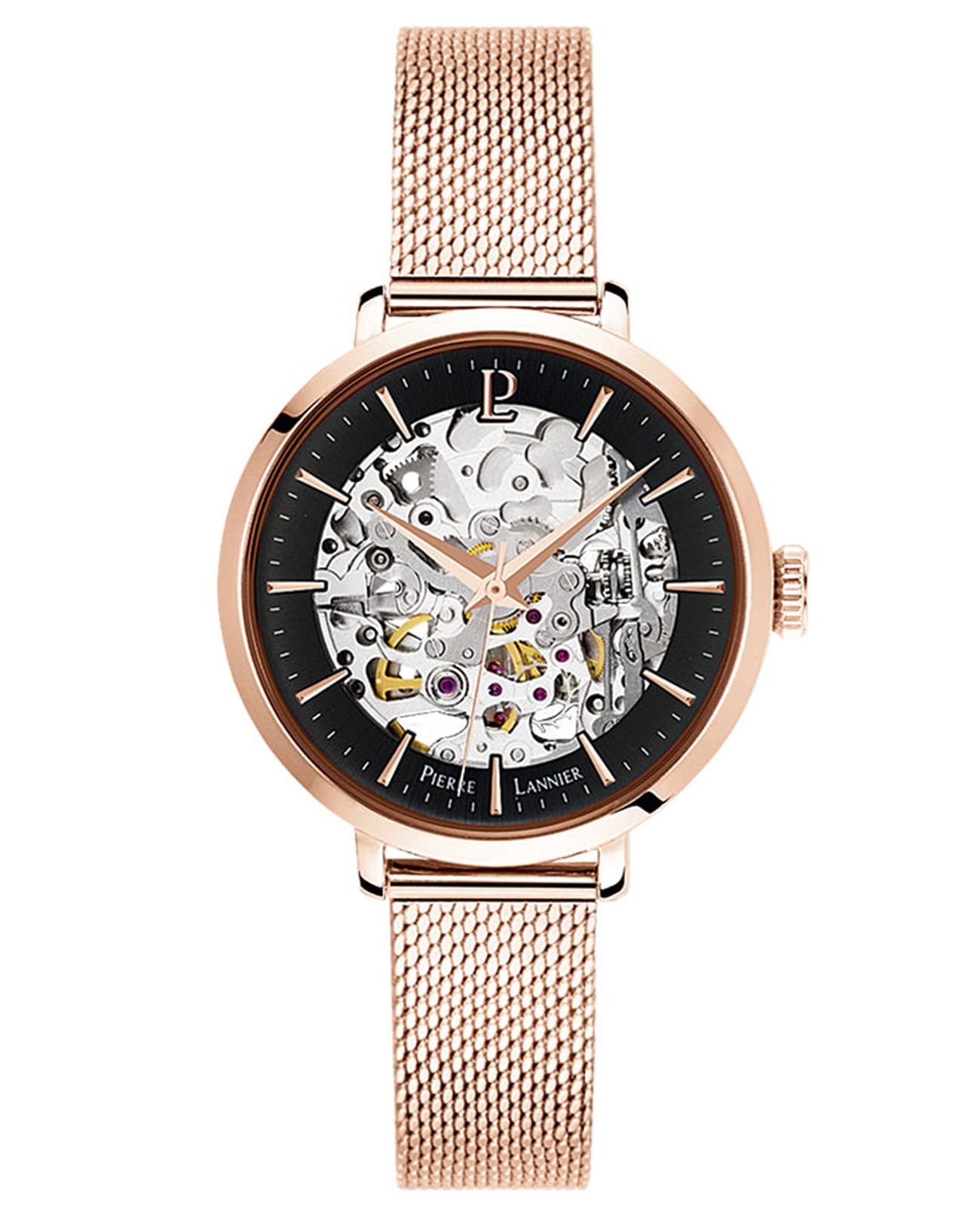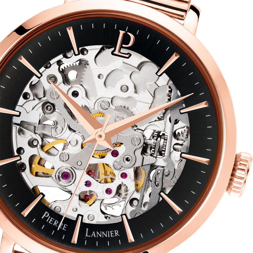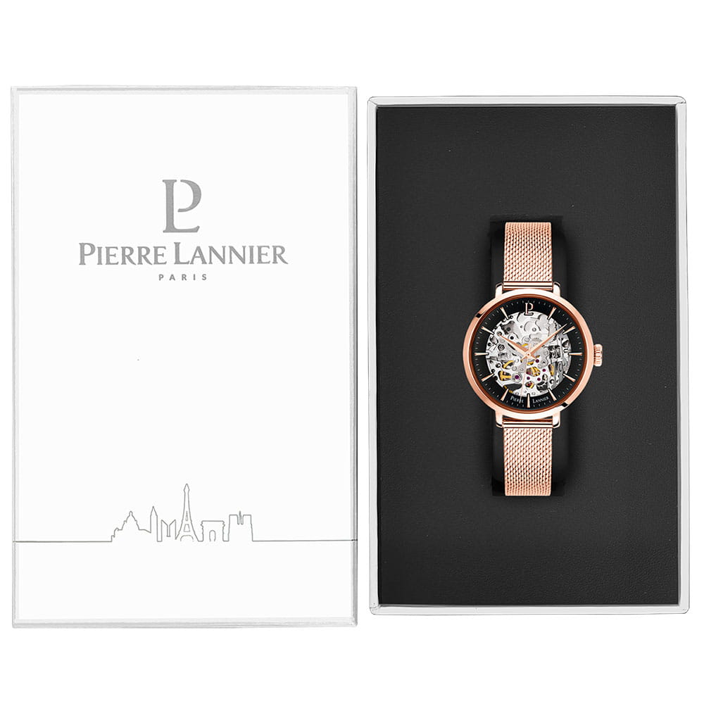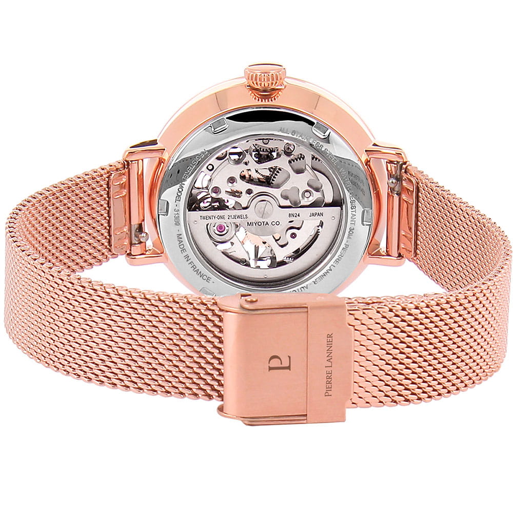 Женские механические часы с автоподзаводом Pierre Lannier Automatic 313B938. Минеральное стеклоМинеральное стеклоМинеральное стекло представляет собой искусственно выращенный минерал кварца. Такое стекло отличается особой устойчивостью к повреждениям и царапинам. Уступает по некоторым качествам сапфировому стеклу. устойчивое к мелким механическим повреждениям. Скелетонизированный циферблат с золотистыми стрелками и часовыми метками. Центральные часовая, минутная и секундная стрелки. Круглый корпус выполнен из полированной нержавеющей стали с PVD-покрытиемPVDУльтратонкое покрытие наносится в технике вакуумного напыления, сочетает в себе нитрид титана особой прочности со слоем золота или оксида хрома. Несёт в себе декоративную или защитную функцию. цвета розового золота. Диаметр корпуса составляет 35 мм, толщина 12 мм. Стальной браслет с покрытием выполнен шириной 14 мм в технике миланского плетения, раскладная застёжкаРаскладная застёжкаТакой тип застёжки используется только на браслетах из металла. Она никогда не раскрывается полностью, происходит разделение на 2 и более частей. Раскладывающая застёжка снизит вероятность потери часов к минимуму.. Неподвижный безельБезельВнешний ободок, закрепляющий стекло. В спортивных часах так называется поворотное кольцо с делениями на циферблате, выполняет роль таймера – замеряет отрезки времени на шкале. Неподвижный безель – элемент декора. Однонаправленно вращающийся безель на дайверских часах позволяет фиксировать моменты погружения и выныривания на поверхность. из нержавеющей стали с PVD-покрытиемPVDУльтратонкое покрытие наносится в технике вакуумного напыления, сочетает в себе нитрид титана особой прочности со слоем золота или оксида хрома. Несёт в себе декоративную или защитную функцию. цвета розового золота. Водостойкость: 30 метров, позволит защитить корпус от случайных брызг или капель дождя.
